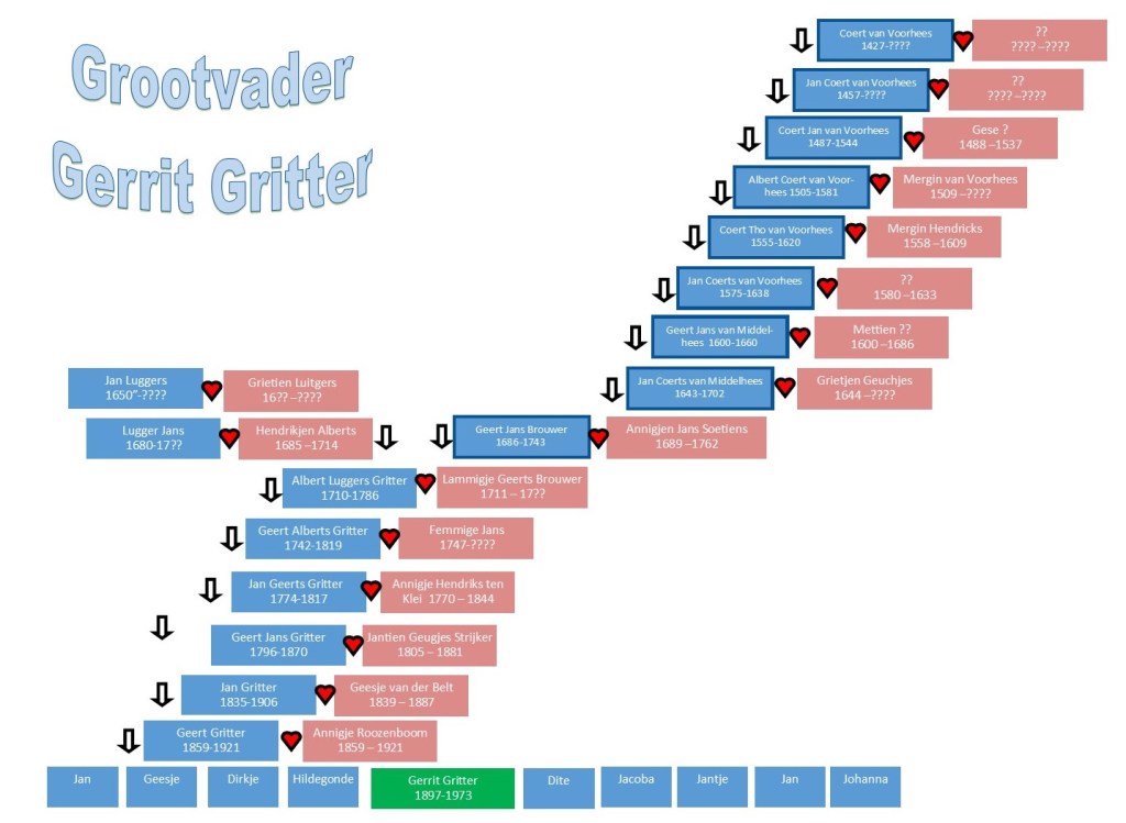 Genoemde Jan trouwde Geesje van den Belt (1839-1887). Daaruit werd Geert Gritter (1859-1921) geboren die in 1885 trouwde met Annige Roozeboom (1859-1921). Die twee zaten niet stil en produceerden 10 Grittertjes. Jan 1 (geboren en overleden 1886), Jan 2, Geesje, Dirkje, Hildegonda, Dite, Jacoba, Jantje, Johanna en Gerrit (1897-1973). Die laatste was mijn opa aan vaders kant.