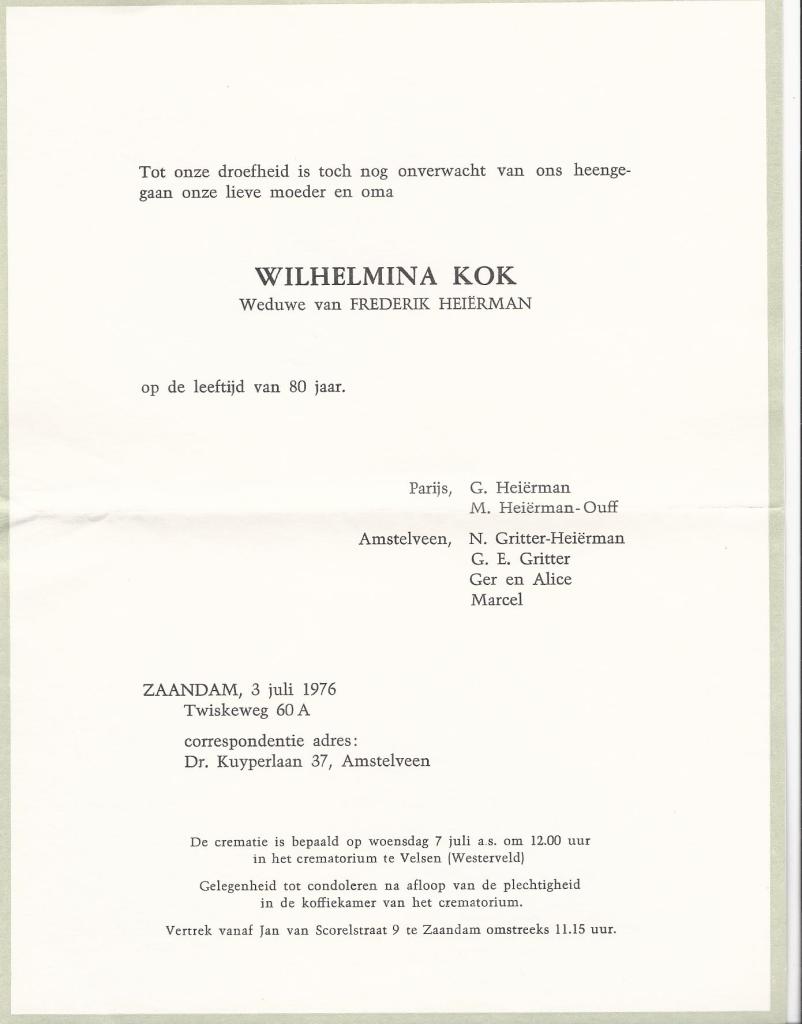 Aal Kok (1886-?) was een zus van mijn oma en een oudtante van mij. Zij was niet getrouwd, maar woonde samen. Voor die tijd best vooruitstrevend. Zij woonde aan de Bos en Lommerweg in Amsterdam. Ik herinner mij hoge steile trappen om boven te komen. Er waren twee dochters die de naam van hun moeder kregen, Ali en Neeltje (Nel) Kok (1926-2019). Ali was een struise vrouw die ons regelmatig bezocht. Ze was postbode in Amsterdam. Ze had jarenlang een buitenlandse vriend waar ze veel over vertelde, maar tot een vaste relatie is het nooit gekomen. Later verhuisde zij naar Middenmeer. Ze bleef altijd vrijgezel. De andere dochter Nel trouwde met Eelke Westra (1920-2000). Als kind leerde ik Eelke en Nel kennen als eigenaren van een melkhandel in de Jordaan. Ik kwam daar regelmatig. Wat mij is bijgebleven dat deze Nel altijd het lied Que Sera Sera van Doris Day zong. Na het overlijden van mijn moeder werd zij de vaste vriendin van mijn vader. Nel kreeg dochters Lida en Thea en zoon Ed (Eeltje – 1954-2013). Ik speelde met enige regelmaat met dit trio. Na ze jaren uit het oog te hebben verloren, kwamen Thea en Lida door de vriendschap van mijn vader met Nel uit Middenmeer weer in beeld. Ed is inmiddels overleden.