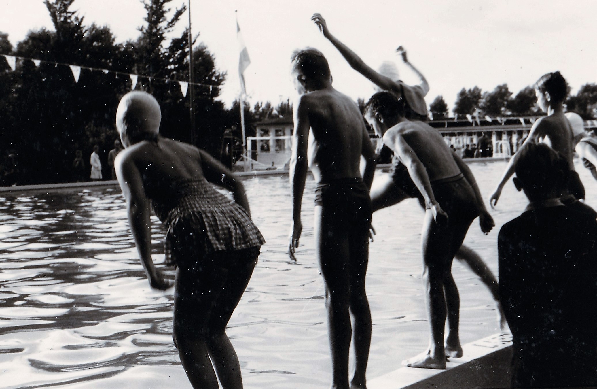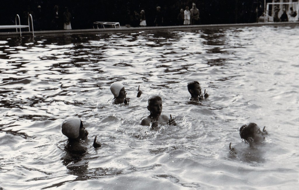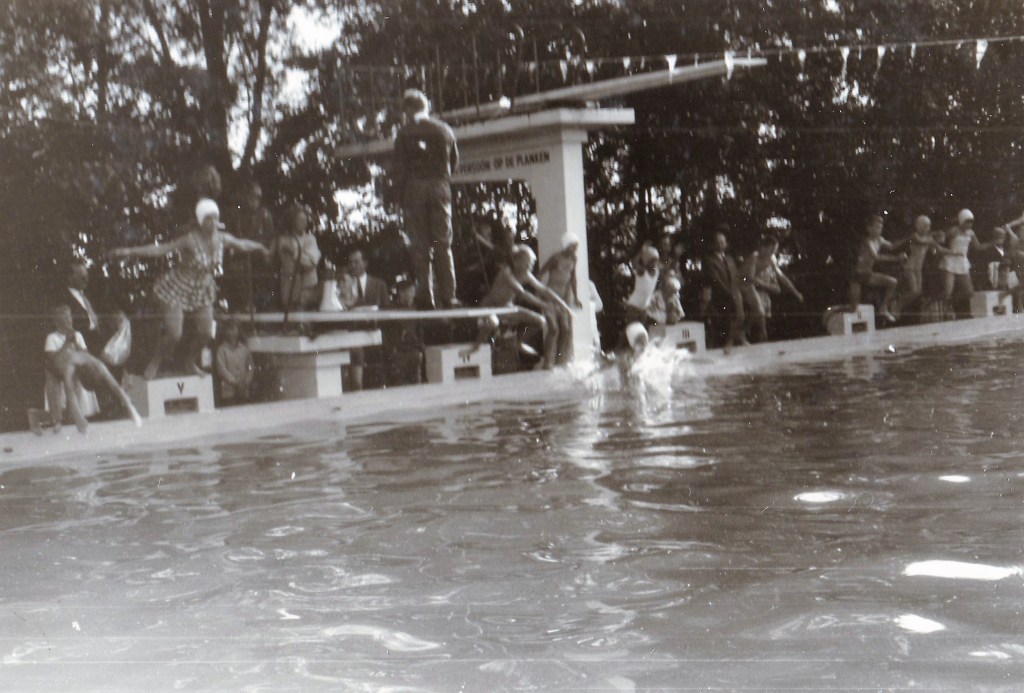 Zwemlessen volgen betekende elke dag vroeg op, want je had vijf dagen per week les van 7.00 tot 7.30 uur. Het begon al in het voorjaar en het was verschrikkelijk koud. Bij binnenkomst stond er altijd zo’n bemoedigend bordje met een watertemperatuur van rond de 16 graden. Brrrrr! Je kwam er echt bijna blauw weer vandaan. Vaak was ik pas laat in de ochtend op school weer een beetje op temperatuur. Uit solidariteit en ter aanmoediging zwom mijn vader elke ochtend mee. Hij in het diepe, terwijl ik de lessen in het ondiepe begon. Toen ik de eerste slagen te pakken had en mij drijvende kon houden, zwommen wij samen in het diepe. Hij achter de drijflijn en ik in de buurt van de zwemhaak. Je leerde het zwemmen wel sneller dan nu. Met elk van mijn kinderen duurde de zwemlestijd toch al gauw een paar jaar (inclusief diploma A en B, etc.). Wij haalden in, pak hem beet, vier maanden het A-diploma. Begonnen in het voorjaar en klaar net voor de zomer. Maar goed, dan had je wel vijf lessen per week. Toen ik mijn diploma had behaald kreeg ik als beloning de fiets van mijn vader. Dat had hij beloofd en die belofte kwam hij na.