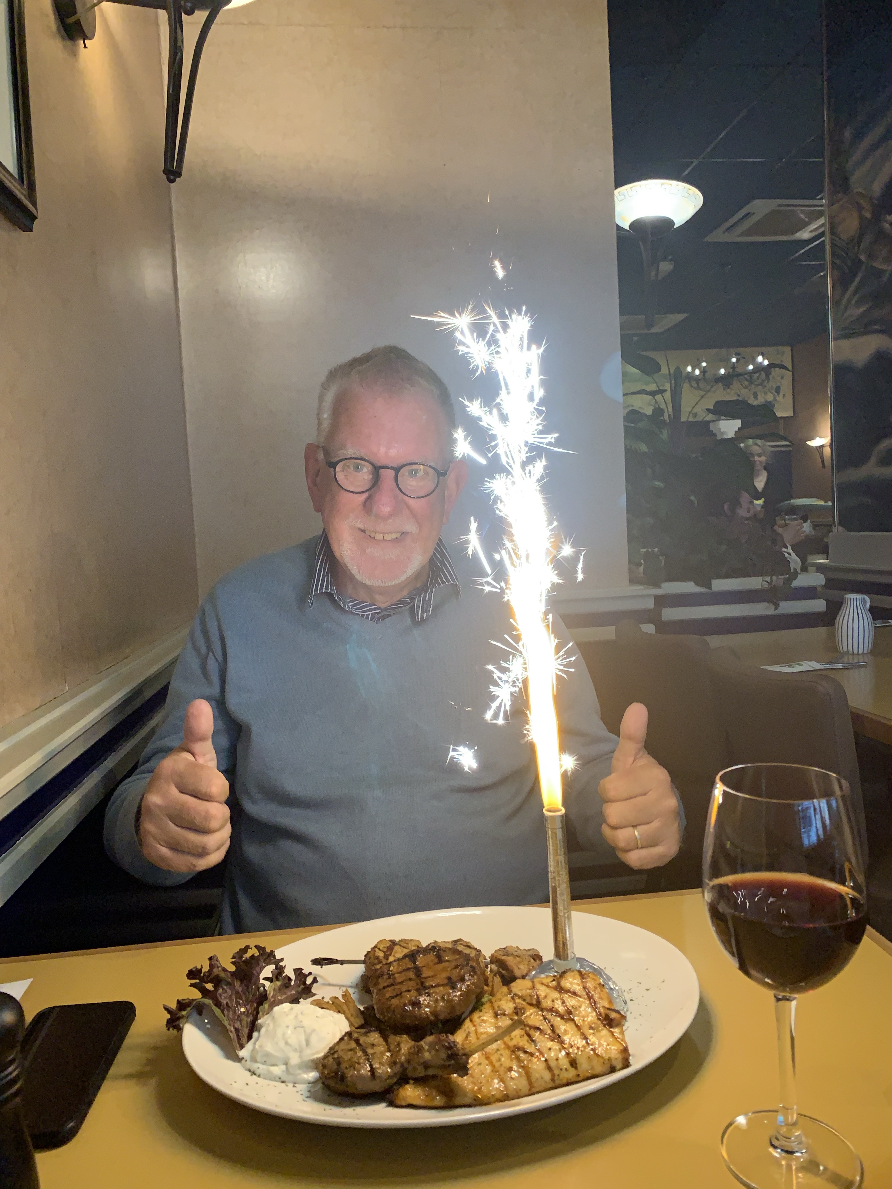 Wij besluiten onze reis met een bezoek aan een fantastische Griek in het centrum van Enschede. Heerlijk. Joyce zorgt zelfs voor vuurwerk. Niet persoonlijk hoor (dat kwam later) maar in de vorm van een vuurkaars op mijn bord. Verrassing dus. Was even vergeten dat het buisje kokend was toen ik hem van mijn bord wilde verwijderen. Liep nog net geen verbrande vingers over. Mooie verjaardag al met al. Op naar de 70.
