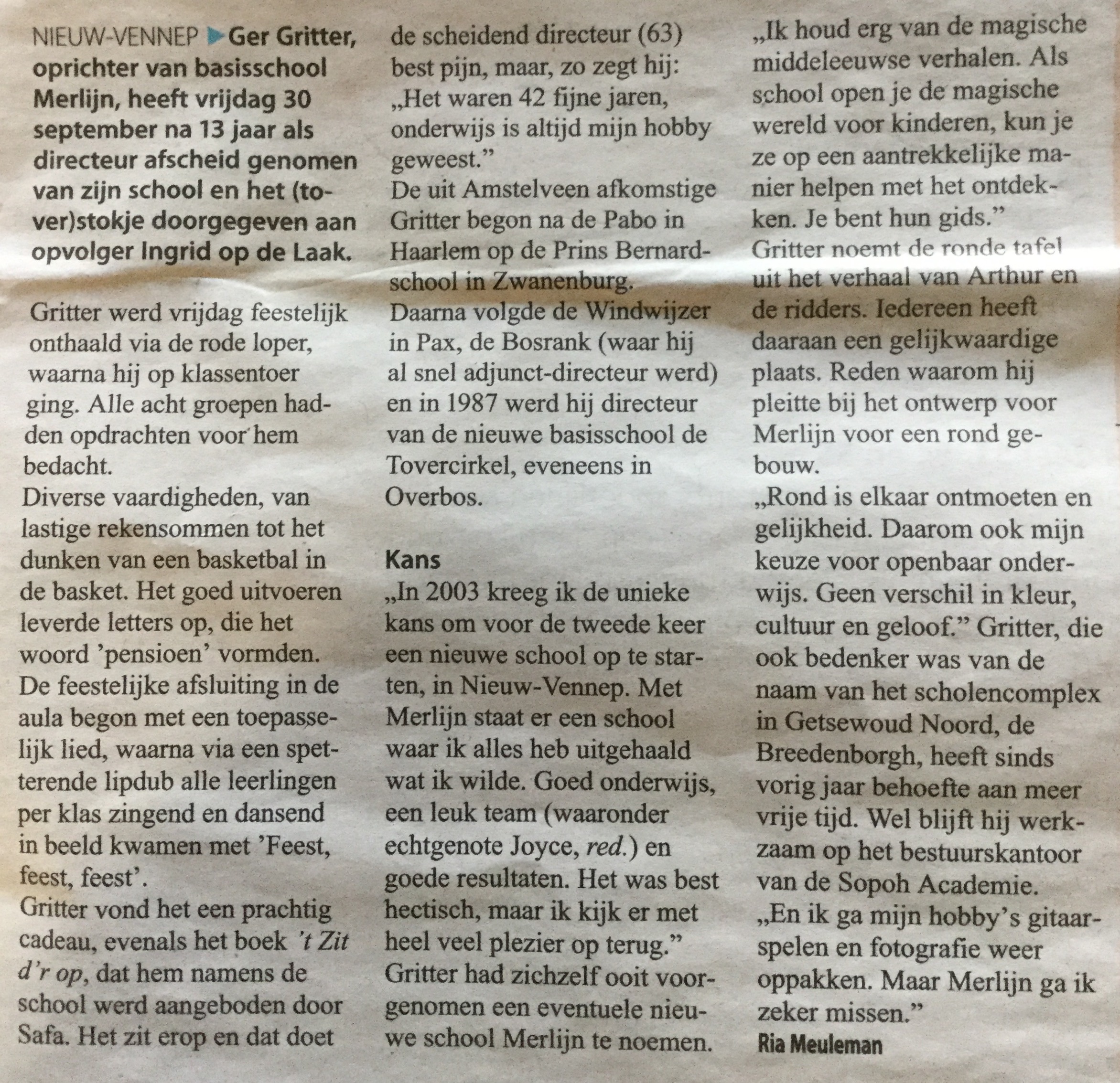 Zes jaar en drie jaar na afscheid: Deze maand is het alweer zes jaar geleden dat ik afscheid nam als directeur van mijn school Merlijn. Wat vliegt de tijd. In het begin vroeg ik mij geregeld af of ik er verstandig aan had gedaan het schoolwerk te stoppen. Maar na een tijdje merkte ik dat er een berg stress wegviel en ik steeds meer de rustige persoon werd die ik ooit was. Ik besefte toen pas dat ik als schoolleider bijna 30 jaar 24/7 aan had gestaan. Ik deed het graag, maar had niet gemerkt dat je verandert.