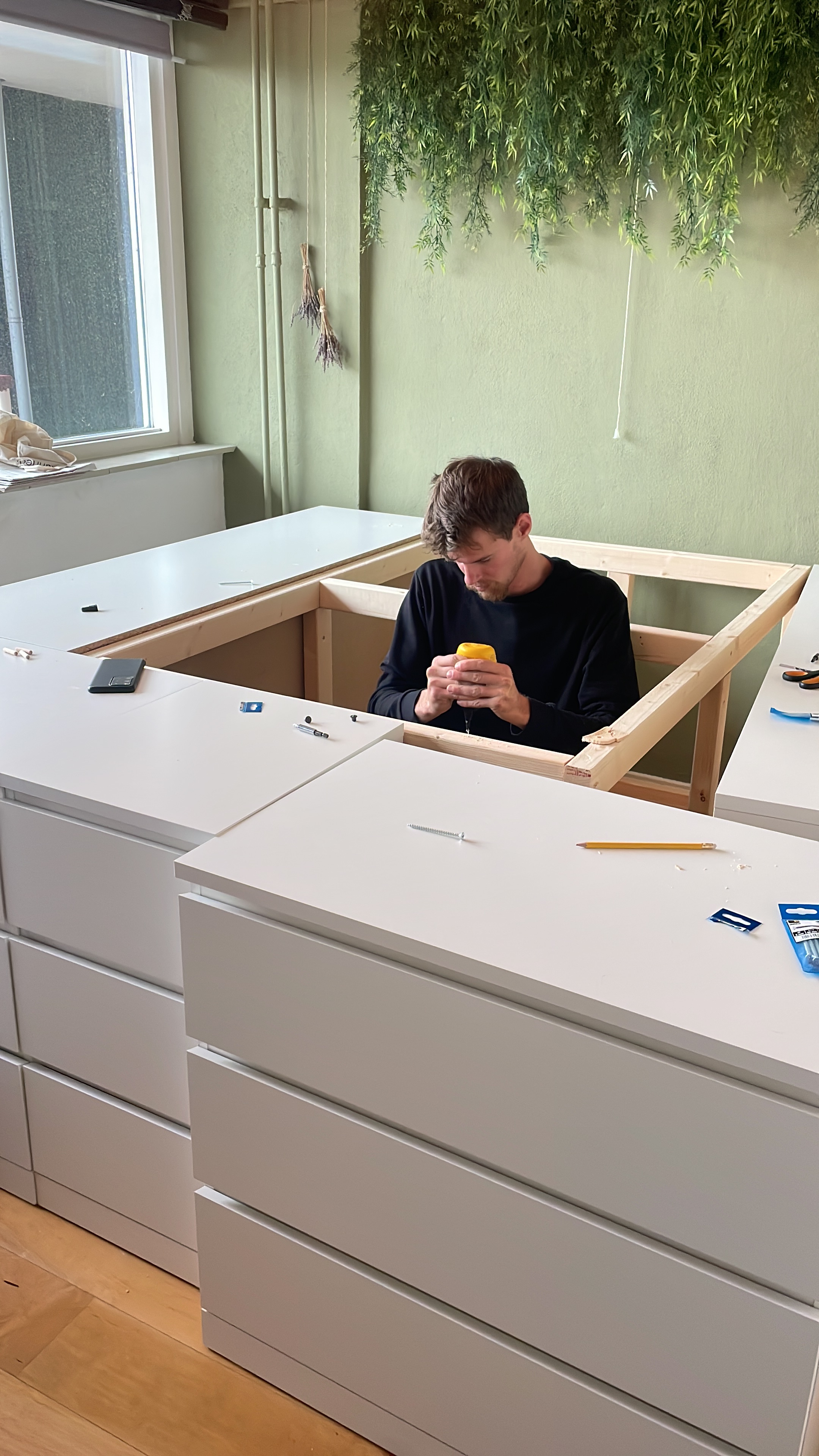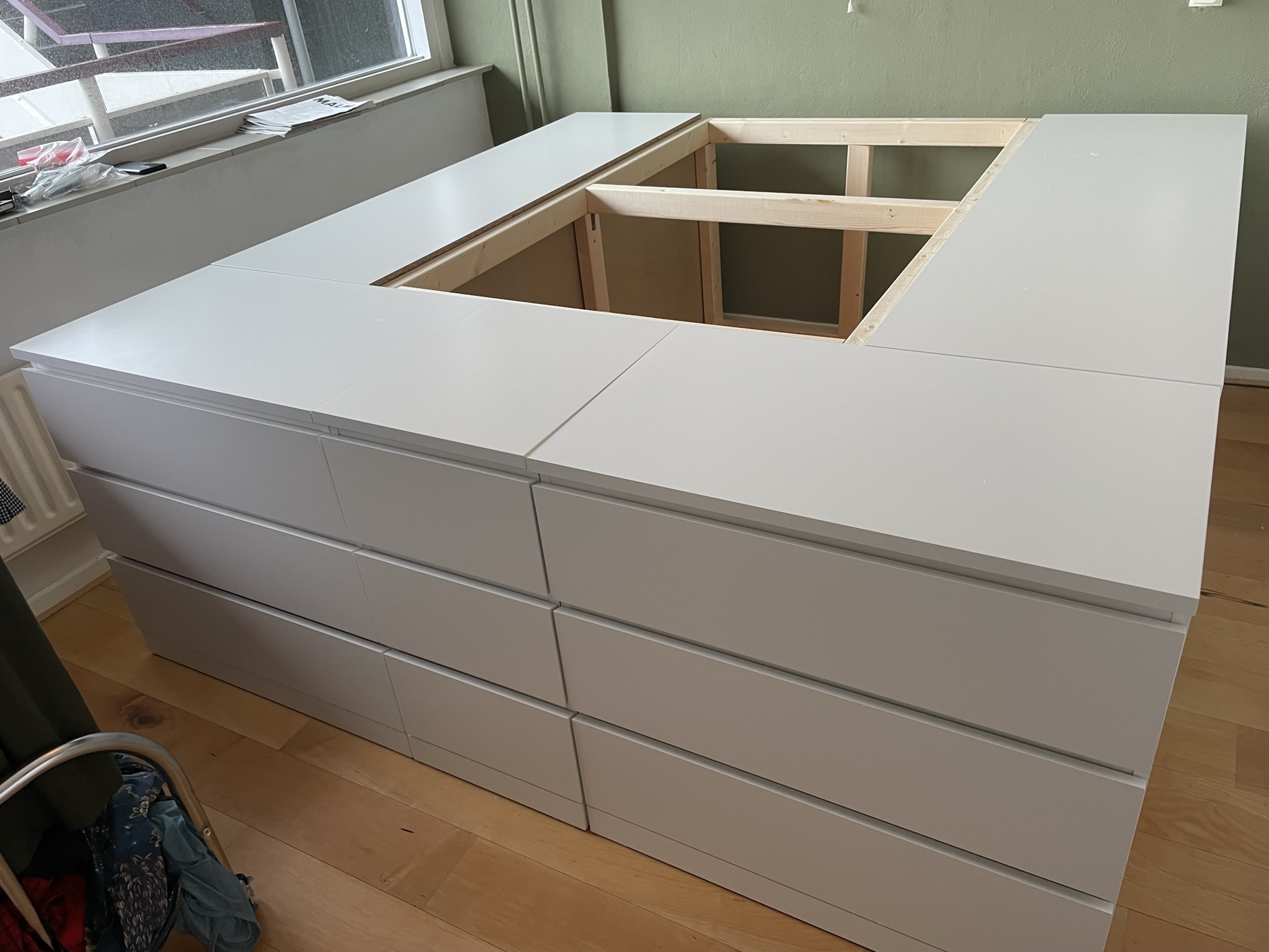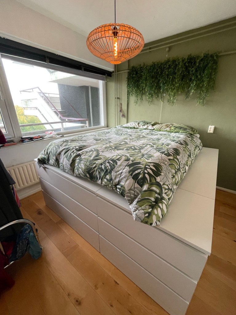 Vader-zoon klus: Deze week vier dagen samen met Jasper gewerkt aan een verhoogd bed. Jasper woont sinds kort samen met zijn vriendin Claudia in Amsterdam. Leuk appartement met uitzicht op de Sloterplas. Niet supergroot en dat gaf een opbergprobleem voor kleding en andere spullen. Het appartement telt één slaapkamer met net genoeg ruimte voor een tweepersoonsbed. De oplossing waaraan wij deze week hebben gewerkt is een verhoogd bed op Malm-kasten van Ikea. Allereerst hebben wij vijf kasten opgehaald met maar liefst 21 laden aan bergruimte. Was nog een heel gedoe, want aanhanger nodig. Diverse keren heen en weer moeten rijden want de aanhanger moest ook weer terug en één van de pakketten bleek niet te kloppen. Klantenservice bij Ikea is een ramp qua wachttijd. Je staat zomaar een uur in de rij, want iedereen heeft zo zijn in- of omruilverhaal en dat kost tijd voor Ikea akkoord gaat. Al met al kostte het halen, brengen, karretje huren en ruilen zomaar een dag. In ons geval betrof het verkeerd gelamineerde latten. Een onsympathiek en stugge medewerker van Ikea bleef maar volhouden dat het zo hoorde. (“Ik heb als Ikea medewerker al tientallen Malm-kasten in elkaar gezet en ze zijn allemaal zo”). Nu heb ik inmiddels de laatste jaren ook zo’n 10 Malm-kasten in elkaar gezet en weet ik dat het niet zo hoort. Net zolang blijven volharden tot deze mijnheer een nieuw pakket wilde openen om zijn gelijk te bewijzen. En wat bleek, ik had dus gelijk. Maar een excuus kon er niet af. Vervolgens nog drie dagen gewerkt aan monteren en het maken van een stevig binnen-frame, want er moet op geslapen worden en dus wat kracht kunnen verdragen. Maar op dag vier was het af en waren wij uitermate tevreden over het resultaat. Onder de matras twee kubieke meter ruimte voor van alles wat je niet meteen nodig hebt en met de 21 laden nog eens 1,5 kuub aan bergruimte voor kleding. Wat nog rest is een hoofdbord en een grote matras die het geheel bedekt. Maar voorlopig kan er weer geslapen worden. Het leuke van dit project was voor mij het samen doen. Een vader en zoon momentje, waarin je samen aan iets moois werkt. Vorig jaar twee slaapkamers opgebouwd met dochter Masha en ook dat gaf datzelfde fijne gevoel. Ik kan mij nu al verheugen op de volgende klus, al levert het mijn ouder wordende lijf wel de nodige spierpijn op.