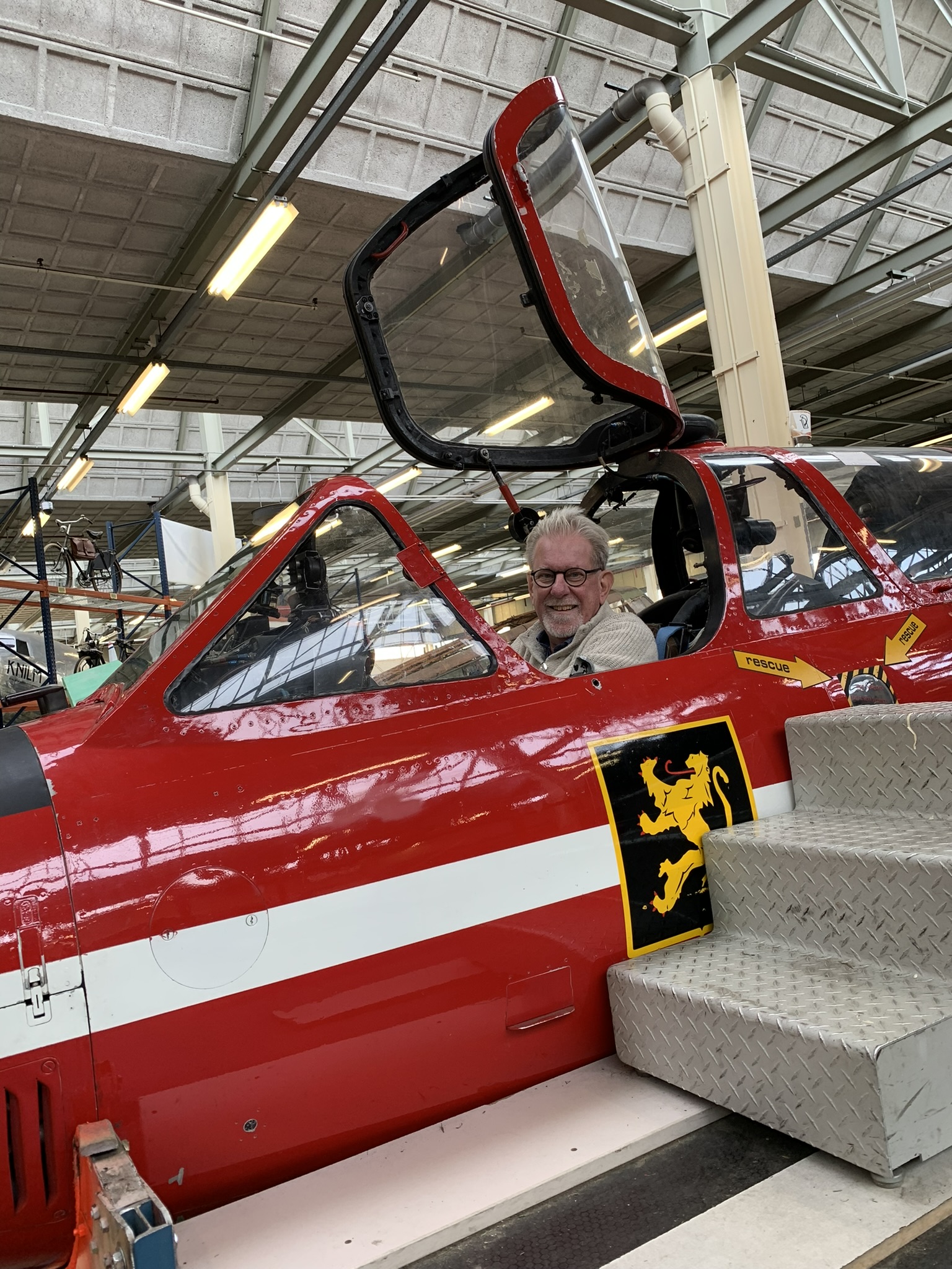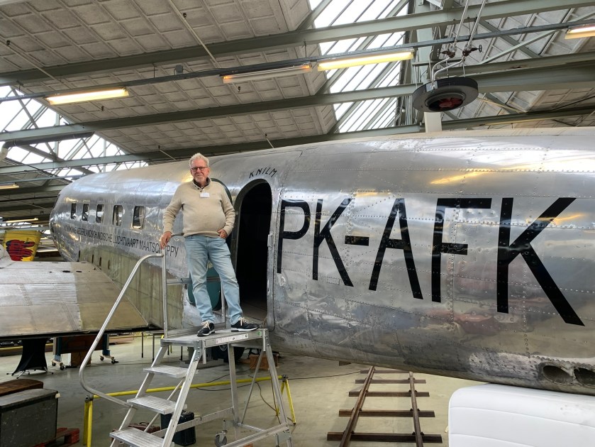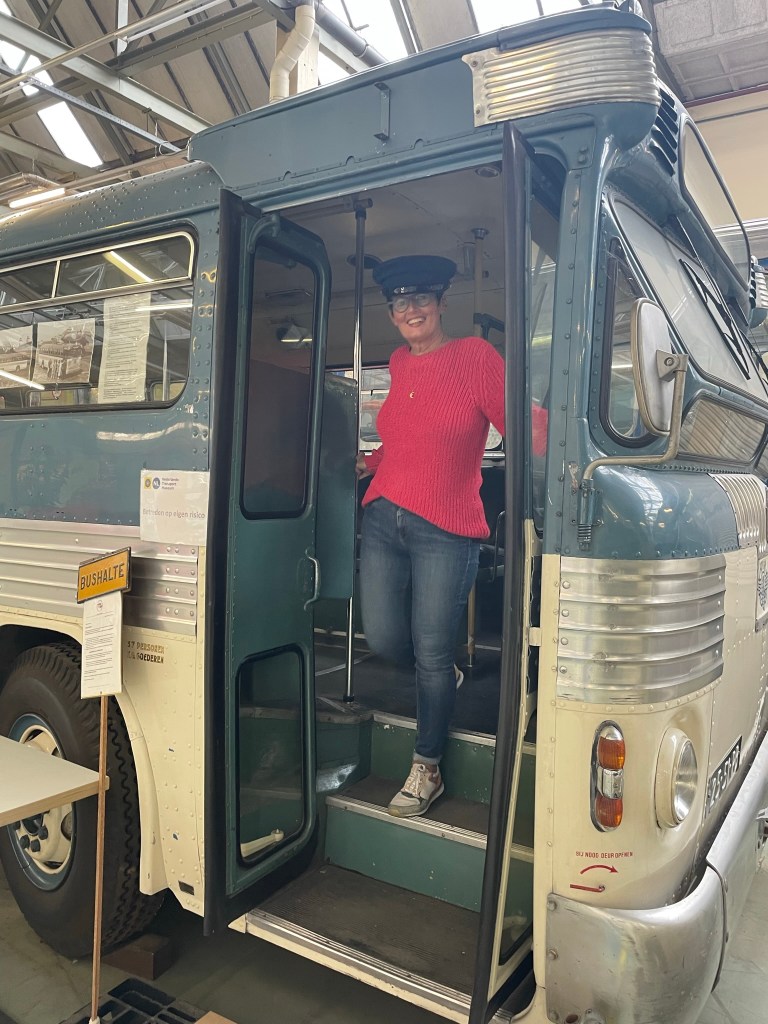 Museum: Vandaag weer een dienst gedraaid als gastheer/rondleider/floormanager. Aan het eind van de dag kwam Joyce nog even aangelopen (dat lukt nog wel met een gekneusd stuitje). Het was niet druk, dus meteen maar een rondleiding gegeven. Natuurlijk wilde Joyce mij op de foto zetten bij de DC 2 (toestel als de Uiver) en in de cockpit van de Franse Fouga Magister (een voormalig lestoestel/jager). Zelf nog even nostalgie in een oude bus van Maarse & Kroon waarvan de bussen in haar jeugd als thuishaven een plek vlakbij haar huis in Aalsmeer hadden.
