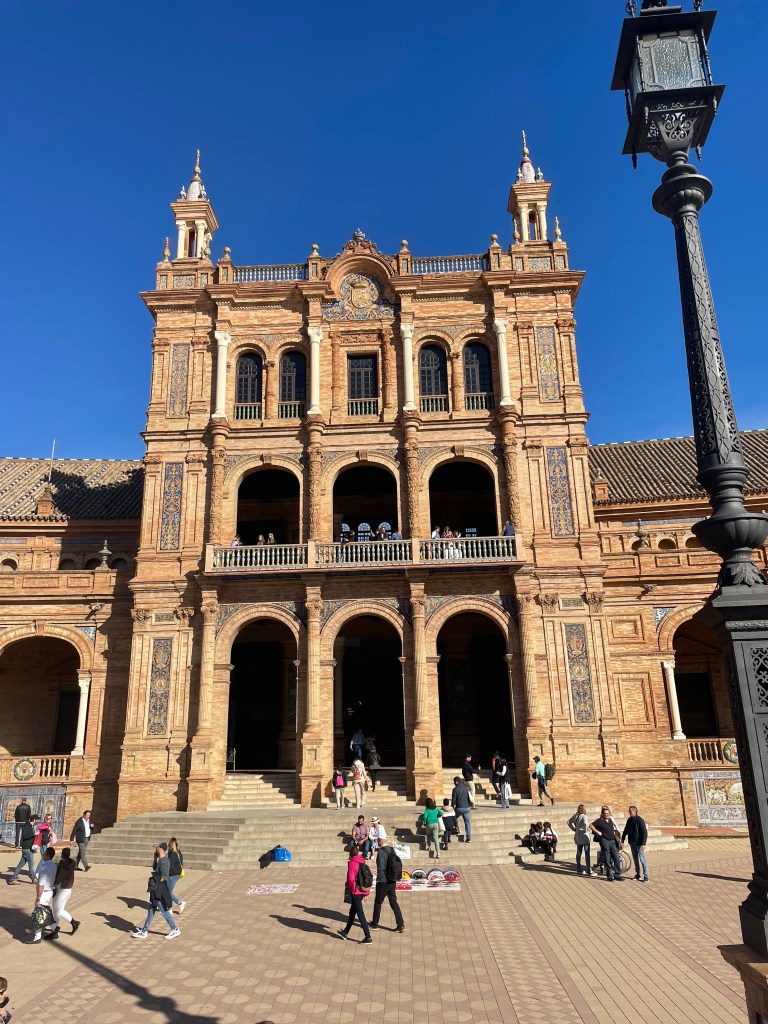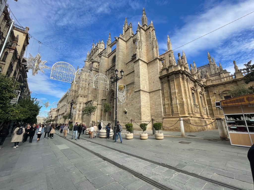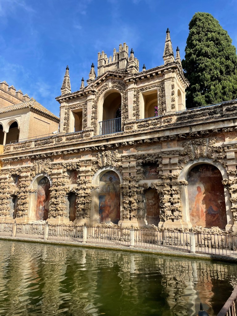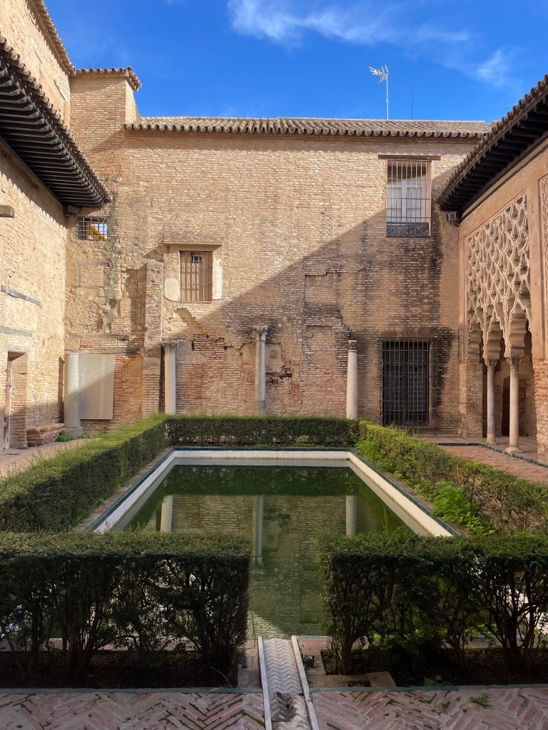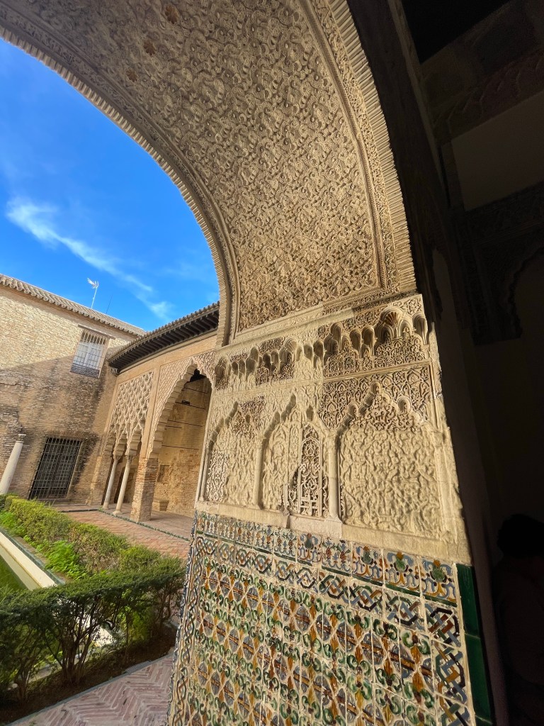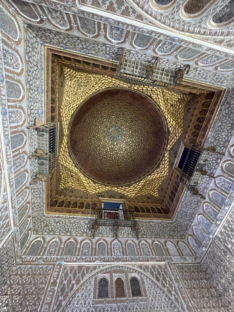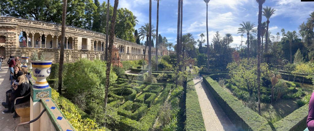 Zondagochtend schijnt het zonnetje weer uitbundig. Metro naar de binnenstad en nog even een terrasje voor koffie en thee. Met de online tickets kunnen wij via skip-the-line snel naar binnen. Mooi paleis, maar een slap aftreksel van het grote Alhambra. Daar waren wij een paar jaar geleden en dat maakte indruk. Dit paleis was gewoon interessant. Alcázar is Spaans voor (versterkt) kasteel en is afgeleid van het Arabische ‘al-qasr’, dat vesting, slot of paleis betekent. De bouw startte in 1364 in opdracht van Koning Peter I van Castilië. Hij gebruikte veel Moorse bouwmeesters, die het rijk versierde paleis een Moors uiterlijk gaven. Latere koningen hebben het paleis verder uitgebreid. Het bezoek neemt al gauw twee uur in beslag. Absoluut de moeite waard. Mooie tuinen ook.