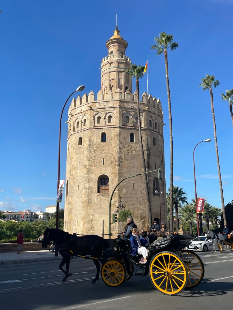 Dag drie (vrijdag) vertrekken wij voor een stedentrip naar Sevilla. De regen komt met bakken uit de lucht. Volgens zwager Erik de eerste regen sinds mei. Had onze lieve heer die regen voor ons niet een weekje kunnen uitstellen? Toch nog 200 kilometer, maar gelukkig hebben wij onze super confortabele BMW. Nabij Sevilla weer prachtig weer. Sevilla blijkt een verschrikkelijke stad qua verkeer. Overal verkeersinfarcten en een oceaan aan verkeerslichten. Hotels met parkeergarages zijn beperkt aanwezig en je betaalt de hoofdprijs voor de auto. Na ons een weg te hebben gebaand door de verkeerschaos, blijkt het hotel van keuze toch volgeboekt te zijn. Wij ontworstelen ons weer aan de stad en kiezen voor een hotel in een buitenwijk. Parkeren geen probleem en naast ons een metrostation. Bagage op de kamer gezet en met de metro in minder dan 15 minuten in de binnenstad van Sevilla. Wij doen een eerste verkenning en sluiten de dag af met een terrasje.