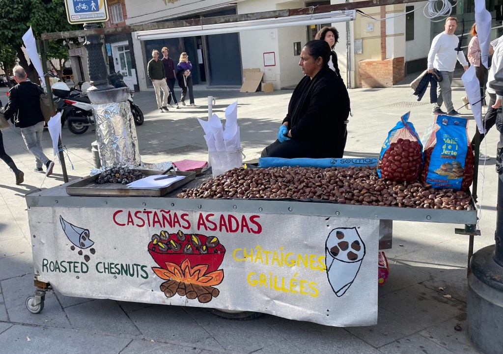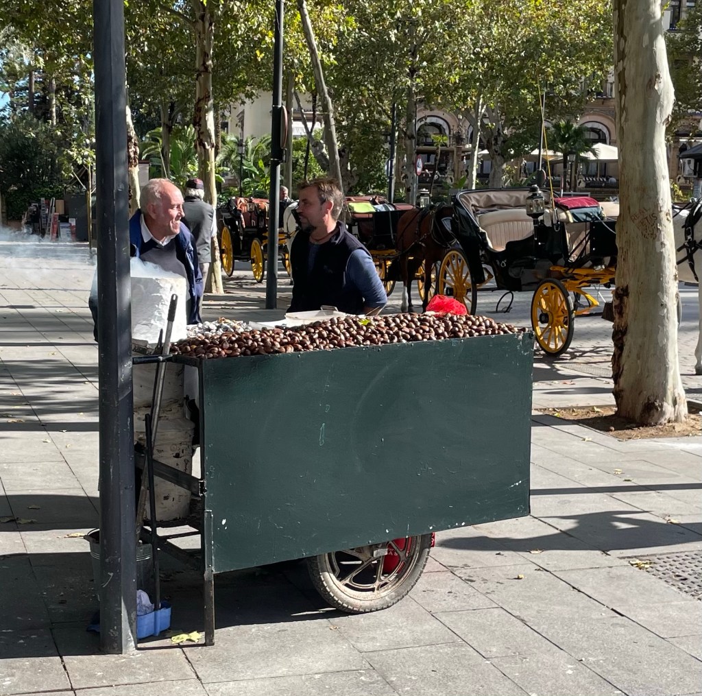 Terwijl de handelaren op de verschillende straathoeken met veel rook hun kastanjes poffen, nemen wij afscheid van Sevilla. Nog een laatste rit met de metro naar het hotel waar de auto staat.