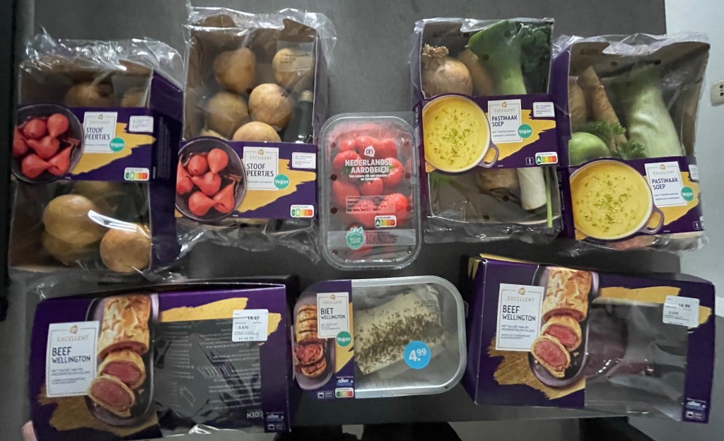 Kerstmaaltijd: Operatie ‘boodschappen inslaan’ is deze week al vroeg gestart, om alle buikjes en buiken van familieleden te vullen die halverwege deze week en tijdens de kerstdagen aanschuiven aan onze kerstdis. Hoogtepunt wordt tweede Kerstdag met kinderen en kleinkinderen. Een Full-House! Het moment dat ik altijd zo bijzonder vind in Amerikaanse films en waar ik emotioneel gezien naar kan verlangen. Familieleden die blij en vol liefde voor elkaar samenkomen. Buiten een sneeuwlandschap en kerstverlichting overal. Uiteraard met opa en oma (lees Joyce en Ger) als blij lachend middelpunt in hun luie stoel onder de kerstboom met op elke knie een kleinkind en de (schoon) dochters in de keuken. Maar dat is film. Ha,ha. Joyce wel in de luie stoel, maar ik met hartslag 140 achter het kookeiland. (geintje, ik wil het zelf en doe het graag). Maar nu ik erover nadenk….! (Ha,ha) Toch alvast b.v. Jasper en Claudia voorbereiden op het maken van twee Beef Welingtons. Vinden ze vast leuk. De koelkast ligt inmiddels zo vol dat er niks meer bij kan. Ja, het gaat niet goed met de economie. Alleen niets van gemerkt tijdens het bezoek aan winkels en supermarkt.