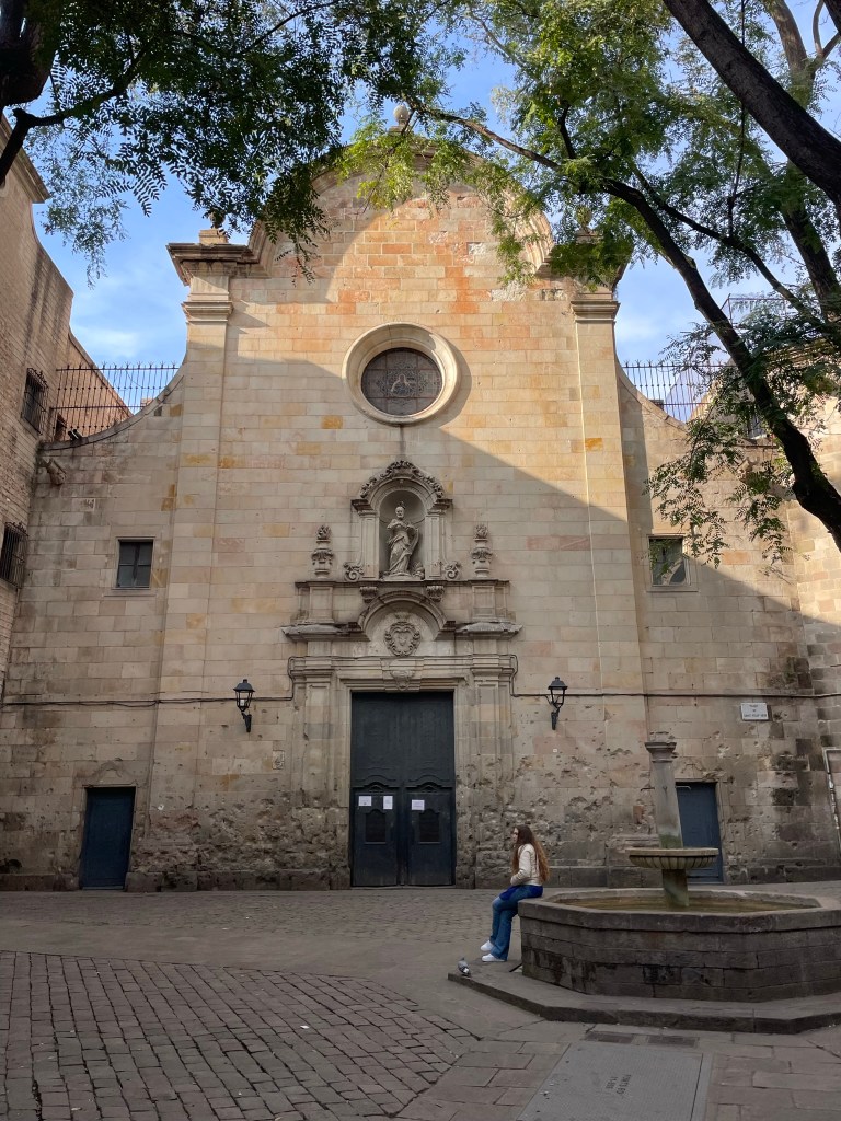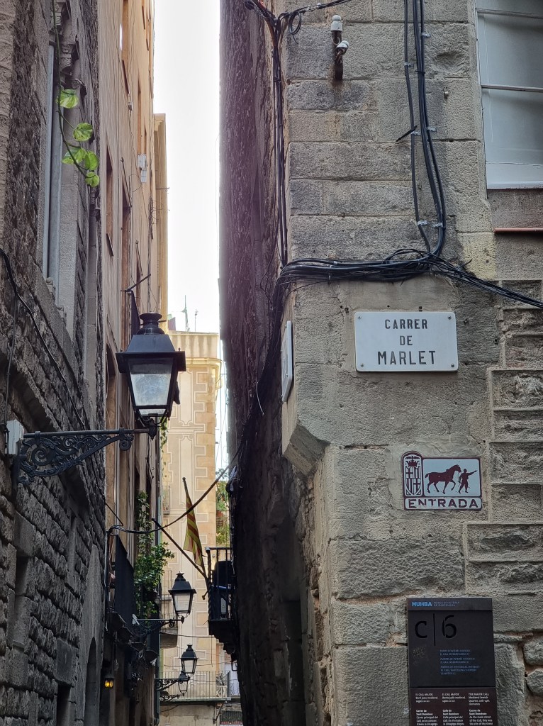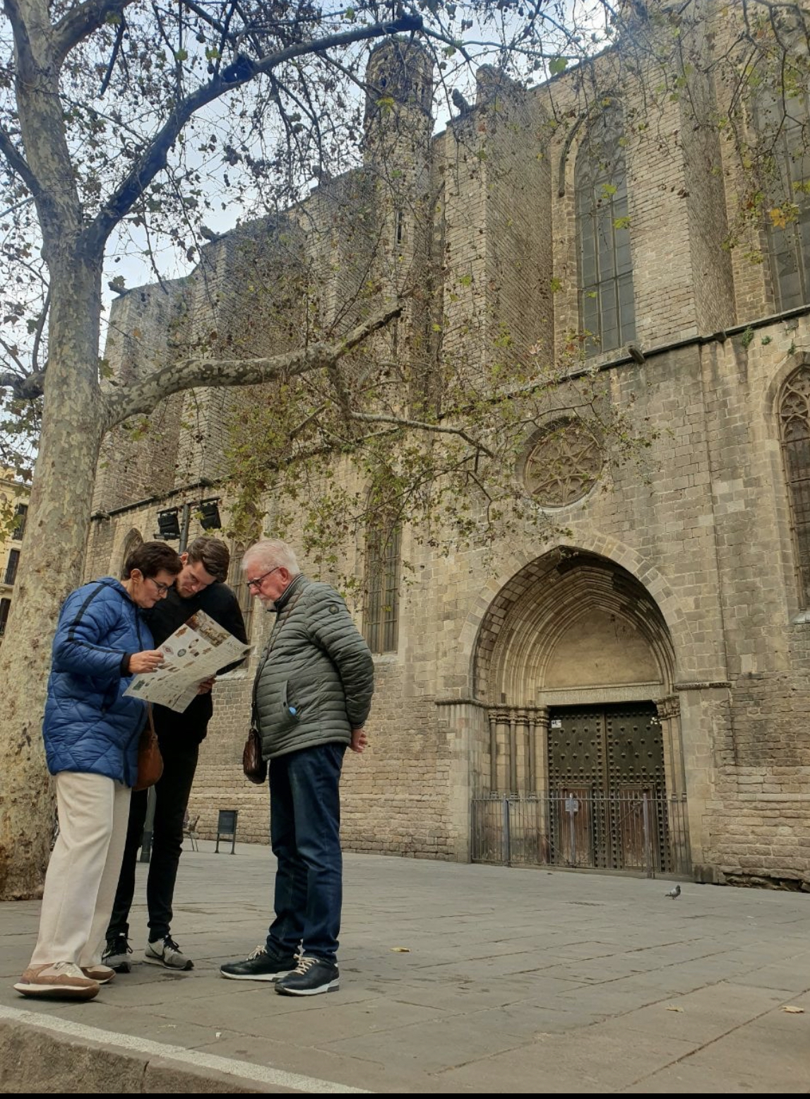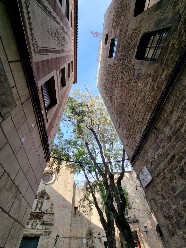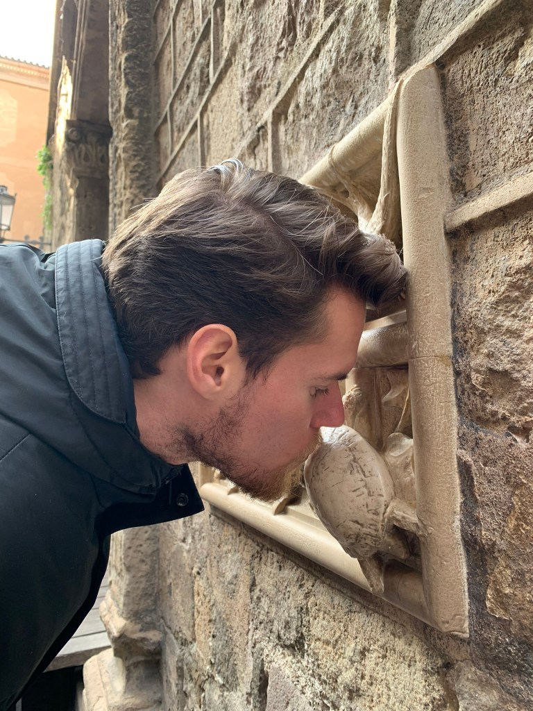 Jasper regelt kaarten waarmee wij drie dagen onbeperkt met het openbaar vervoer kunnen reizen. Overigens sowieso handig om Jasper kaartjes te laten regelen, want hij weet ze overal met korting te bemachtigen. Oké, soms moeten wij daar digitaal voor even de Spaanse nationaliteit aannemen (50% korting). Met de metro richting Sagrada Familia waar ons appartement ligt. De temperatuur is inmiddels een stuk aangenamer en en het zonnetje schijnt. Koffertjes neergezet en de stad in voor een terrasje. Daarna treffen wij Antonio, de gids die ons een rondleiding geeft door de ‘Barri Gòtec’ (Gotische wijk), het oude centrum van de oude stad (‘Ciutat Vella’), van Barcelona. Een labyrint van kleine straatjes die uitkomen op de bekende pleinen van Barcelona. De straatjes zijn zo smal dat er overal bordjes hangen die de richting aangeven voor het verkeer met paarden in vroeger tijd. Je vindt er eeuwenoude gebouwen, die soms nog dateren uit de Middeleeuwen en de Romeinse tijd. Voorbeelden: de resten van de tempel van keizer Augustus, het Palau Reial (koninklijk Paleis) waar Columbus na zijn terugkeer uit Amerika werd ontvangen door Koning Ferdinand II van Aragon en Isabelle I van Castilie, de kathedraal van Barcelona en een pleintje waar een schooltje is gevestigd. Spelende schoolkinderen op zo’n binnenpleintje oogt vreemd. De gevel van het gebouw zit bovendien vol kogelgaten. In de 2e wereldoorlog schuilden hier kinderen. Het gebouw werd echter beschoten en de kinderen overleefden het niet. Naast het schooltje was een klein ziekenhuis, waar Gaudi zijn laatste adem uitblies nadat hij onder een tram was gekomen. Een pleintje met een geschiedenis dus. Jasper kust de schildpad op de brievenbus in de gevel van het middeleeuwse paleis Casa de l’Ardiaca (huis van de Aartsdiaken = plaatsvervanger bisschop). Deze brievenbus is versierd met zwaluwen, klimop en een schildpad. Het is een verwijzing naar het verleden van dit gebouw als College van advocaten van Barcelona. Het laat zien hoe het recht werkt. Hoewel het snel als de zwaluwen zou moeten zijn, is het vanwege de bureaucratie (klimop) eigenlijk zo traag als een schildpad. De schildpad kussen betekent een goed, lang en gelukkig leven.
