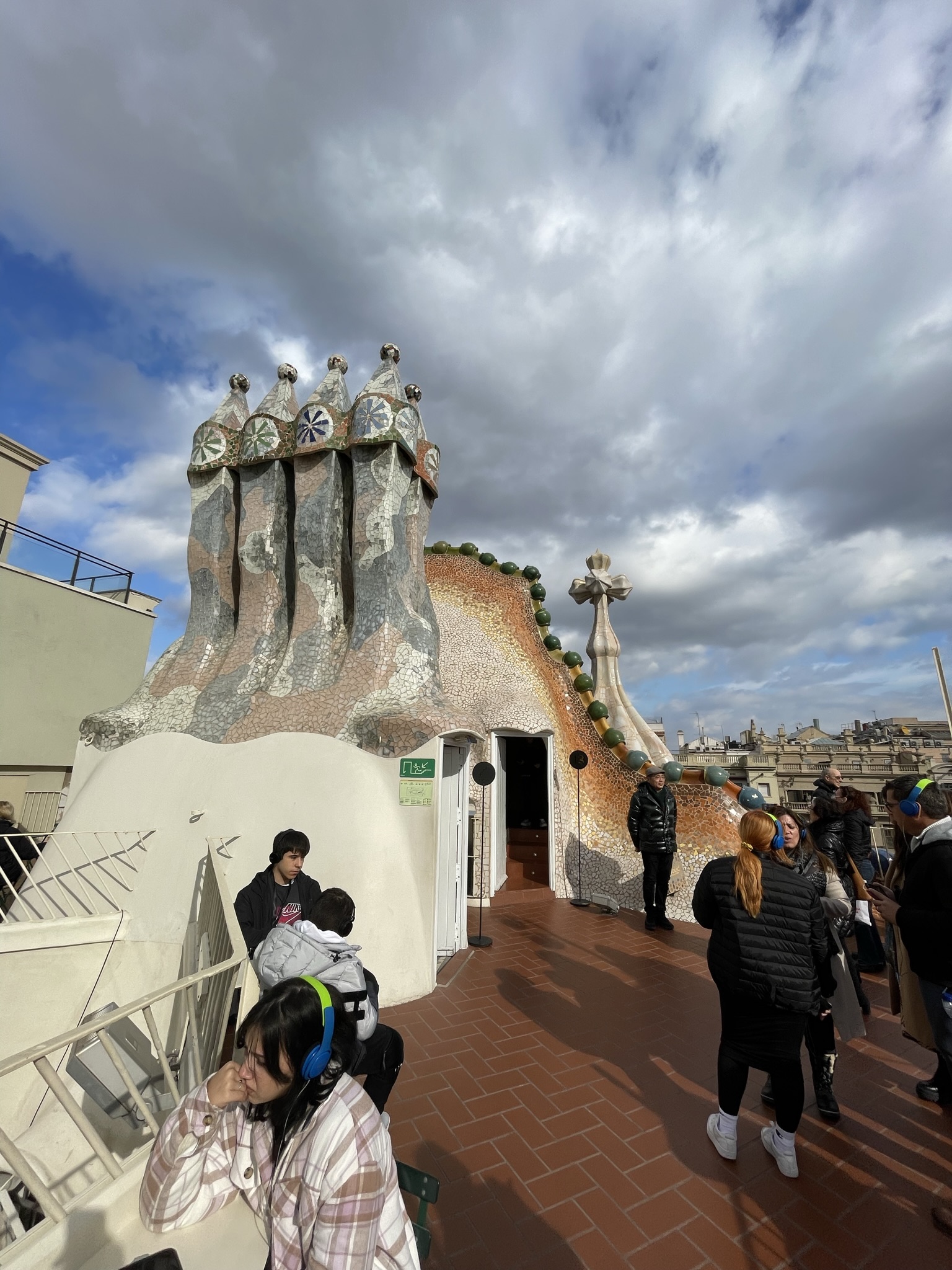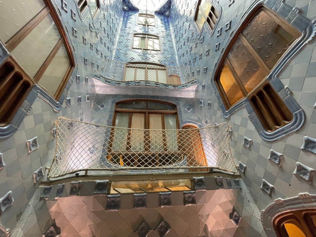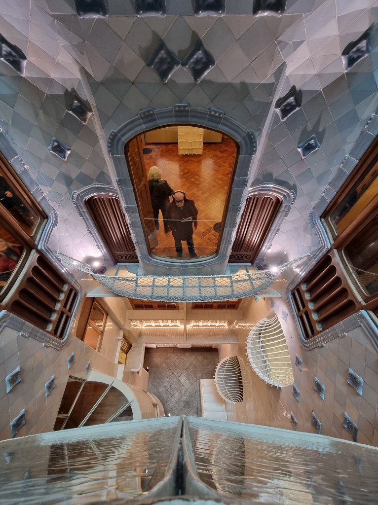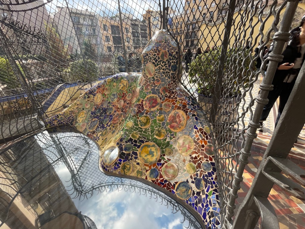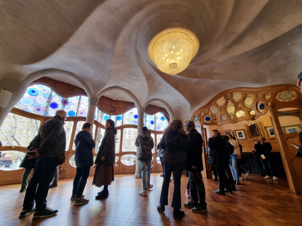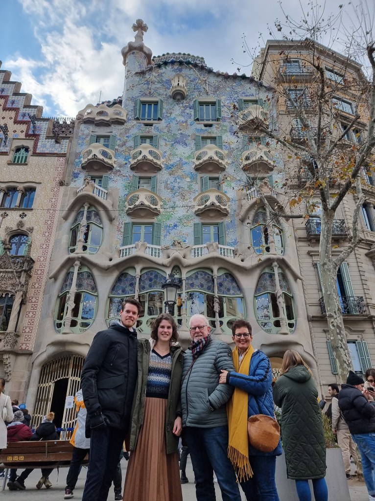 BARCELONA dag 2: We trappen af met een heerlijk ontbijt in een broodjeszaakje naast ons appartement. Daarna met de metro naar Casa Batlló. In 2016 bezochten wij al Casa Milà, dus nu opnieuw een prachtig bouwwerk van Antoni Gaudi. Het is gebouwd in 1877. Het pand werd door Gaudi verbouwd tussen 1904 en 1906 voor de textielmagnaat Josep Batlló i Casanovas. Net als bij het even verderop aan dezelfde straat gelegen Casa Milà is hier niets hoekig: alles is golvend en afgerond net als de golven van de zee. De voorgevel is bedekt met mozaïek die doet denken aan de schubben van een vis. De zuilen op de gelijkvloerse verdieping lijken wel de poten van dinosaurussen en het golvende dak van mozaïek de ruggengraat van een enorm monster. De balkons lijken enorme kaken van zeedieren, die als het ware uit de zee ontspringen. Het centrale thema is van de drakendoder Sint Joris. Sinds 1995 is Casa Batlló het eigendom van de familie Bernat. De geschatte waarde van dit pand bedraagt zo’n 70 miljoen euro. Middels de geluidstour wordt elk detail uitgelegd.
