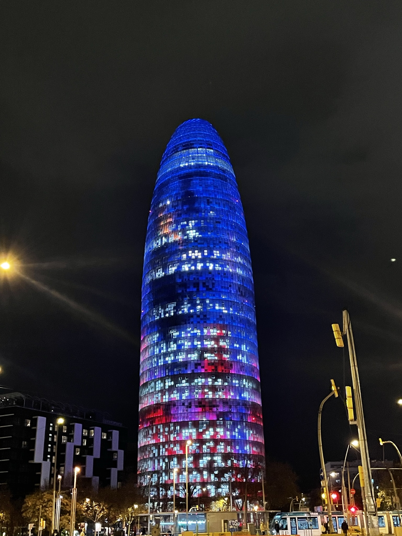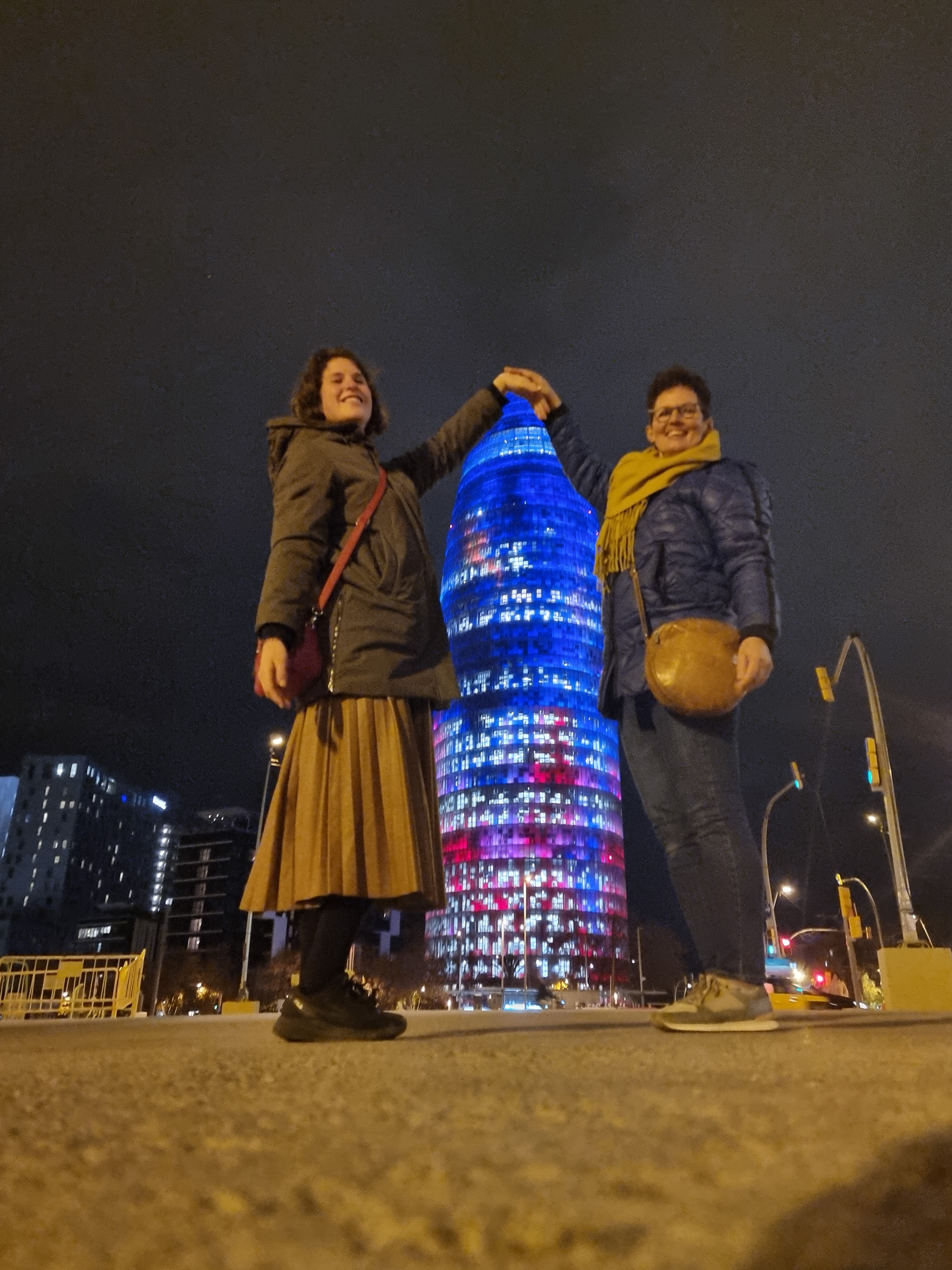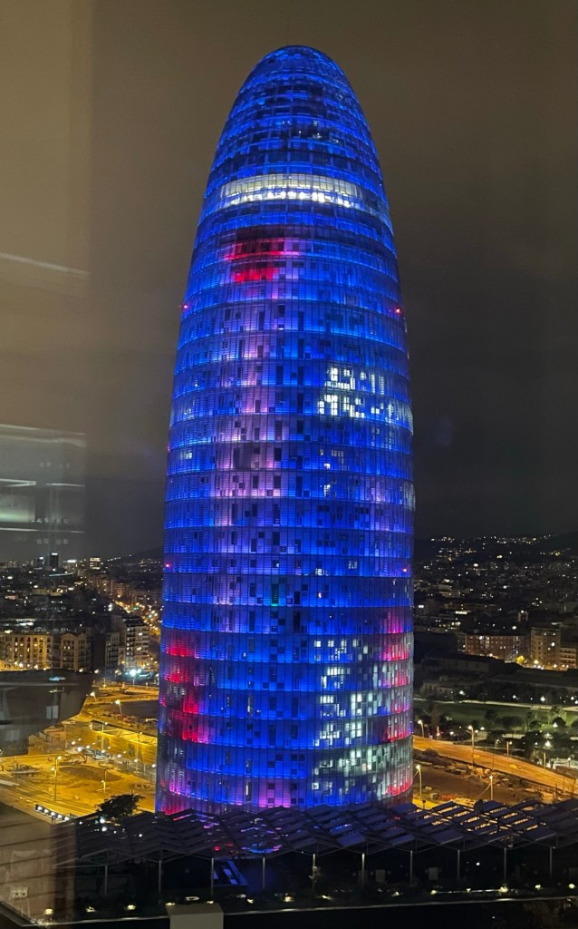 Na dit bezoek tijd voor een heerlijke maaltijd in restaurant ‘El Clot’, waar voor Joyce, Claudia en mij andermaal de tapas op het menu staat. Jas kiest dit keer voor de Paella. De duisternis is inmiddels een feit, maar wij zijn onvermoeibaar en wandelen naar ‘La Torre Glòries’, voorheen bekend als de ‘Torre Agbar’. De oorspronkelijke naam, Torre Agbar, is afgeleid van ‘Aguas de Barcelona’, het Spaanse waterleidingbedrijf dat in de toren gevestigd is. De toren is ontworpen door de Franse architect Jean Nouvel. De toren is 144,4 meter hoog, telt 38 verdiepingen en heeft de vorm van een cilinder die vanaf de 26e verdieping overgaat in een koepel. De buitenwand is volledig bedekt met aluminium zonweringen van 120 bij 30 cm. Overdag weerkaatsen deze het zonlicht en ’s nachts worden ze door ledlampen verlicht. Doordat de toren omringd wordt door een greppel lijkt het net of hij vanuit de grond omhoog is geschoven. Om de toren goed in de stad te laten passen, liet de architect zich door een aantal typisch Barcelonese objecten inspireren. Zo lijkt de toren enigszins op de klokkentorens van de Sagrada Familia en heeft hij iets van de toppen van de berg Montserrat. Daarnaast ziet hij eruit als een blauwe waterstraal die uit de grond omhoog komt, wat weer van toepassing is op het waterleidingbedrijf dat erin gevestigd is. De toren heeft ook wel de bijnaam ‘fallus van Barcelona’. Wij nemen de lift naar de 18e etage van het naastgelegen Novotel om vanaf het rooftopterras de toren en de achterliggende stad te zien.