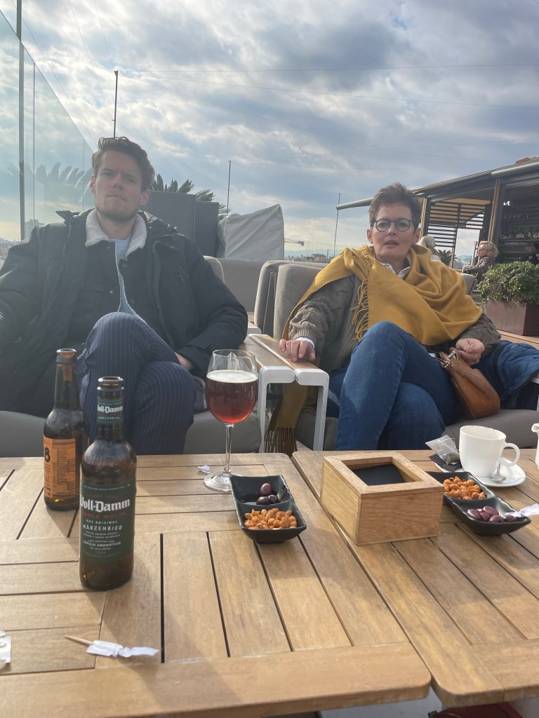 Na deze cultuur explosie steken wij de weg over naar een rooftopbar voor een drankje. Prachtig uitzicht over de stad, zonnetje en achter het glas. Heerlijk. Oké, biertje kost er € 9,–, maar dan krijg je er wel heerlijke olijven en nootjes bij. En zijn de schaaltjes leeg, dan worden onmiddellijk nieuwe neergezet.