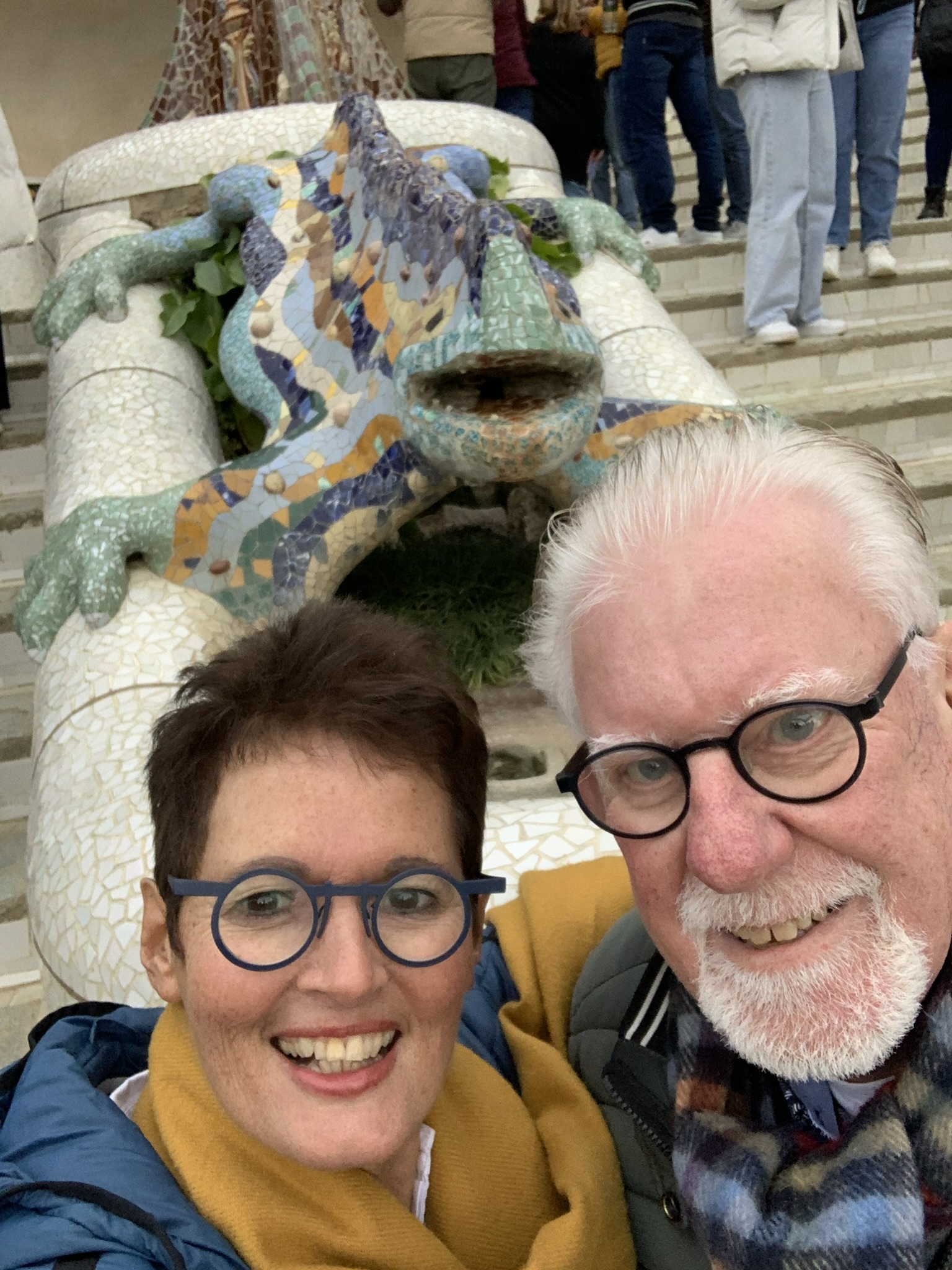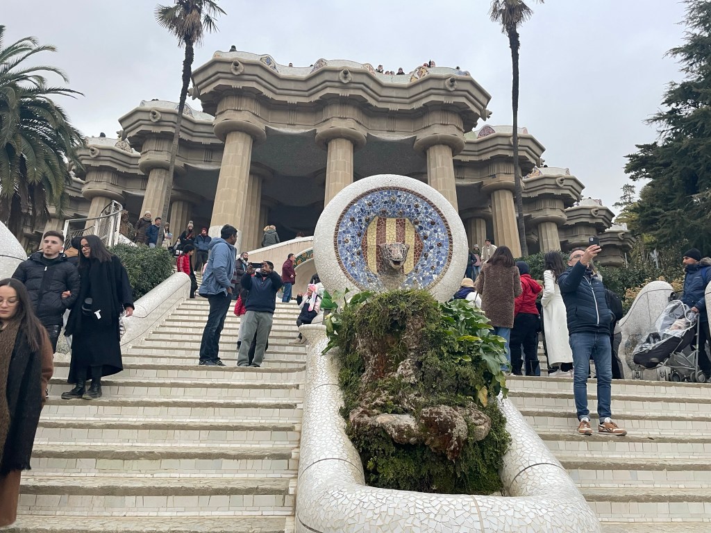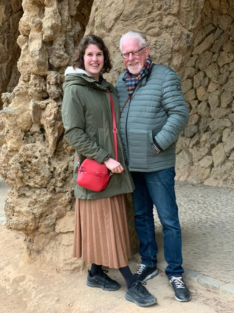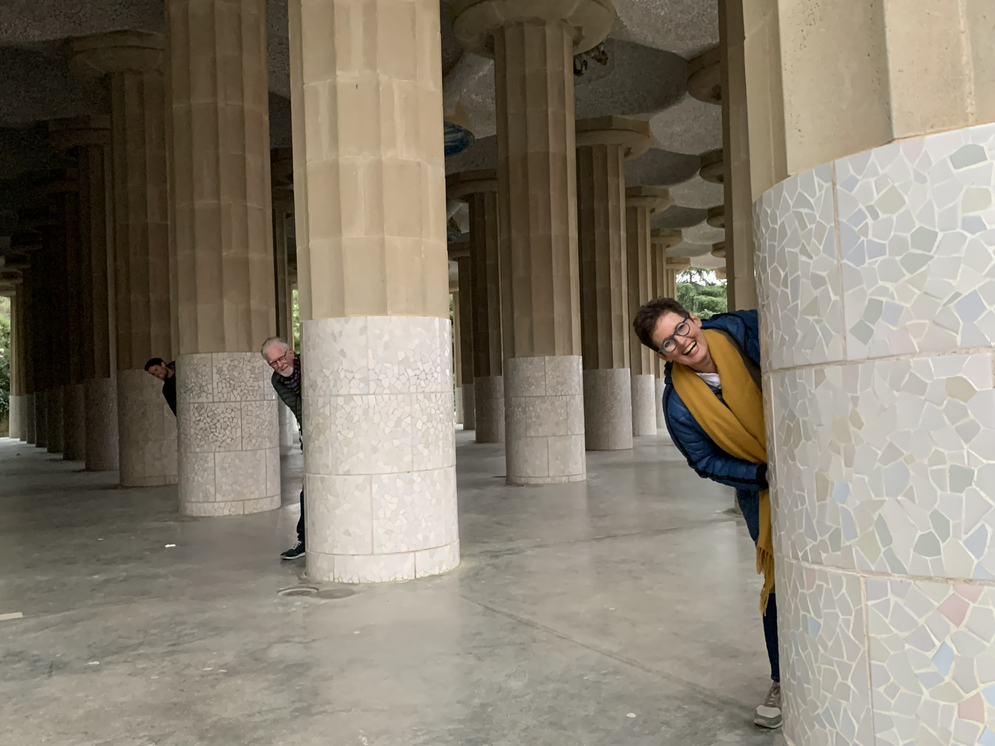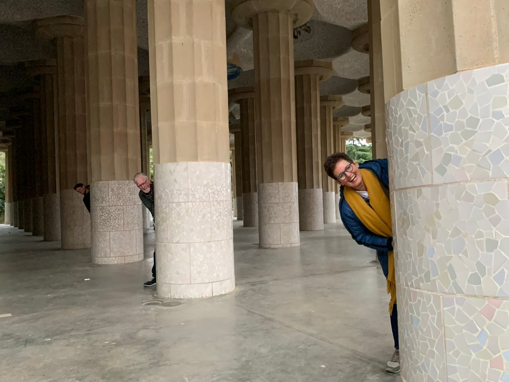 Volgend reisdoel is Parc Guell, wederom een schepping van Gaudi. De tot de adelstand verheven industrieel Eusebi Güell gaf Gaudí in 1900 de opdracht voor de aanleg van een tuindorp of woonwijk. Dit werd geen succes: er werden twee huizen gebouwd en ook verkocht. In een van die huizen trok Gaudí in. Barcelona toonde als stad geen interesse voor dit megaproject. Gaudí nam toen de opdracht aan om zijn idee over een op de natuur geïnspireerde architectuur vorm te geven. Hij dacht aan een recreatiepark, terwijl Güell aan een tuinstad dacht. Güell deed inspiratie op tijdens zijn buitenlandse reizen, waarbij hij de Engelse landschapstuinen en de romantische tuinarchitectuur bewonderde, vandaar het Engelse “park”. Dit leidde tot met gesteente bezette pergola’s, harmonieus in het landschap geïntegreerde trappen, paden en golvende, veelkleurige, mozaïekversieringen, waarmee Gaudí zijn sociale engagement laat zien. Markante onderdelen zijn de ingang met portiersloge en portierswoning, het hek, de zuilengalerij, de dubbele trap met Salamander – bekend als “El Drac” (De Draak) – en de zitbank. Zowel de zitbank als de Salamander bestaan uit ontelbare mozaïekstukjes. Claudia vertoonde een kunstje met haar lenige lijf, terwijl wij als wat minder gespierde familieleden eenvoudig verstoppertje speelden.