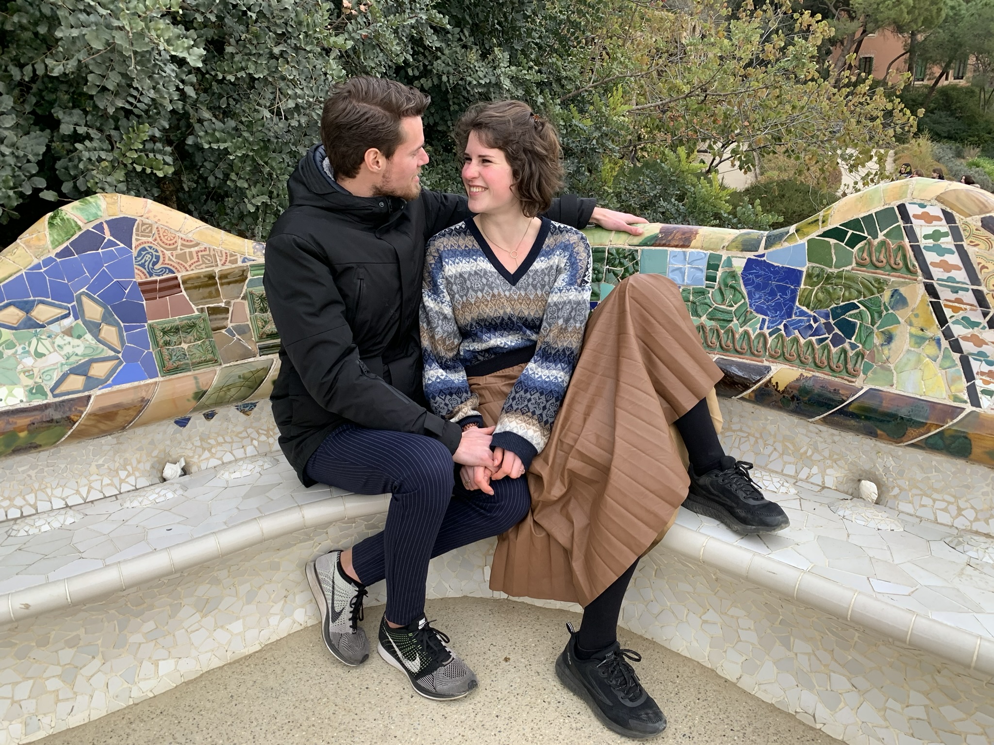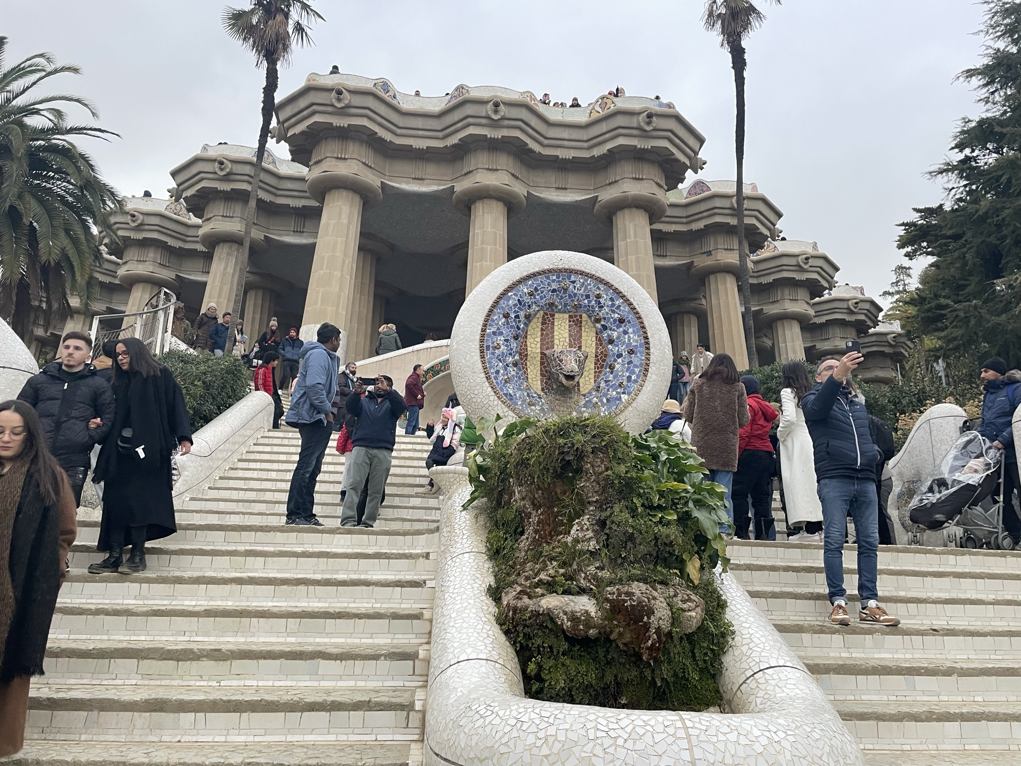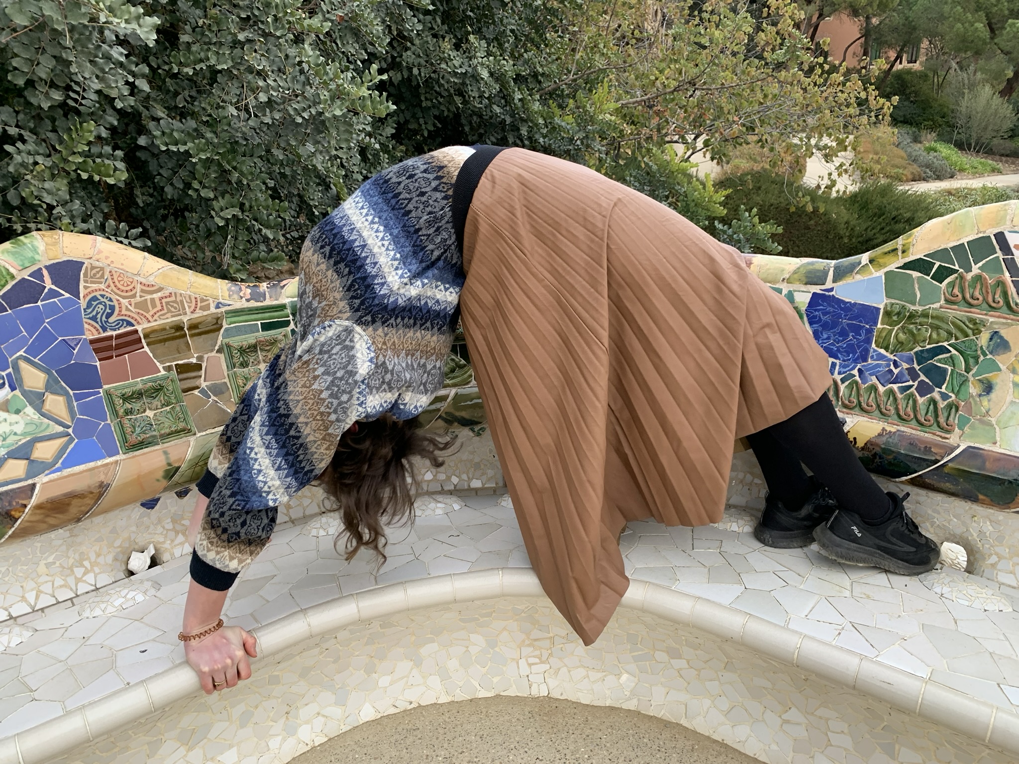 Volgend reisdoel is Parc Guell, wederom een schepping van Gaudi. De tot de adelstand verheven industrieel Eusebi Güell gaf Gaudí in 1900 de opdracht voor de aanleg van een tuindorp of woonwijk. Dit werd geen succes: er werden twee huizen gebouwd en ook verkocht. In een van die huizen trok Gaudí in. Barcelona toonde als stad geen interesse voor dit megaproject. Gaudí nam toen de opdracht aan om zijn idee over een op de natuur geïnspireerde architectuur vorm te geven. Hij dacht aan een recreatiepark, terwijl Güell aan een tuinstad dacht. Güell deed inspiratie op tijdens zijn buitenlandse reizen, waarbij hij de Engelse landschapstuinen en de romantische tuinarchitectuur bewonderde, vandaar het Engelse “park”. Dit leidde tot met gesteente bezette pergola’s, harmonieus in het landschap geïntegreerde trappen, paden en golvende, veelkleurige, mozaïekversieringen, waarmee Gaudí zijn sociale engagement laat zien. Markante onderdelen zijn de ingang met portiersloge en portierswoning, het hek, de zuilengalerij, de dubbele trap met Salamander – bekend als “El Drac” (De Draak) – en de zitbank. Zowel de zitbank als de Salamander bestaan uit ontelbare mozaïekstukjes. Claudia vertoonde een kunstje met haar lenige lijf, terwijl wij als wat minder gespierde familieleden eenvoudig verstoppertje speelden.