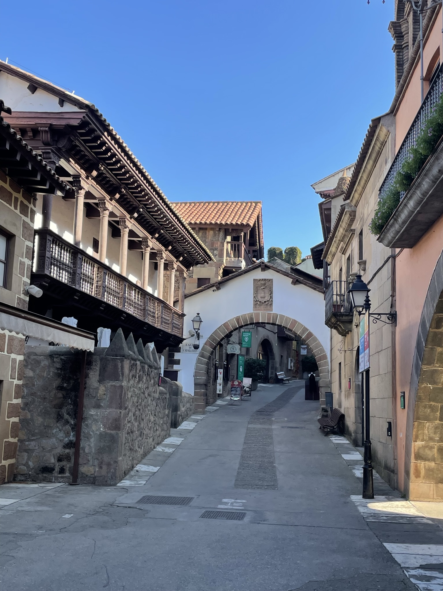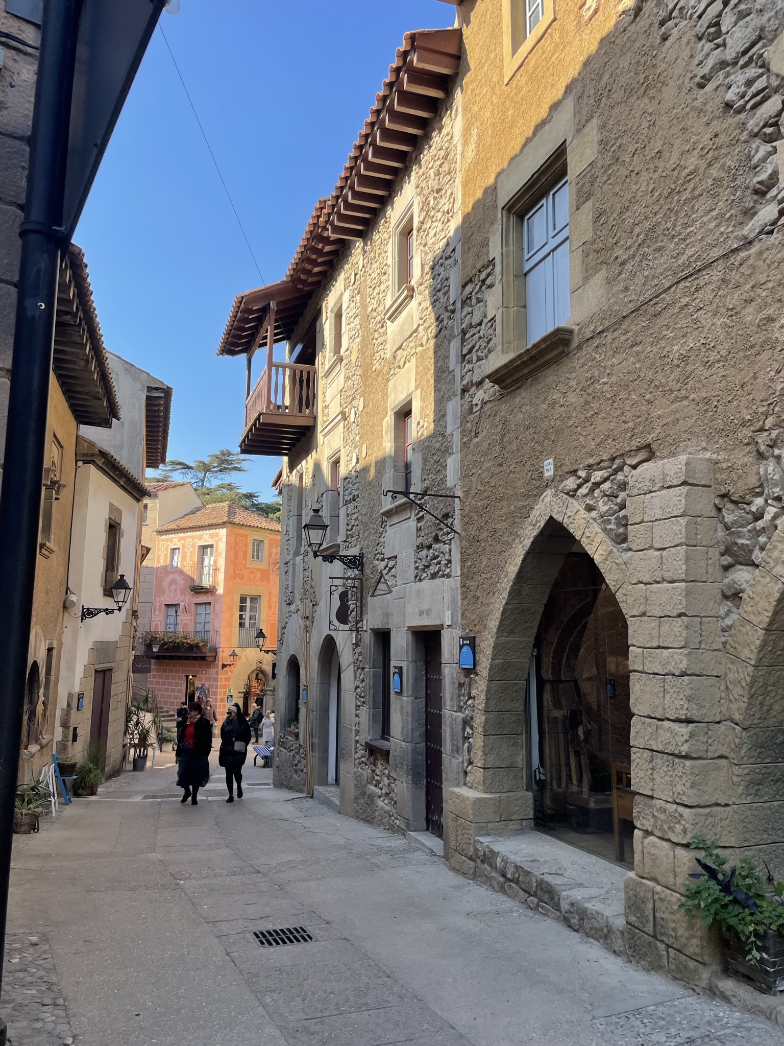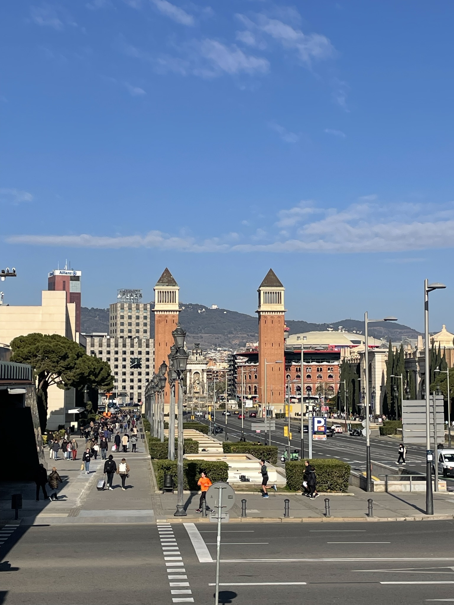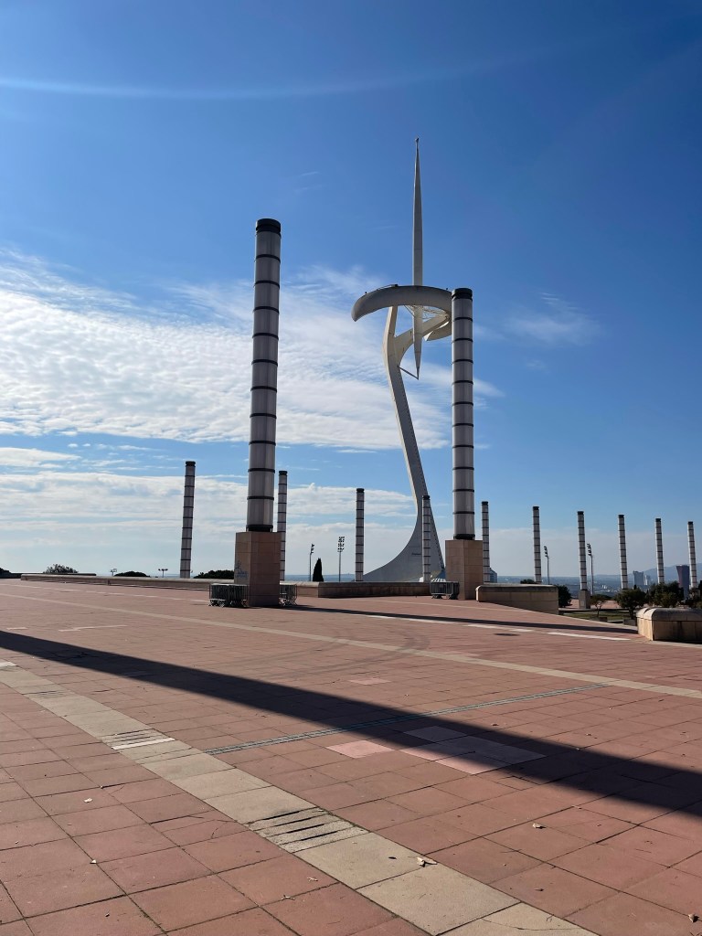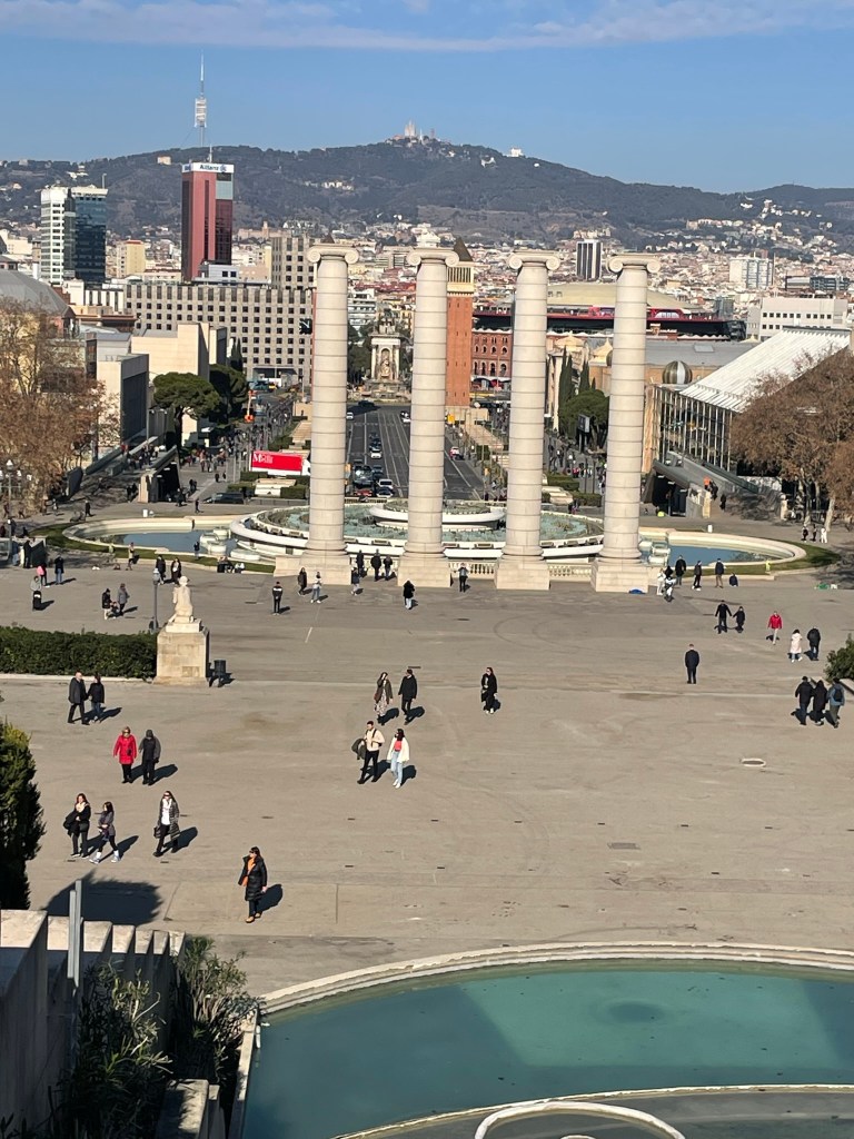 BARCELONA dag 3: En dan is alweer de laatste dag aangebroken. Opnieuw een vol programma. De zon schijnt uitbundig. Na opnieuw een uitgebreid ontbijt van luxe broodjes beginnen wij bij de drukke Plaça d’Espanya, ontworpen door o.a. Josep Puig i Cadafalch. Je komt zijn naam, net als die van Gaudi veelvuldig tegen in Barcelona. De gebouwen rond het plein stonden centraal tijdens de wereldtentoonstelling in 1929. Tot 1977 werd de grote arena op het plein gebruikt voor stierengevechten. Nu is het een winkelcentrum. Je vindt er het Palau Nacional, waarin het Museu Nacional d’Art de Catalunya is gevestigd. Wij slaan, gezien het mooie weer en ons volle programma, een bezoek over. De twee Venetiaanse Torens die het begin van de promenade flankeren zijn 47 meter hoog. In het midden van de verkeersrotonde, waar verschillende grote verkeersaders samenkomen, staat de fontein van Plaça d’Espanya. Dit monument, het werk van Josep Maria Jujol, is een eerbetoon aan de wateren van Spanje. Beeldhouwer Miquel Blay wilde de Atlantische Oceaan, de Middellandse Zee, de Cantabrische Zee, de Ebrodelta en diverse Spaanse rivieren uitbeelden met beelden van kinderen, jongeren en ouderen. Helaas deden de fonteinen het niet tijdens ons bezoek. De drie zuilen op het plein staan symbool voor religie, kunst en heldendom. Via het museum kom je bij de Montjuïc, een heuvel tussen Plaça d’Espanya en de haven van Barcelona. Op de heuveltop staat het kasteel van Montjuïc, een 18e-eeuws kustverdedigingsfort. Je vindt er het Olympisch dorp van de Olympische spelen in 1992. Wij lopen verder naar ‘El Poble Espanyol’ (Spaans dorp), een dorp dat je, qua stijl, nergens in Spanje zult aantreffen. Het is namelijk een openluchtmuseum waar alle bouwstijlen uit heel Spanje zijn gecombineerd. Het dorp werd gebouwd voor de Wereldtentoonstelling in 1929. Het was de bedoeling dit Spaanse dorp na afloop van deze expositie weer af te breken. Zover is het nooit gekomen, omdat het dorp erg in trek was onder de lokale bevolking en toeristen. We bezoeken er de verschillende winkeltjes met ambachtelijke kunst, kleine galleries en natuurlijk een plaatselijk taveerne.