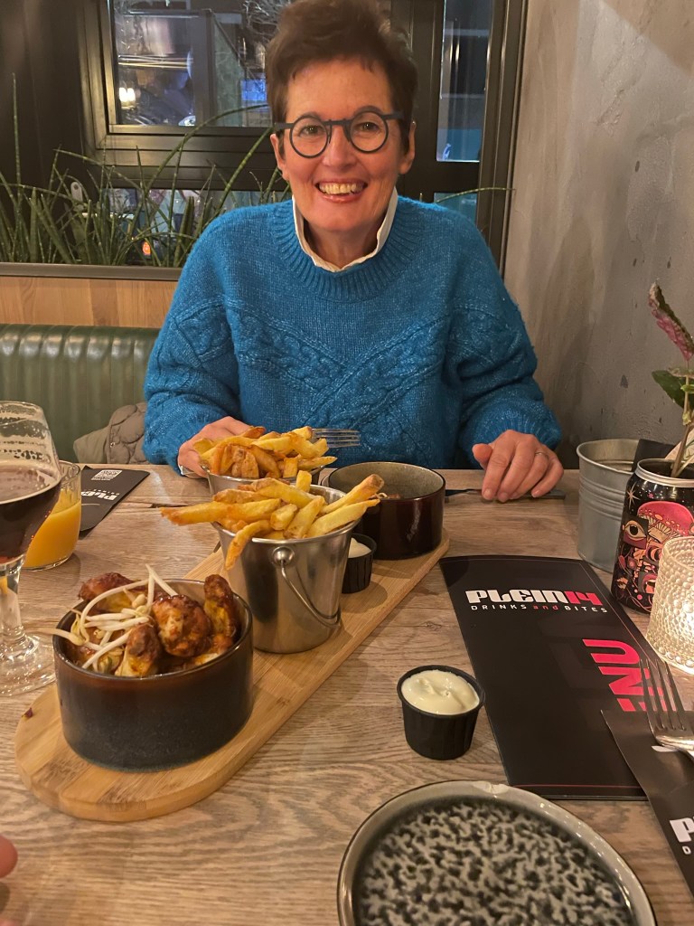 Na afloop heerlijk gegeten bij ‘Plein 14’. Deze tent is eigendom van de zoon van oud collega Piet van der Vlugt die 20 jaar geleden op onze vorige school leerkracht was. Wij waren Piet uit het oog verloren. Toevallig was de zoon aanwezig en die verstuurde meteen onze groet aan de inmiddels 80 jarig Piet. Die was blij verrast. Wij kregen zijn nummer en gaan binnenkort contact met hem leggen om nog eens terug te kijken op vele jaren samenwerking.