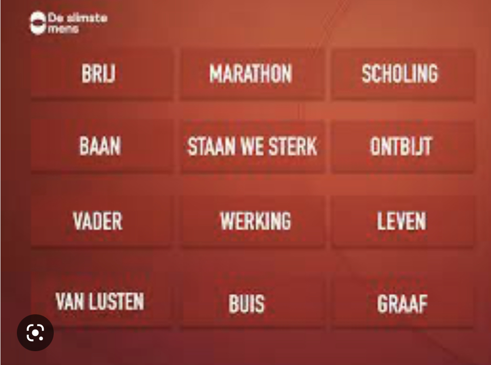 De Slimste Mens: En dan kwam er deze week ook een einde aan het 21e seizoen van ‘De Slimste Mens’. By Far onze favoriete kennisquiz, gepresenteerd door Philip Freriks met als juryvoorzitter brombeer Maarten van Rossum. Als trouwe kijkers missen wij al jaren geen aflevering en puzzelen vrolijk mee. Elk seizoen duiken er weer nieuwe Nederlanders op waar je van gaat houden. Het programma helpt die mensen vaak ook verder. Denk b.v. aan Rob Kemps (van de Snollebollekes) die er inmiddels een flinke tv-persoonlijkheid door is geworden (b.v. Chansons). Favoriet onderdeel bij ons is toch wel de puzzel. Drie verbanden leggen van telkens vier woorden. Voor wie het niet kent en eens wil proberen, hieronder wat voorbeelden. In het eerste plaatje vormen de woorden scholing–leven–staan we sterk–werking een verband. Het woord dat ze verbindt is: ‘Samen‘. Zo zijn er in het eerste plaatje nog twee van die verbanden. Zie jij ze? Ook in de andere plaatjes?