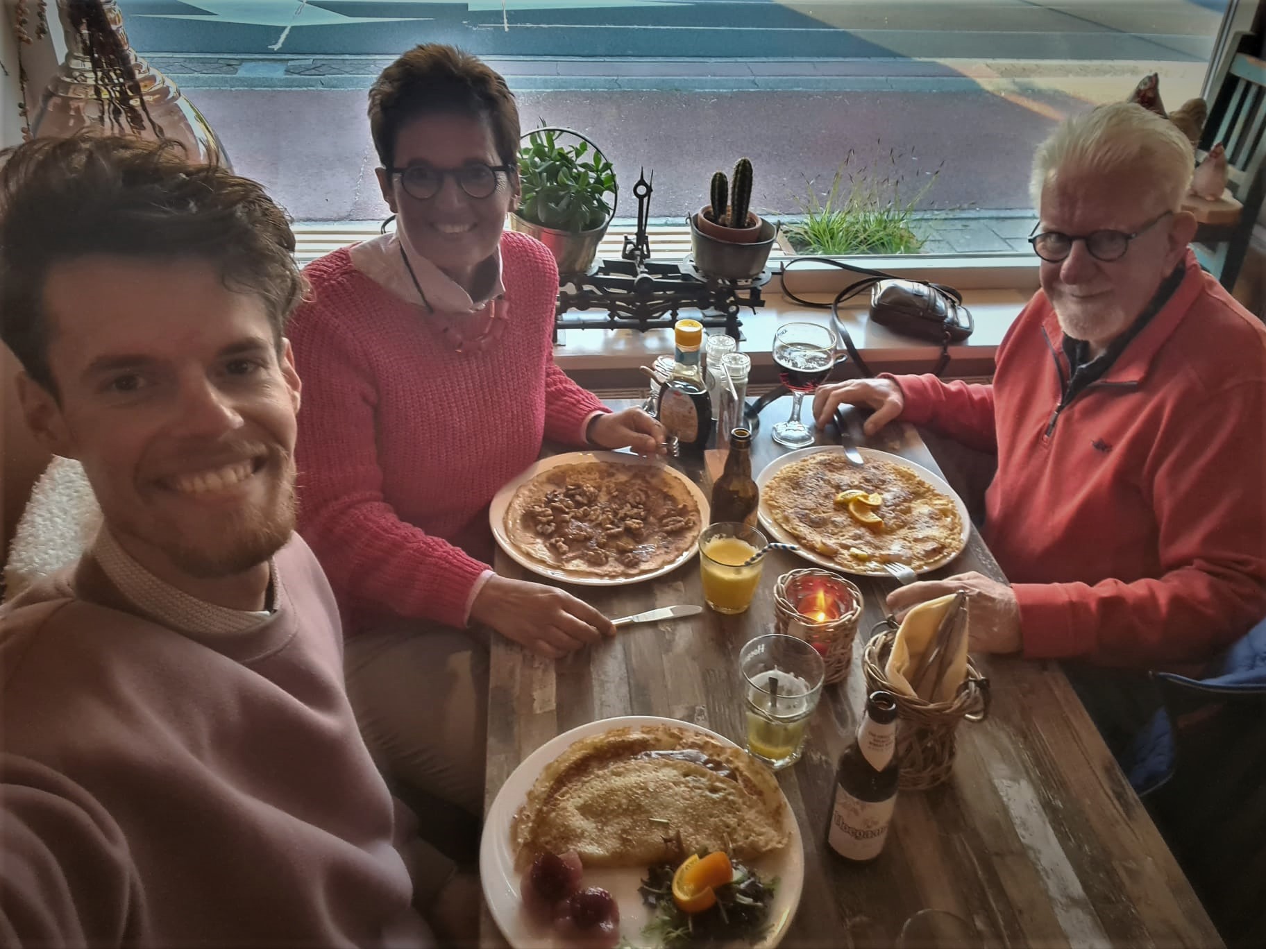 Donderdag: Wij zitten niet ver van Epe, dus vandaag een bezoekje aan onze vrienden Henk en Lia op hun boerderij. Verhalen uitwisselen en nog even de stikstof problematiek doorgenomen. Henk heeft als hobbyboer kennis van de materie. Zo vertelt Henk dat in Nederland alle boeren en boerenbedrijven nauwgezet in kaart zijn gebracht. Met één druk op de knop kun je b.v. precies zien hoe oud elke boer is en weet je dus dat er bij de oudere boeren een moment van stoppen aan zit te komen. Veel boeren willen ook stoppen. Vaak ook omdat er geen opvolgers zijn. Deze boeren willen dus graag uitgekocht worden. Maar wel tegen een bedrag dat marktconform is. Op die manier kun je het probleem dus al aardig tackelen. Alleen wil de overheid die boeren afschepen met een fooi. En daar gaat het dus mis. Wel miljarden naar de oorlog in Oekraïne, maar geen geld naar onze boeren. Zo krijg ik toch meer begrip voor de boerenprotesten. Na Epe rijden wij door naar oud-collega directeur Wim Klaassen in Heerde. Wim woont hier sinds een half jaartje. Leuke vent en als directeuren konden wij het altijd goed met elkaar vinden. Daarna nog langs Oene waar een groot kledingwarenhuis staat met de naam Aro. Aan geraden door Lia uit Epe. Hier vind je alle grote kledingmerken bij elkaar. Zo populair dat er zelfs hele busreizen naartoe georganiseerd worden. Het is inderdaad een kledingparadijs, maar prijzig en dus blijft onze portemonnee vandaag dicht. Ons laatste reisdoel in het station van Apeldoorn. Daar staat Jasper op ons te wachten. Hij wilde graag een etmaal met ons doorbrengen en samen wat doen op de vrijdag. Hij wil dolgraag een pannenkoek eten, dus opnieuw naar ons pannenkoekenhuis in Beekbergen.