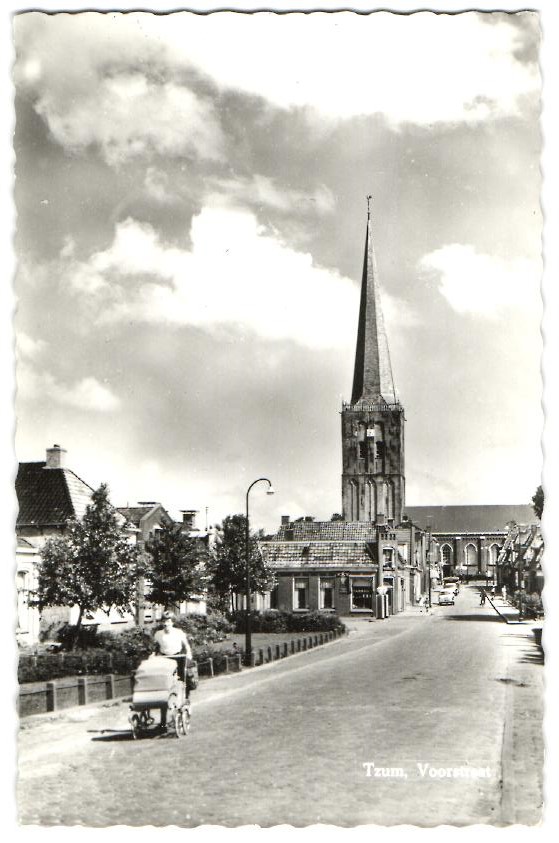 Tzum lag vele eeuwen geleden dicht bij de Middelzee, die destijds als een lange slurf diep het Friese land in drong. Tzum was een van de vele terpen die zich hier langs de Noordzeekust uitstrekten. Wanneer je op het perron van het stationnetje van Franeker staat, zie je in het zuiden, midden uit het lage Friese land, een toren van buitengewone hoogte oprijzen. Het is werkelijk een toren als een reus. Hij komt met zijn spits bijna tot aan de wolken en je begrijpt eerlijk gezegd niet hoe men in een dorp als Tzum (want daar hoort hij thuis) aan zo’n hoge toren komt. Ja, het moet zelfs de hoogste toren van Friesland zijn. Of het zo is, kan ik je niet zeggen. Maar als je hem daar ziet staan, zo kloek en fier tussen de kleine huizen aan de voet, dan wil je het graag geloven. Volgens de overlevering zou de bouw precies twaalf maanden, twaalf weken, twaalf dagen en twaalf uren hebben geduurd. En toen had Tzum de hoogste dorpskerktoren van Friesland. Vanaf de mat van de begane grond tot de trans 42 meter en van de trans tot het uiterste puntje van de spits 30 meter, dus in totaal 72 meter. Aan die toren is een merkwaardige geschiedenis verbonden.