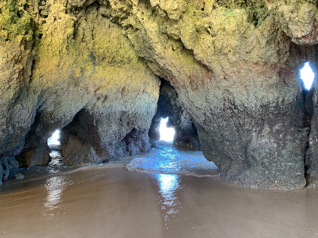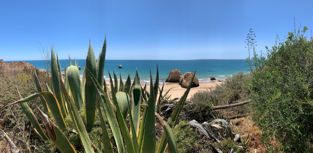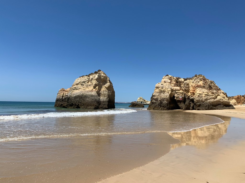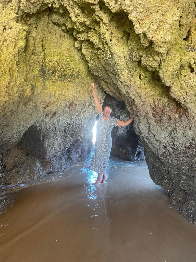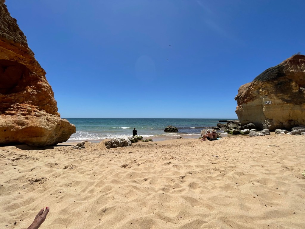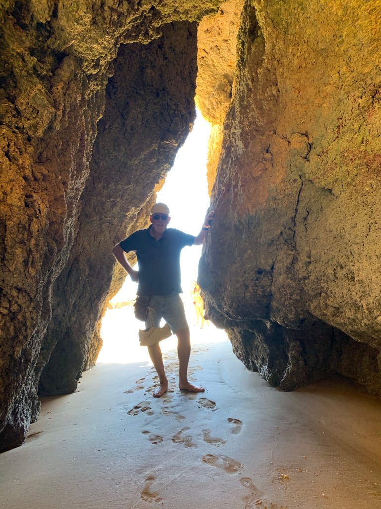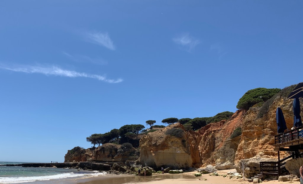 Zondag 14 mei: Op de laatste dag van deze ‘Week van…’ rijden wij naar Olhos de Áqua, een plaatsje niet ver van ons resort. De naam betekent ‘Ogen van water’. Onder het strand bevinden zich zoetwaterbronnen. Bij eb wordt dit natuurverschijnsel zichtbaar en qua vorm lijken de bronnen dan op ogen. Olhos de Áqua was in 2014 onze eerste kennismaking met de Algarve, waar wij verbleven in het prachtige resort Alfagar. Het wordt vandaag een stranddag. Wij leggen onze handdoeken uit in een mini-baai omringd door hoge rotsen. Wel de vloed in de gaten houden, want anders kom je niet meer terug. Wat is het hier toch schitterend. Na een heerlijk terrasje keren wij terug op het resort om nog even te zwemmen. En dan zodadelijk uit eten. Weer naar die ‘cock’ van gisteren. Ik hoop dat hij vergeetachtig is. Nog een volle week te gaan, dus ‘Até próxima semana’