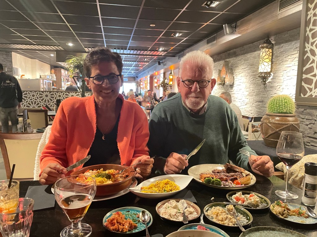 Naar de Libanees: Deze week met Jasper en Claudia naar de Libanees. Weer eens een andere keuken. De menu’s bestaan vooral uit warme en koude mezza’s of mazza’s, kleine hapjes die tezamen een heerlijk plateau vormen. Vergelijk het een beetje met Spaanse tapas. In het Midden-Oosten zijn de mezza’s vaak vegetarisch, iets meer richting de Middellandse Zee vind je er ook vlees bij. Je eet het met Libanees scheurbrood, een soort Naan brood. Kan in de vorm van ‘Shared Dining’. Best een heerlijk avontuur dat wat tijd inneemt. Maar…dan heb je ook wat.