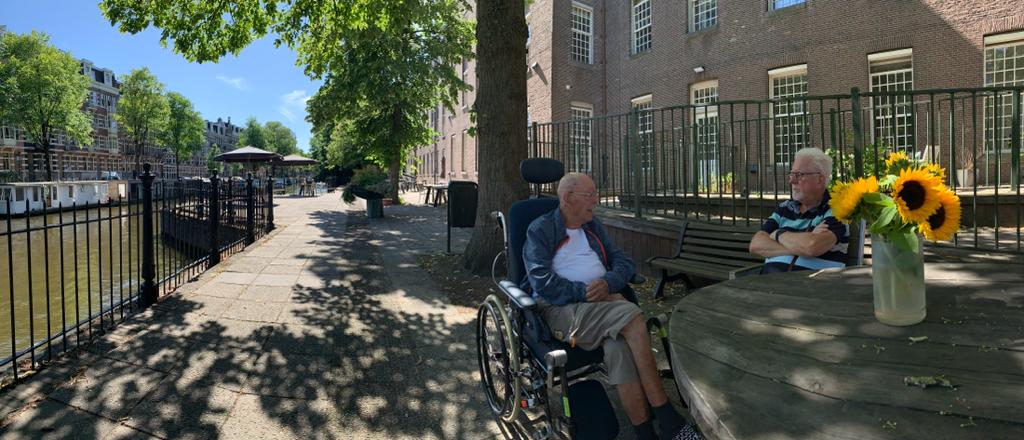 Gelukt: Deze week heeft mijn vader gelukkig het Sarphatihuis kunnen verlaten. Wij hebben hem verhuisd naar verpleeghotel Belmonte in Amstelveen. Hij zat hier eerder al in december en januari. De goede contacten die ik destijds had opgebouwd met hoofdverantwoordelijke Saskia van Belmonte zorgden ervoor dat zij de normale toelatingsprocedures even wat flexibeler hanteerde, omdat ook zij schrok van de slechte zorg die mijn vader in het Sarphatihuis kreeg. Nog een mooi voorbeeld hiervan maakten wij mee op de ochtend van de verhuizing. Daags daarvoor had ik een afrondend gesprek met het verantwoordelijke afdelingshoofd over zijn vertrek de volgende ochtend. Ook Belmonte had toen al contact hierover gehad. Terwijl ik op weg ben om hem op te halen, word ik gebeld: “U spreekt met het afdelingshoofd van het Sarphatihuis. Uw vader zegt dat hij vandaag weggaat. Hoezo?? Wij weten helemaal van niks. Het staat ook nergens genoteerd, dus dat kan helemaal niet”. Op zo’n moment spring je echt uit je vel. Gaf dus maar aan dat ze echt versterking moesten gaan halen om mij tegen te houden. Merkte vervolgens bij de afhandeling daar dat er niet echt veel bereidheid was om mee te werken. Maar gelukkig zaten wij niet veel later in de auto op weg naar Amstelveen. Ambulance was dit keer geen optie, omdat het Amsterdamse tehuis er niet aan mee wilde werken. Te duur. Omdat mijn vader aan een zuurstof apparaat ligt, was dat nog wel even een experiment. Daags voor vertrek had ik hem daarom (in overleg met de leiding) een uurtje van de zuurstof afgehaald. Dat ging eigenlijk prima. Zo goed zelfs dat ze hem daarna vergaten weer aan te sluiten. (zucht) Dus dat ene uurtje werden er een paar meer. Liep gelukkig goed af. Het enige wat we van aan het Amsterdamse verblijf zullen missen, is het gezellige zitje en het bootjes kijken aan de Nieuwe Prinsengracht.