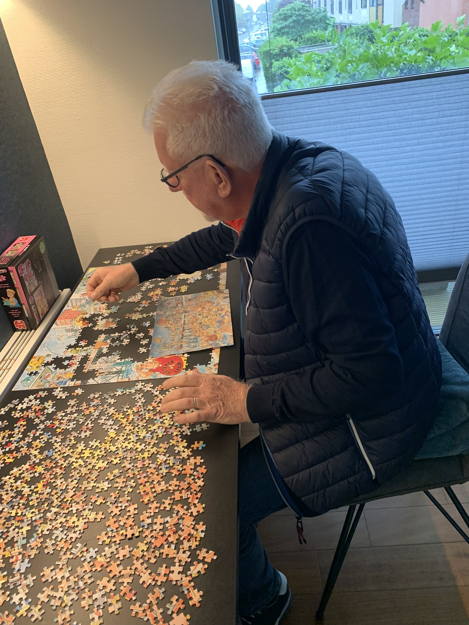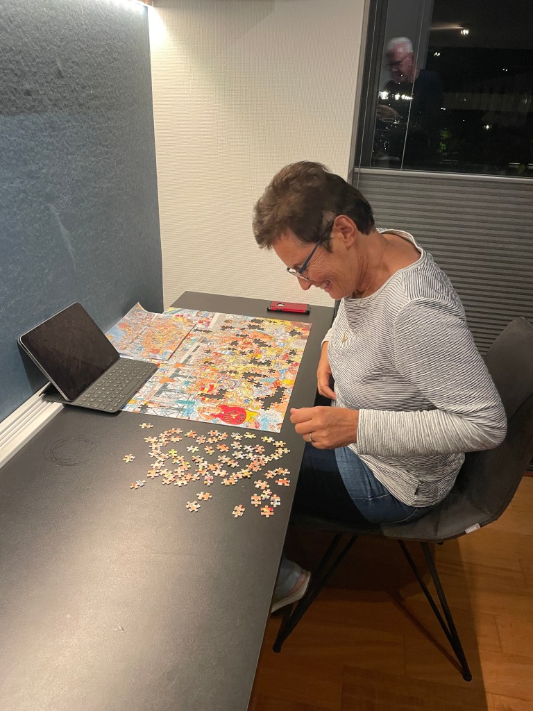 Wasgij?: Nu het herfstweer ons weer wat meer binnenshuis houdt, hebben wij ons gestort op de ‘senioren’ activiteit puzzelen. Legpuzzels bedoel ik dan. Ons bezoek aan de tentoonstelling van Jan van Haasteren in het stadsmuseum in Harderwijk werkte inspirerend. Ik had nog een paar nieuwe in de kast liggen. Nu ik mijn eigen werkkamertje heb, kan ik de boel lekker laten liggen. Joyce had alle van Haasteren puzzels verkocht en koos voor een vergelijkbare puzzelserie: Wasgij? met als titel ‘Sands of Time’. Die bleek toch een beetje anders dan de van Haasteren puzzels. De afbeelding op de doos bleek namelijk niet in de doos te zitten. Dat was geen vergissing, maar de bedoeling. De afbeelding (een druk strand) laat de situatie zien zoals deze twintig jaar geleden was. De puzzel in de doos is echter dezelfde situatie in het heden. Die moet je dus raden aan de hand van het oude plaatje. Bijna niet te doen, zo moeilijk. Ik hoorde Joyce dan ook regelmatig verzuchten dat het niet meeviel. Toen ze er de brui aan wilde geven, vond ik gelukkig een afbeelding met de oplossing. Vanaf dat moment werd het wat minder lastig, maar nog steeds moeilijk. Er ontstond een soort gevoel van: ‘Ik wil en zal het oplossen’. Inmiddels zijn wij een week verder en hebben wij (toch maar samen) de nodige uren besteed aan deze puzzel. Hij is af. Volgende keer weer toch maar weer gewoon een puzzel volgens het plaatje op de doos.