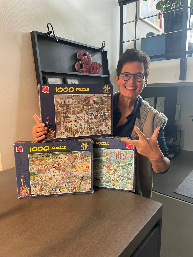Gelukkig bood iemand via Markplaats een hele stapel Jan van Haasteren puzzels aan. Dus waren wij deze zondagochtend al vroeg op pad om er drie op te halen. Daar komt Joyce, gelet op het regenachtige weer, november wel mee door. Tot grote verrassing van Joyce zat in één van de dozen nog een vierde ‘van Haasteren’ verstopt. Mazzeltje dus.