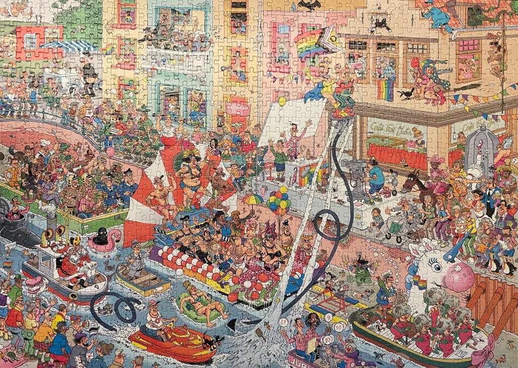 Jig-Saw Joop: Joyce is gegrepen door het Jig-Saw puzzelvirus. Waar komt die naam vandaan? De eerste legpuzzels verschenen in de tweede helft van de 18e eeuw en hadden in de eerste plaats een educatieve functie. Rond 1760 commercialiseerde de Engelsman John Spilsbury een puzzel met de kaart van Groot-Brittannië. De Engelse naam jigsaw puzzle verwijst naar de figuurzaag die werd gebruikt om vroege legpuzzels te maken. De puzzelstukken bestonden uit de verschillende Engelse graafschappen en werden afzonderlijk verkocht. In Frankrijk werden in de jaren 1770 gelijkaardige puzzels gedrukt met landkaarten als afbeelding. Er werden in Engeland in die periode ook puzzels gemaakt met afbeeldingen van de verschillende Engelse koningen. Door de puzzel te leggen leerde de speler de juiste dynastieke volgorde kennen. Pas later ontstonden puzzelstukken met een rechthoekige, uniforme pasvorm, los van de te leggen afbeelding. Maar weer even terug naar Joyce: Na de moeilijke strandpuzzel van Wasgij? waarbij je moet raden hoe de situatie 20 jaar later is dan het plaatje op de doos van vorige week, werd deze week de nieuwe Jan van Haasteren ‘Celebrate Pride’ voltooid. Toch wel handiger wanneer de puzzel gewoon hetzelfde is als het plaatje op de doos. De puzzeldrang van Joyce was nu helemaal niet meer te stuiten en er ontstonden onmiddellijk afkickverschijnselen.