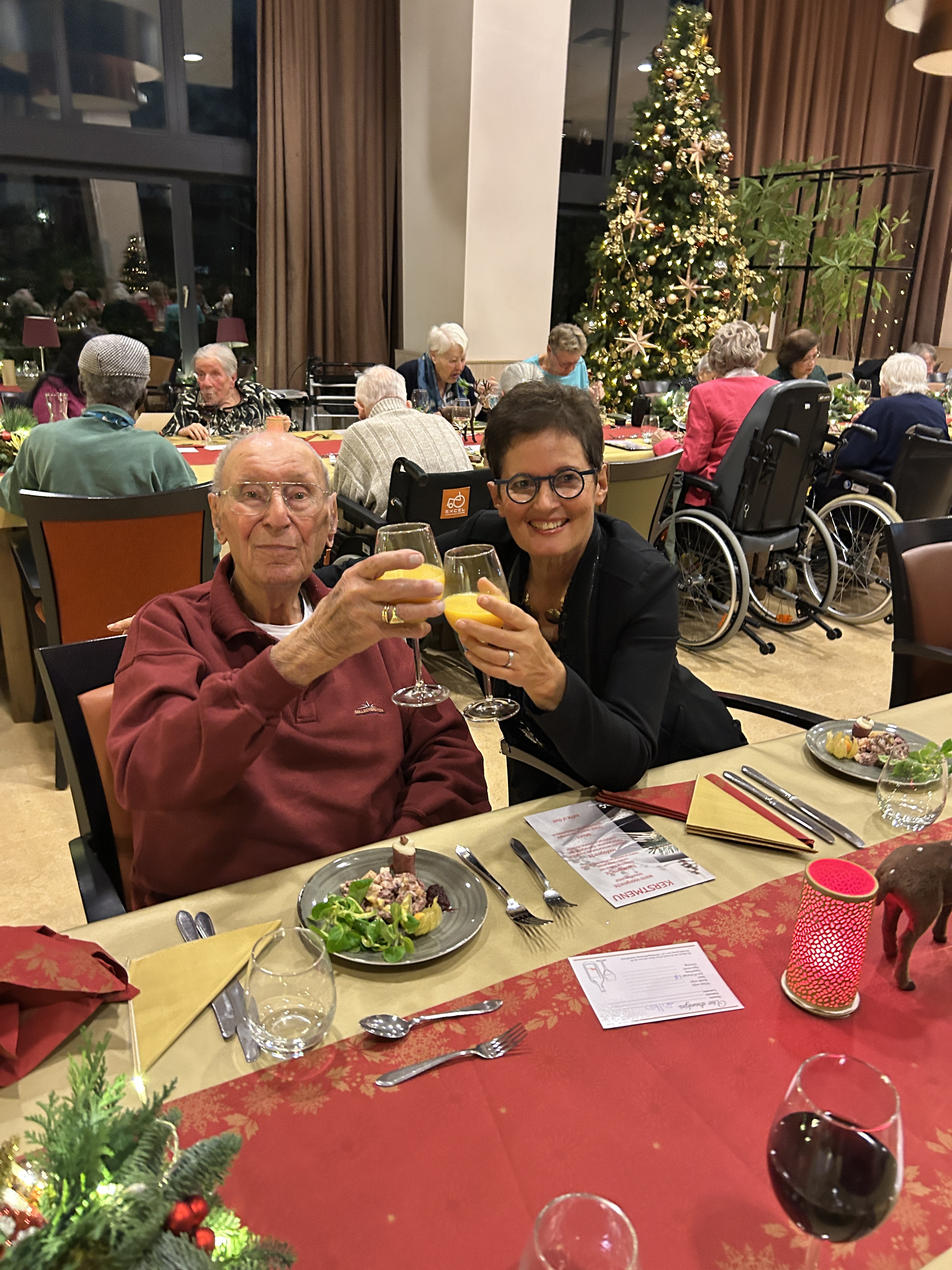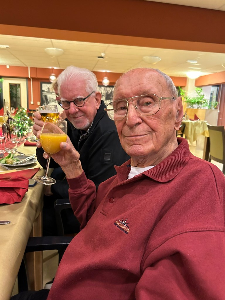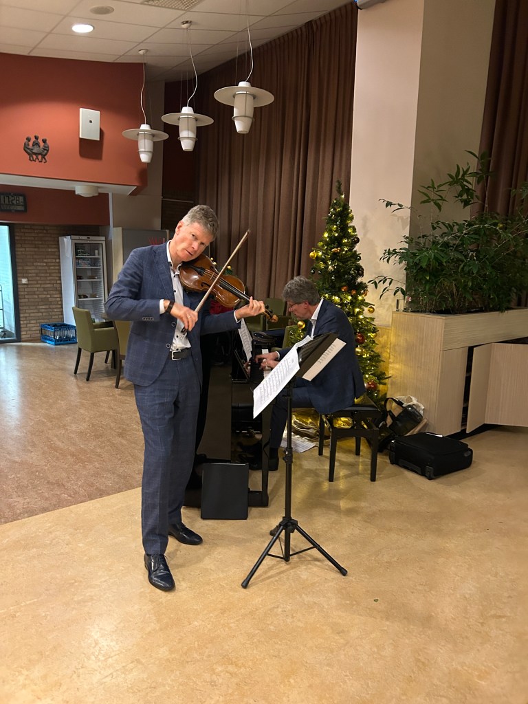 Kerstdiner: In het verzorgingstehuis van mijn vader werd deze week een kerstdiner georganiseerd. Elk oudje mocht één familielid aan tafel uitnodigen. Joyce was dit jaar de gelukkige. De zaal was prachtig versierd en de tafels waren mooi gedekt. Een pianist en een violist zorgden voor live-entertainment. Het eten in het verzorgingstehuis is meestal niet erg smakelijk, maar voor dit diner was echt alles uit de kast gehaald. Mooi menu en erg lekker. Ik had mij voor dit diner aangemeld als ‘decembermaatje’. Dat betekende dat ik zou assisteren bij het diner. Niet in de bediening, maar vooral het halen en brengen van de oudjes naar de eetzaal en weer naar de kamer. Een strikje omdoen of de kleding wat schikken behoorden tot de mogelijke taken. Op die manier kon ik toch nog een beetje meekijken naar de feestelijkheden. Toen ik mij meldde, bleek er helaas geen hulp nodig. Communicatiefoutje. Vond ik wel teleurstellend. Ter compensatie mocht ik als tweede familielid aanschuiven naast mijn vader en Joyce. Werd het toch nog een leuke avond.