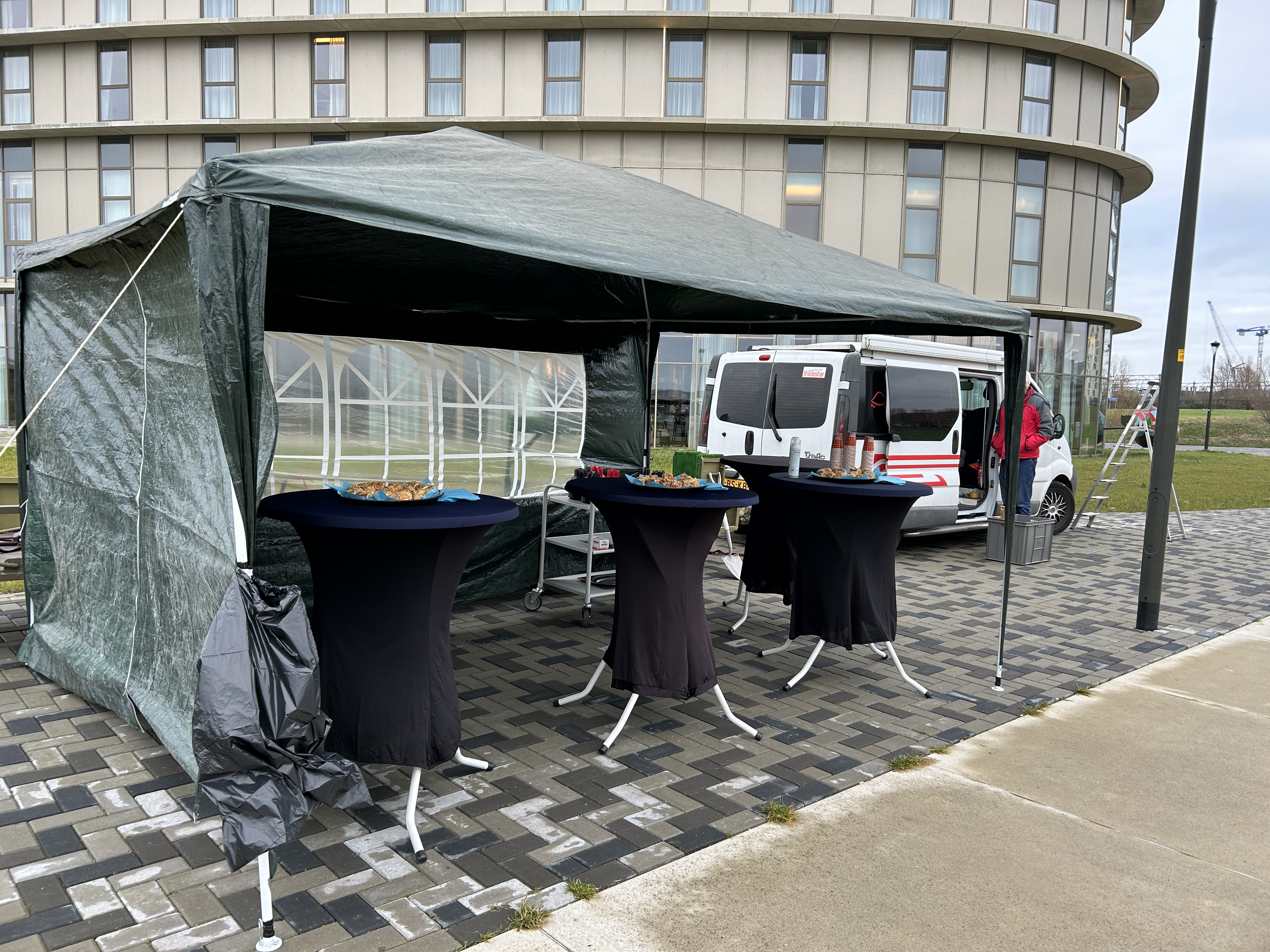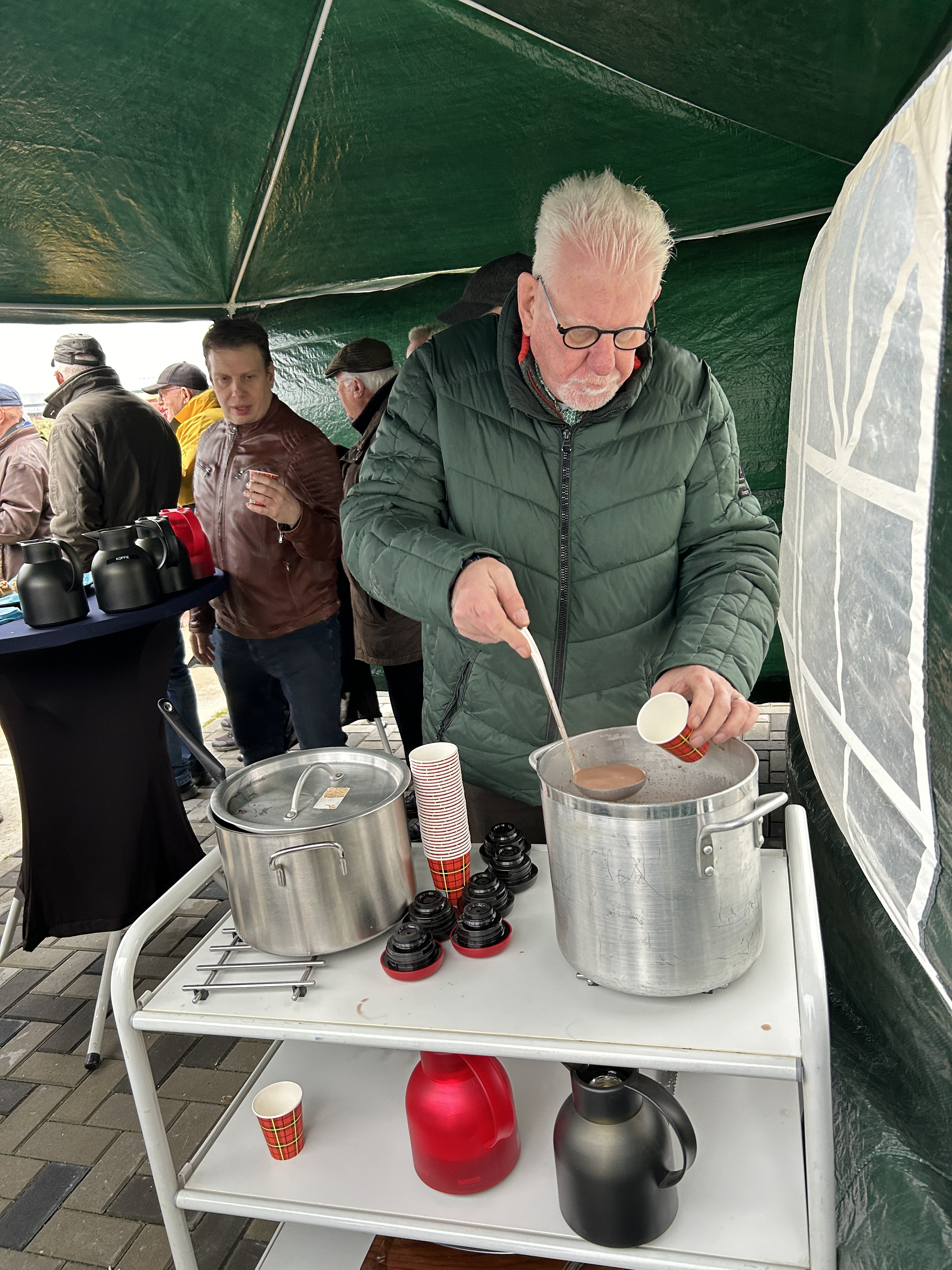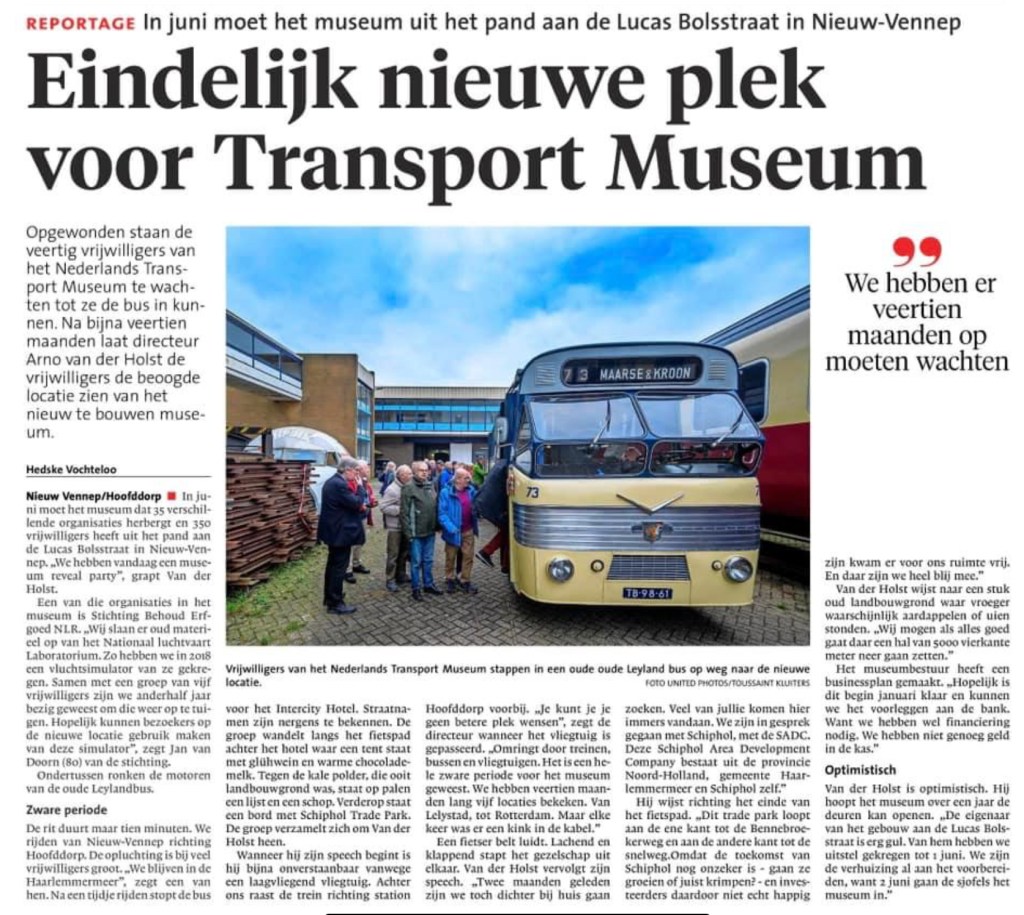 Transportmuseum: Wij hadden ons er al bij neergelegd dat onze activiteiten voor het Transportmuseum eerder dit jaar ten einde waren gekomen. Het pand moest leeggehaald worden en de gemeente wilde niet echt meewerken aan een nieuwe locatie. Het idee was om te verhuizen naar b.v. Lelystad. Voor ons te ver. Tot onze grote verrassing werden wij deze week ineens benaderd door de directie. Of wij een feestelijke vrijwilligers bijeenkomst mede wilden vormgeven op ‘de nieuwe locatie van het museum’ in Hoofddorp’. Wat een verrassing. Dat wilden wij natuurlijk maar al te graag. In het vooroverleg vertelde directeur Arno dat Schiphol het museum graag wil behouden en grond beschikbaar stelt. Als één van de eersten mochten wij de schetsen van het nieuwe terrein en zijn gebouwen bekijken. Ziet er geweldig mooi uit. Realisatie zal nog wel een jaartje in beslag nemen, maar waarschijnlijk staan deze zomer al de eerste hallen op het terrein. Vrijdagmiddag was het dan zover. Met Arno bouwde ik naast het nog lege veld een partytent op. Joyce en mede-vrijwilliger Sytse verwarmden ondertussen de glühwein en chocomel op in de camper van Sytse. Lekker primitief. Op het afgesproken tijdstip leverde de oude bus van Maarse en Kroon de overige uitgenodigde vrijwilligers af op het terrein. Bijzondere gast was Thijs Postma, tekenaar van allerlei mooie uitgaven over vliegtuigen. Wij stonden paraat met de warme drankjes en banketstaven. Arno hield een toespraak over het traject dat leidde tot de nieuwe plek en er werd een toast uitgebracht. Dus ‘we are back in busyness’. Over een tijdje kan ik weer gids spelen en met Joyce samen de catering verzorgen bij feesten en partijen in het museum.