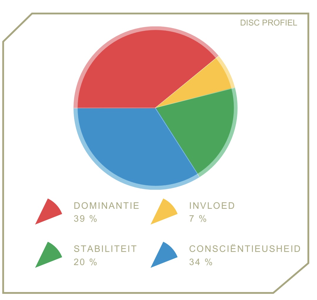 Profiel Ger: Je hebt een sterke innerlijke motivatie om zelfbewust nieuwe ideeen te creëren en uit te voeren. Als je de kans krijgt, neem je het heft in handen. Door jouw behoefte om praktisch te zijn en perfectie te bereiken, ben je vaak doortastend bij kleine beslissingen, maar voorzichtiger bij grote beslissingen. Je kunt soms zo opgaan in je project dat je je niet meer bewust bent van de gevoelens van de mensen om je heen. Even pauzeren om je op de gedachten en ideeën van andere mensen te richten kan voor een betere sfeer zorgen. Je kunt goed met druk omgaan – je zet jezelf onder druk en je verwacht dat anderen dat ook doen.