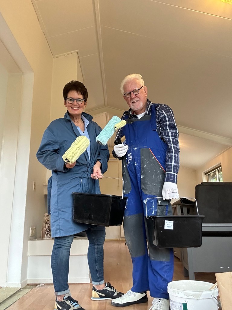 Klusteam rukt uit: Terwijl jongste zoon Jasper met zijn Claudia deze week is neergestreken in Vietnam, is oudste zoon Jeroen met zijn gezin verhuisd naar een leuke bungalow in Voorthuizen. Jeroen is al jaren beheerder van Camping ‘het Beloofde Land’ in Voorthuizen. De camping is inmiddels uitgegroeid tot een modern bungalowpark met uitstekende faciliteiten. Jaren achtereen reisde Jeroen heen en weer tussen woonplaats Aalsmeer en Voorthuizen of hij verbleef in één van de chalets op de camping. Toen er een bungalow vrijkwam vlak naast de camping, was het gezin snel overgehaald om de overstap naar Voorthuizen te maken. Een ruime bungalow met als bijzonderheid dat alle slaapkamers en badkamer voor driekwart onder de grond liggen. Heerlijk koel in de zomer dus. Afgelopen week was de overdracht en wachtte een flinke opknapklus. Precies op de dag van overdracht overleed de eigenaar echter. Gelukkig was e.e.a. notarieel al geregeld, zodat hetgeen al te grote problemen gaf. Voor het nodige opknapwerk steken alle ouderparen de handen uit de mouwen. Joyce rukte maandag uit voor schoonmaakwerkzaamheden en samen hebben wij woensdag de huiskamer van een nieuw verflaagje voorzien. Volgende week weer verder klussen.