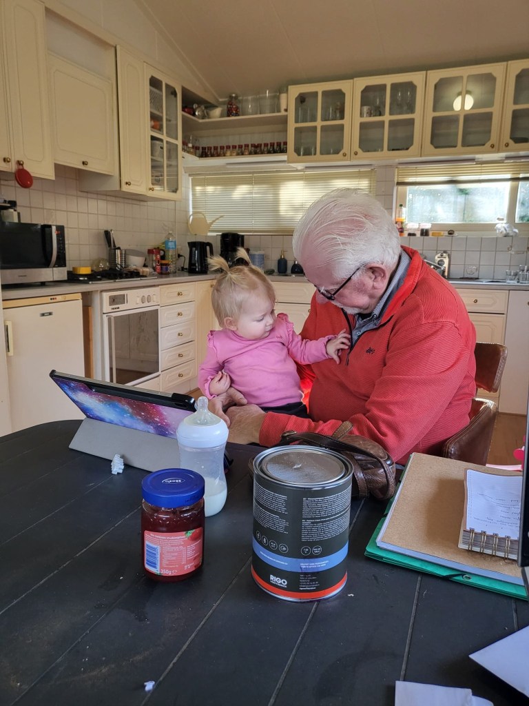 Klussen in Voorthuizen: Joyce had andere afspraken, dus trok ik er dinsdag alleen op uit om zoon Jeroen te helpen met schilderen. Op donderdag stond de nieuwe parketvloer geprogrammeerd, dus moesten de muren van huis- en zijkamer voor die dag nog even snel een tweede laag krijgen. Terwijl ik mij op de muren concentreerde, nam Jeroen de plafonds voor zijn rekening. Het resultaat mocht er zijn. Inmiddels ligt de vloer erin en kan er gewoond worden. Daarmee is het werk nog lang niet af. Komende dinsdag trekt klusteam Joop & Fritz weer gezamenlijk naar Voorthuizen voor het sauzen van de gang en de keuken. Daarna wacht nog de gehele verdieping (of eigenlijk souterrain) met slaapkamers, trappenhuis, hal en badkamer. Voorlopig nog even werk aan de winkel. Deze week na het schilderen nog even genoten van jongste kleinkind Tessa.