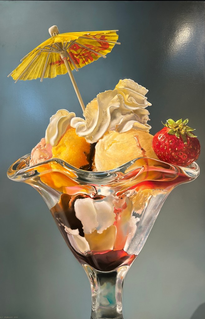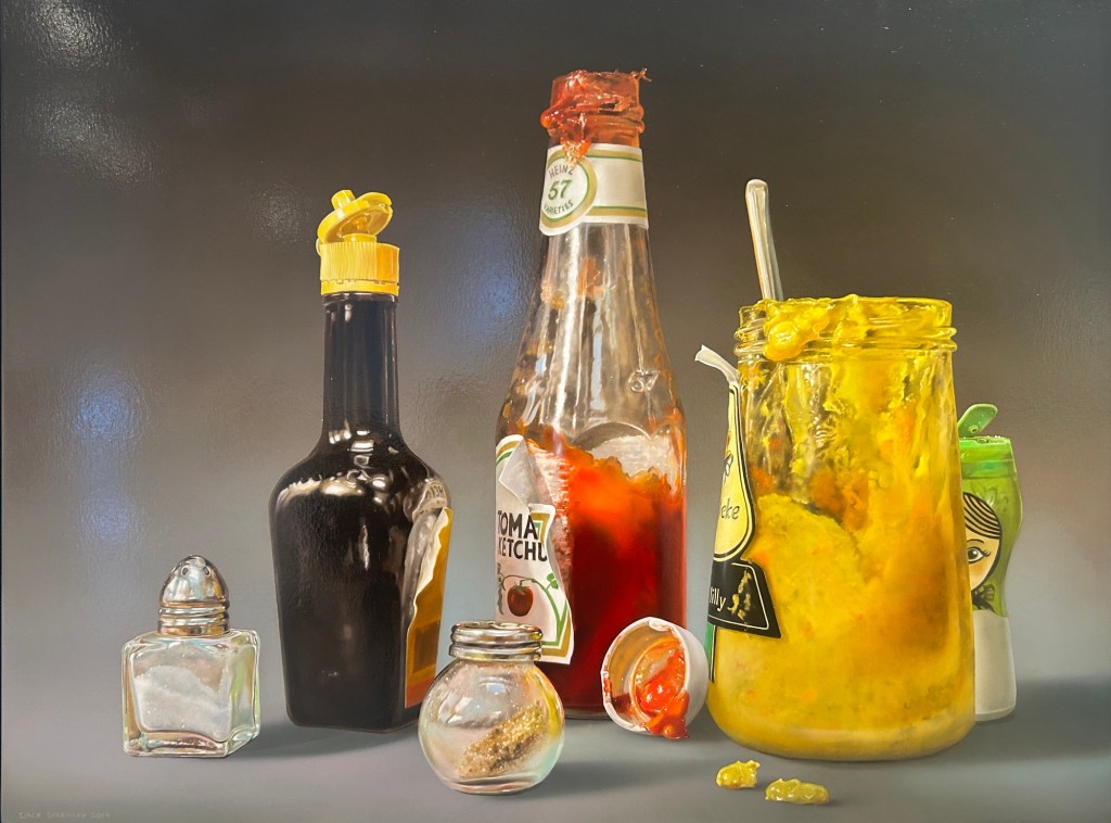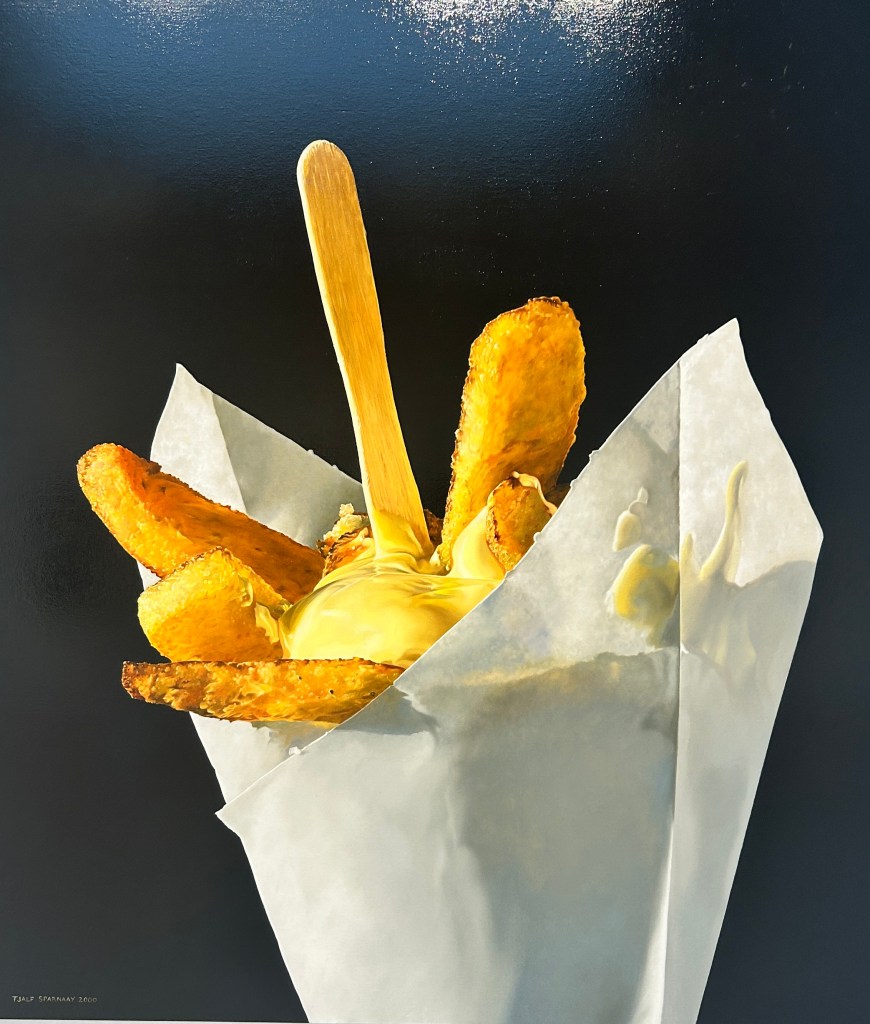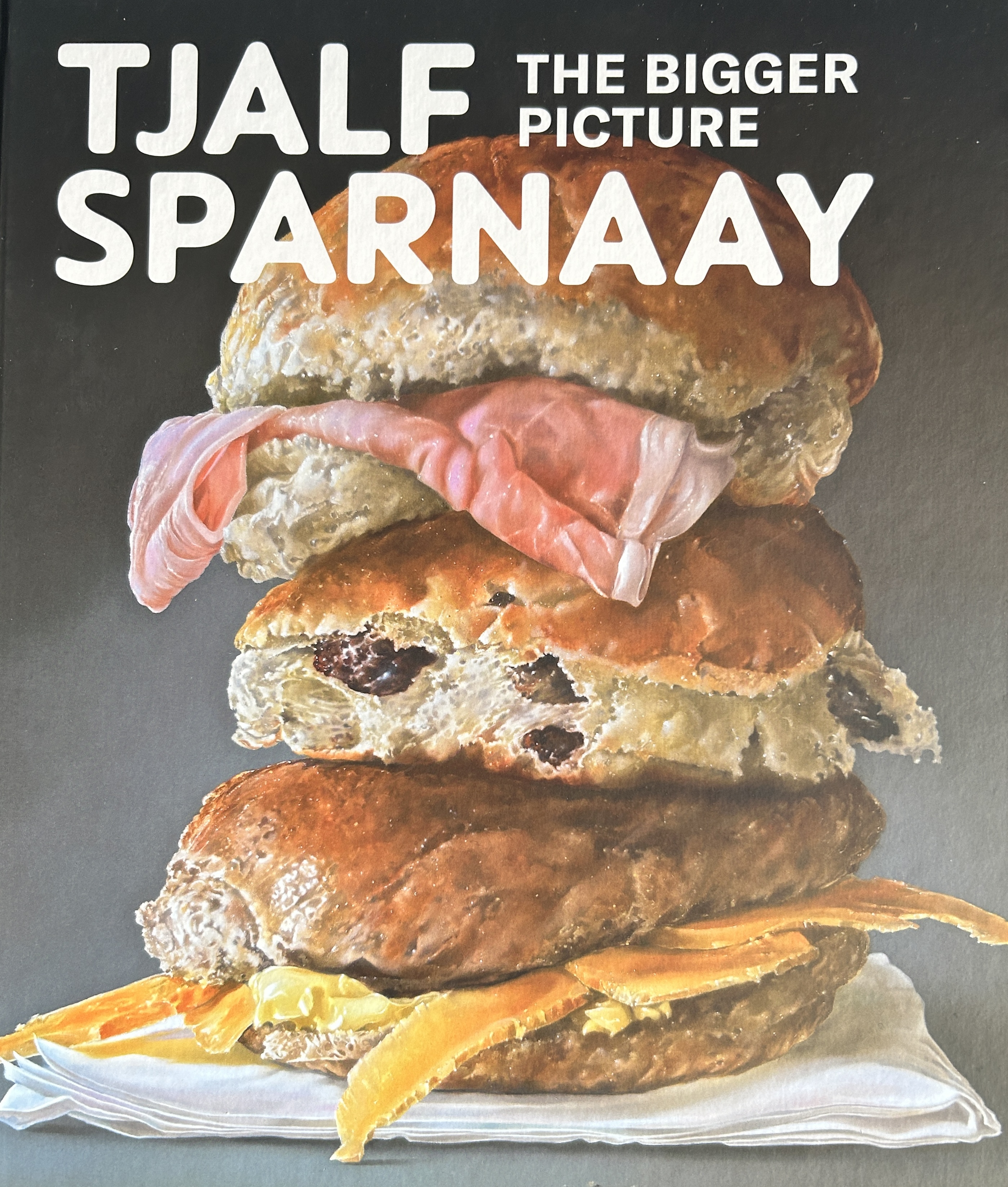 Tjalf Sparnaay: Wij hebben ons getrakteerd op een prachtig boek van kunstschilder Tjalf Sparnaay. Wij leerden het werk van Tjalf vijf jaar geleden kennen in Museum Jan in Amstelveen. Wij waren gelijk diep onder de indruk. Tjalf is een meesterschilder, vooral op het gebied van fotorealisme. Zijn schilderijen lijken op foto’s. Hij schildert met name over etenswaren, van zoutvaatjes tot ketchupflessen en van moorkoppen tot een zak patat met mayonaise.