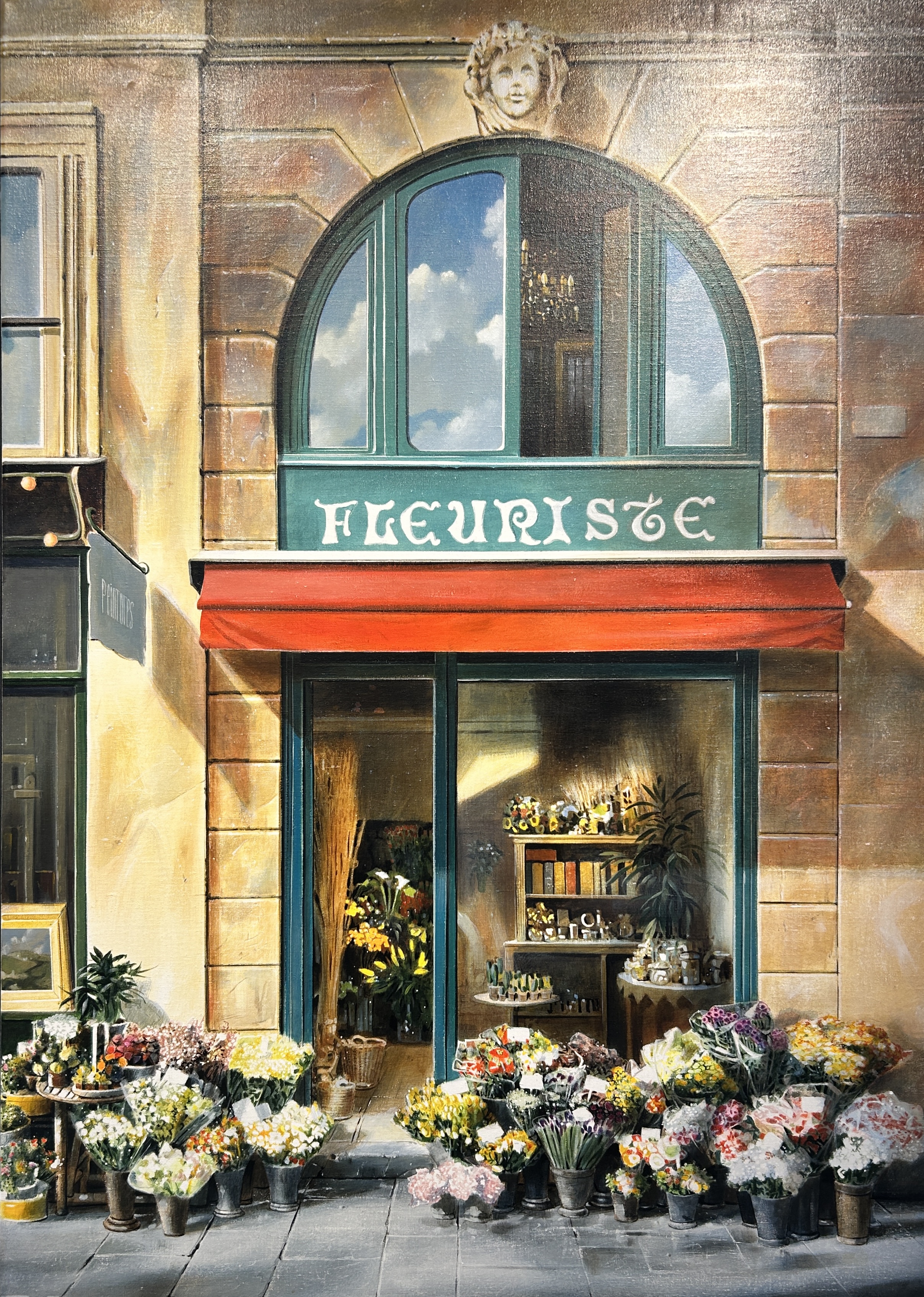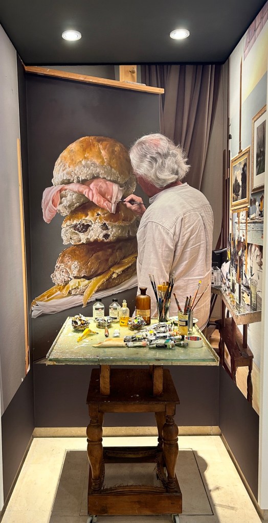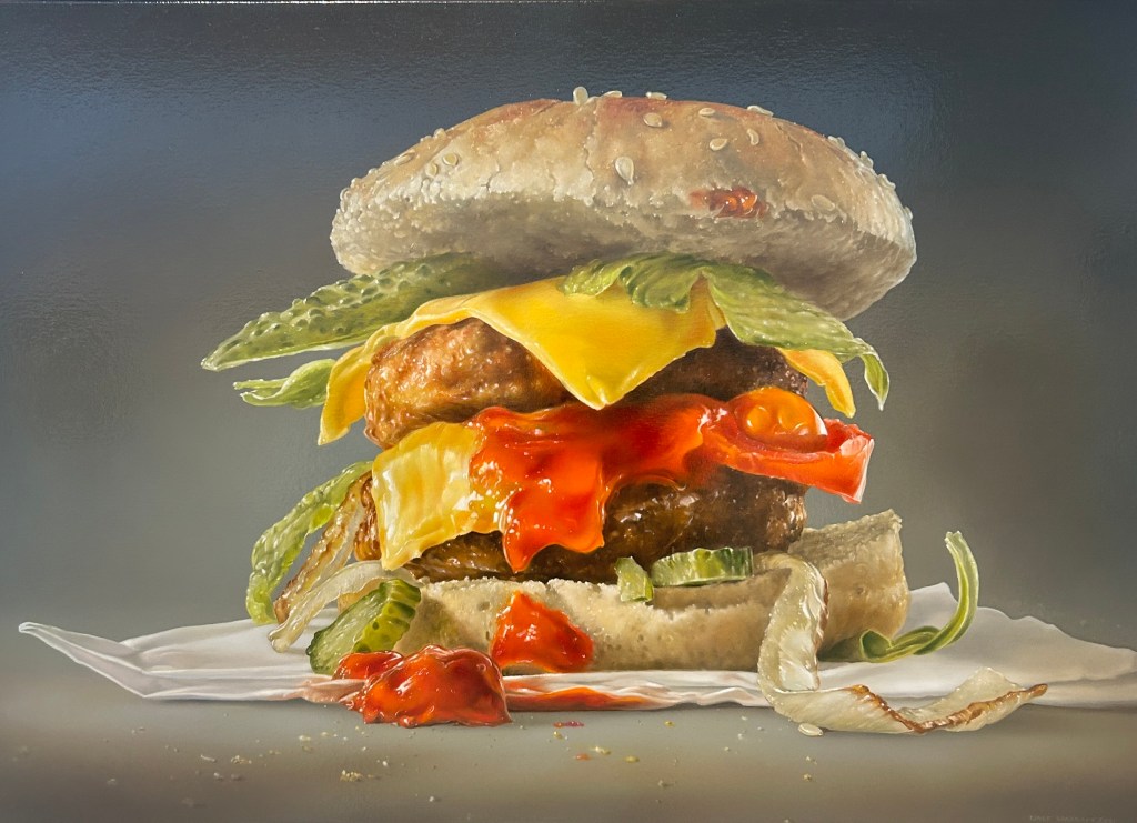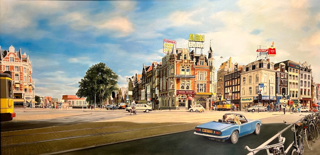 Tjalf kreeg op 12-jarige leeftijd een doosje olieverf en toog zonder enige kennis aan het schilderen. Binnen de kortste keren maakte hij schilderijen in de stijl van het impressionisme van de Haagse School. Hij vond het schilderen geweldig, maar koos toch voor de Academie voor Lichamelijke Opvoeding en werd gymleraar in Amsterdam. Maar hij gaf zich ook over aan wat hij het liefste deed, namelijk schilderen. Het werd een artistieke zoektocht om zijn eigen stijl te vinden. Hij kocht olieverf maar pakte ook zijn fototoestel om op straat te fotograferen. Met zijn lens registreerde hij de wereld. In zijn atelier schilderde hij landschappen in de stijl van Carel Willink. Daar zat echter niemand op te wachten. Vervolgens bracht hij schilderkunst en fotograferen samen door de typisch Amsterdamse straatbeelden die hij had gefotografeerd uit te vergroten en te schilderen. Daarnaast ontwierp hij zo’n 200 ansichtkaarten voor Art Unlimited. Tjalf fotografeerde ook etenswaren, zoals een boterham met hagelslag, een hamburger en bami met een gebakken eitje. Ondertussen werd Tjalf gegrepen door het boek ‘Photorealism’ van Louis K. Meisel. Dat boek zorgde ervoor dat hij het onderwijs verliet en definitief koos voor het schilderen. Hij begon een eigen galerie en hing er zijn schilderijen op met etenswaren. Voor de opening maakte hij voor de grap een schilderij van een gebakken ei. Het schilderij werd nog voor de opening van de galerie gekocht en ook al zijn andere schilderijen vlogen de deur uit. De rest is geschiedenis. Tjalf had zijn eigen stijl gevonden. Wanneer je in de buurt van Amstelveen bent, ga dan beslist even naar Museum Jan in het oude dorp van Amstelveen. De jubileumtentoonstelling ‘Tjalf Sparnaay: The bigger picture‘ over zijn 40-jarige carrière loopt tot 16 juni 2024. Ik weet zeker dat je het fantastisch vindt. En voor een paar tientjes heb je dat prachtig boek van bijna 200 pagina’s gevuld met zijn schilderijen.