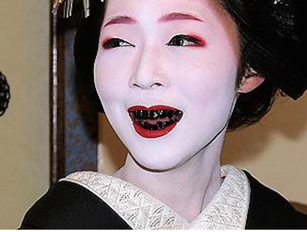 ‘Zwarte tanden: Behalve Tjalf Sparnaay exposeert ook Lisa Konno in Museum Jan. Zij combineert Japans porselein met textiel. Met haar werk reflecteert ze op schoonheidsidealen in zowel Japan als Nederland. De tentoonstelling laat een film zien waarbij Japanse vrouwen haar gewaden dragen en waarbij hun gebit zwart is gemaakt. Dat ‘triggerde’ mij, dus eens even gaan speuren. Wat blijkt? Een zwart gebit was het schoonheidsideaal voor getrouwde vrouwen en geisha’s (gezelschapsdames) in Japan. Het begon zo’n 800 na Christus en liep door tot de jaren 20. Dunne wenkbrauwen, een rood pruilmondje en een hagelwit gepoederde huid, zo zag de ideale vrouw eruit in het oude Japan. Omdat je tanden erg gelig bij zo’n witte toet afsteken, kun je ze maar beter zwart verven. Dat laat ook je witte huid beter uitkomen. Japanse vrouwen kleurden hun tanden zwart zodra ze het huwelijksbootje instapten. Voor de rijkere, tandenloze Japanse vrouw waren er zwarte protheses beschikbaar. Zwarte tanden stonden voor trouw. De Samoerai hadden in de eeuwen daarvoor dezelfde gewoonte. Ze maakten hun tanden zwart als teken van trouw aan hun meester. Ook meenden de Japanners dat het verven hun tanden beschermde. Of dat echt zo was, dat is de vraag. Maar ‘zwart’ camoufleerde rottende tanden in elk geval prima. Voor een zwart gebit moesten vrouwen hun mond spoelen met de kleurstof ‘Ohaguro’. Die werd gemaakt van stukken ijzer die in thee of sake werden gekweekt. Het ijzer ging oxideren, waardoor het water uiteindelijk zwart werd. Lekker was het spoelmiddel niet. Om de smaak wat te maskeren werden kruiden als kaneel of anijs toegevoegd. Na een paar behandelingen trok de zwarte kleur in het tandglazuur. Japanse vrouwen vinden nog steeds dat hun witte tanden te veel afsteken bij hun bleke gelaat. Mede hierom lachen Japanse dames vaak met hun handen voor de mond, zodat de tanden onzichtbaar blijven