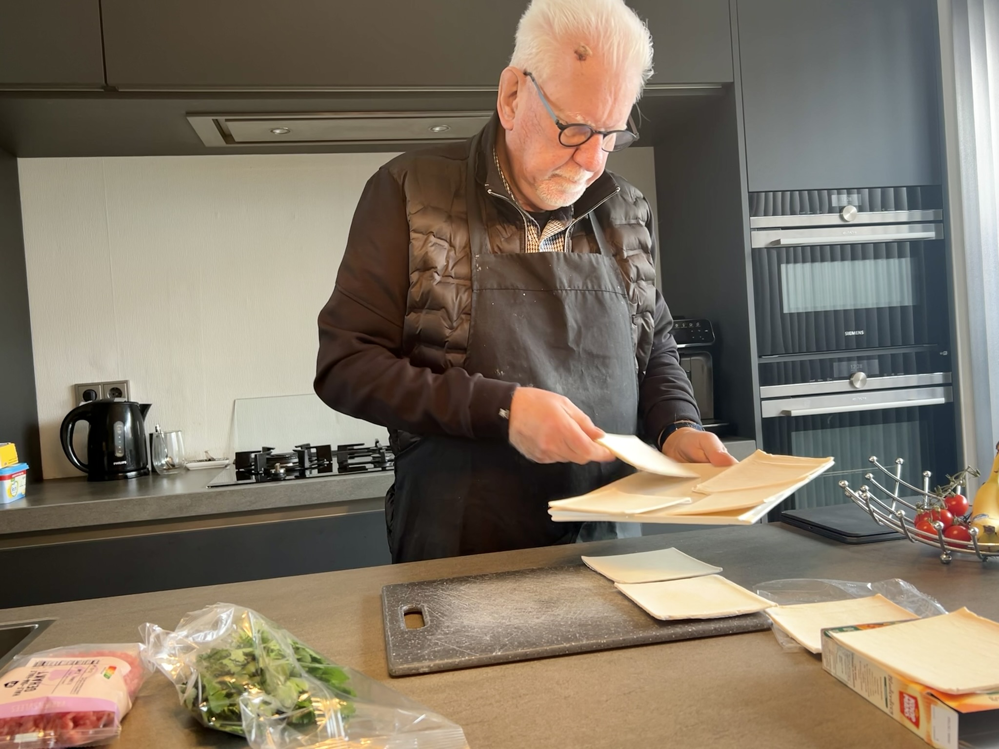 • 8 plakjes bladerdeeg/handje verse peterselie/2 teentjes knoflook/1 ei/300 gram half-om-half gehakt/1 snuf kaneel/2 tl paprikapoeder/flinke snuf zout en peper.