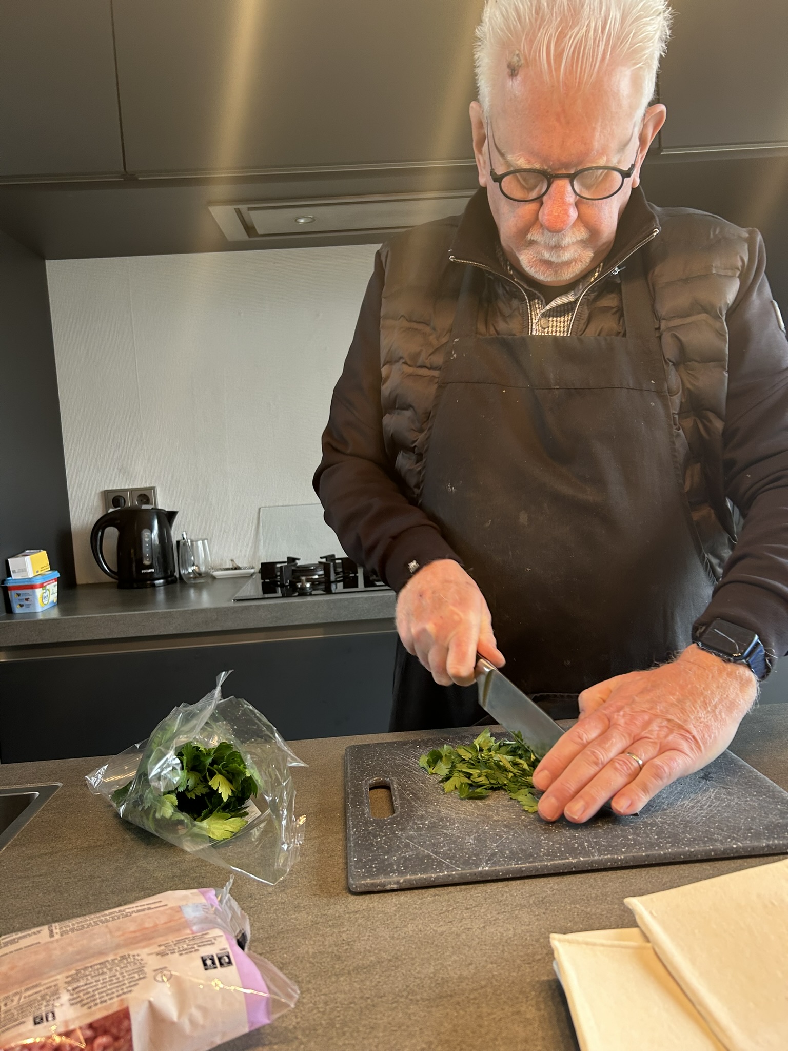 • Snijd de peterselie fijn, pel en pers de knoflook en klop het ei los in een kommetje;