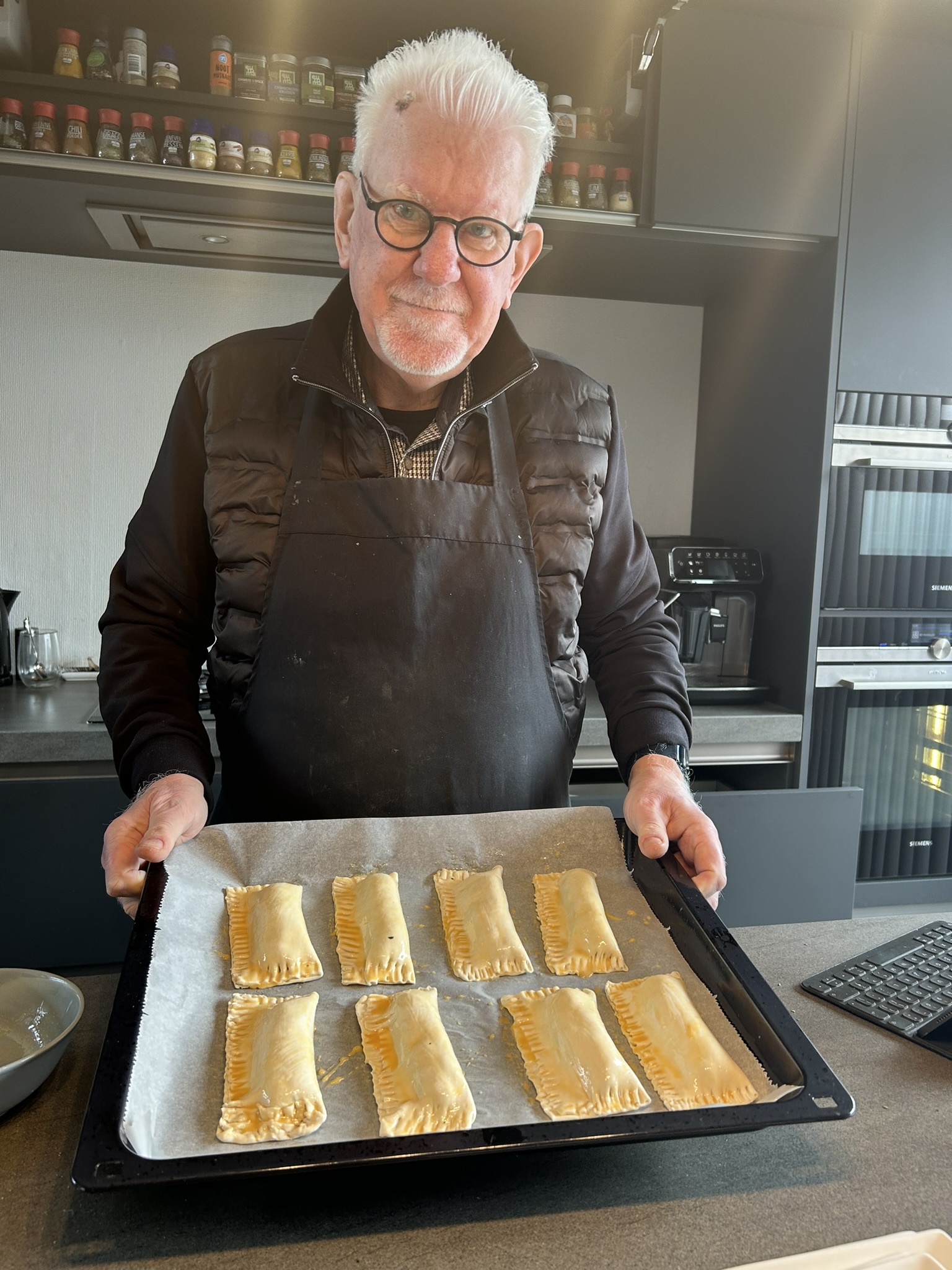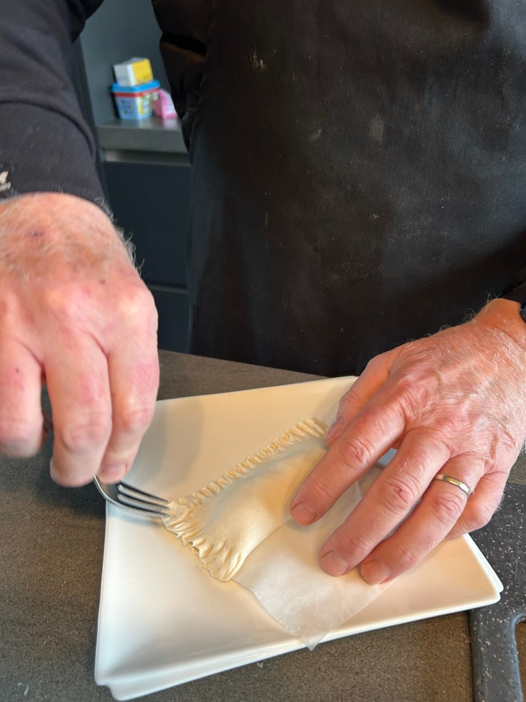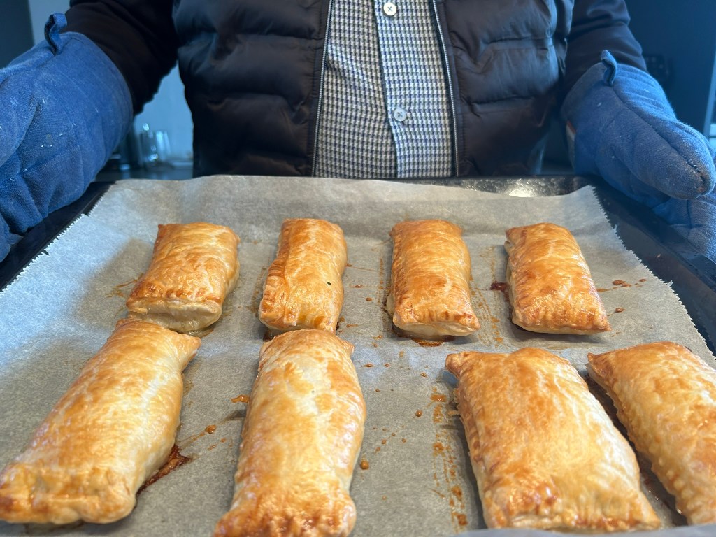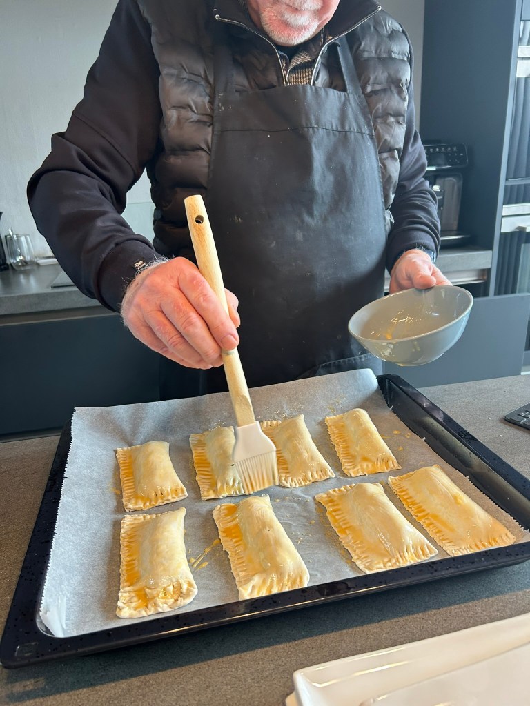 • Leg het gehakt op één helft van een plakje bladerdeeg en vouw de andere kant eroverheen; druk de randjes goed vast met een vork; maak zo acht pakketjes en leg ze op de bakplaat;