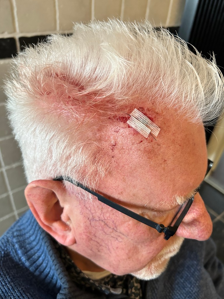 De volgende dag de pleisterberg verwijderd en hopla, het bloed gutste er weer uit. Omdat het niet stopte, vond Joyce het toch wel verstandig om naar de dokter te gaan. Die achtte een paar hechtingen onvermijdelijk. Er bleek toch een diep gat in mijn voorhoofd te zitten.