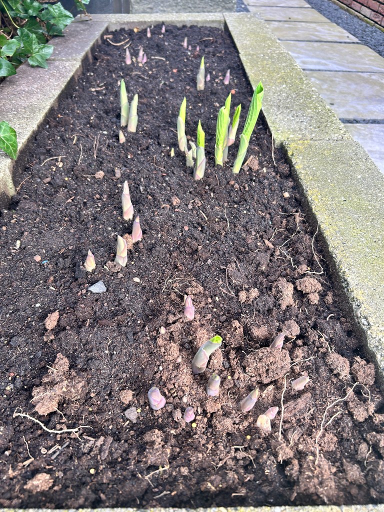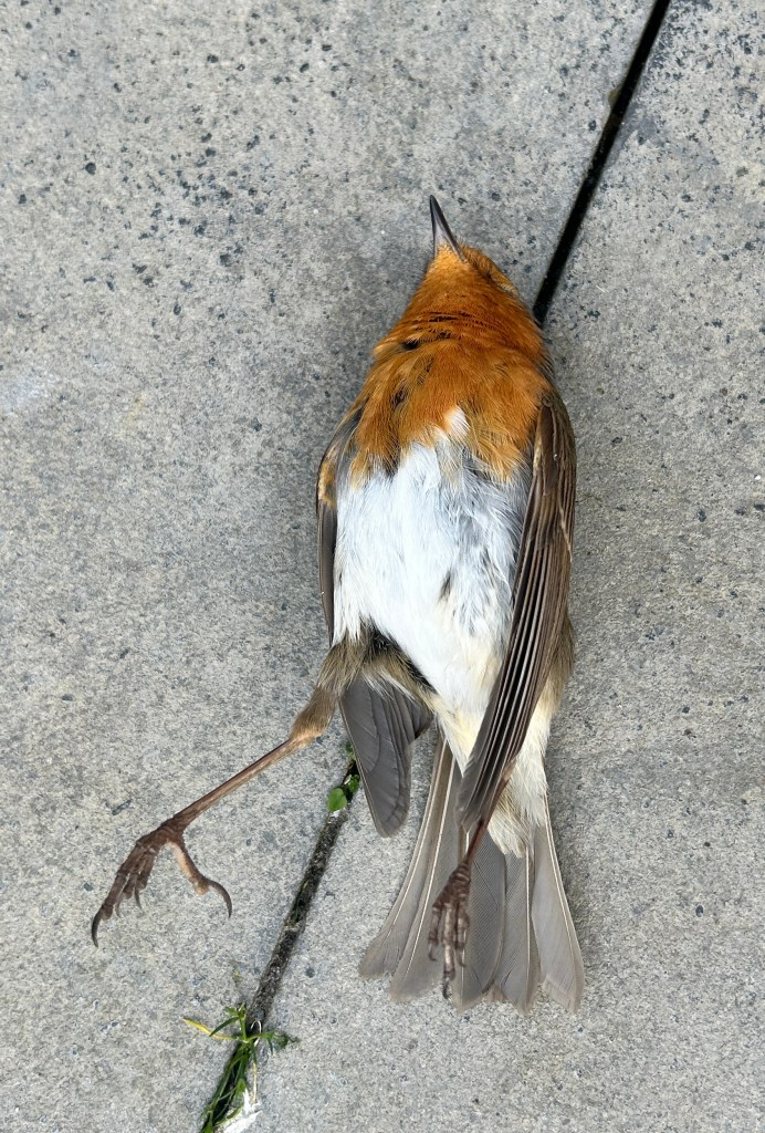 Leven en dood: Het zachte weer zorgt ervoor dat het groen begint uit te lopen. De hortensiaborder staat er frisgroen bij, de hortensia’s in de bakken krijgen zelfs al de eerste bloemen en de hosta schiet de grond uit. Helaas overleefde een vroeg voorjaar roodborstje zijn botsing met onze ramen niet.