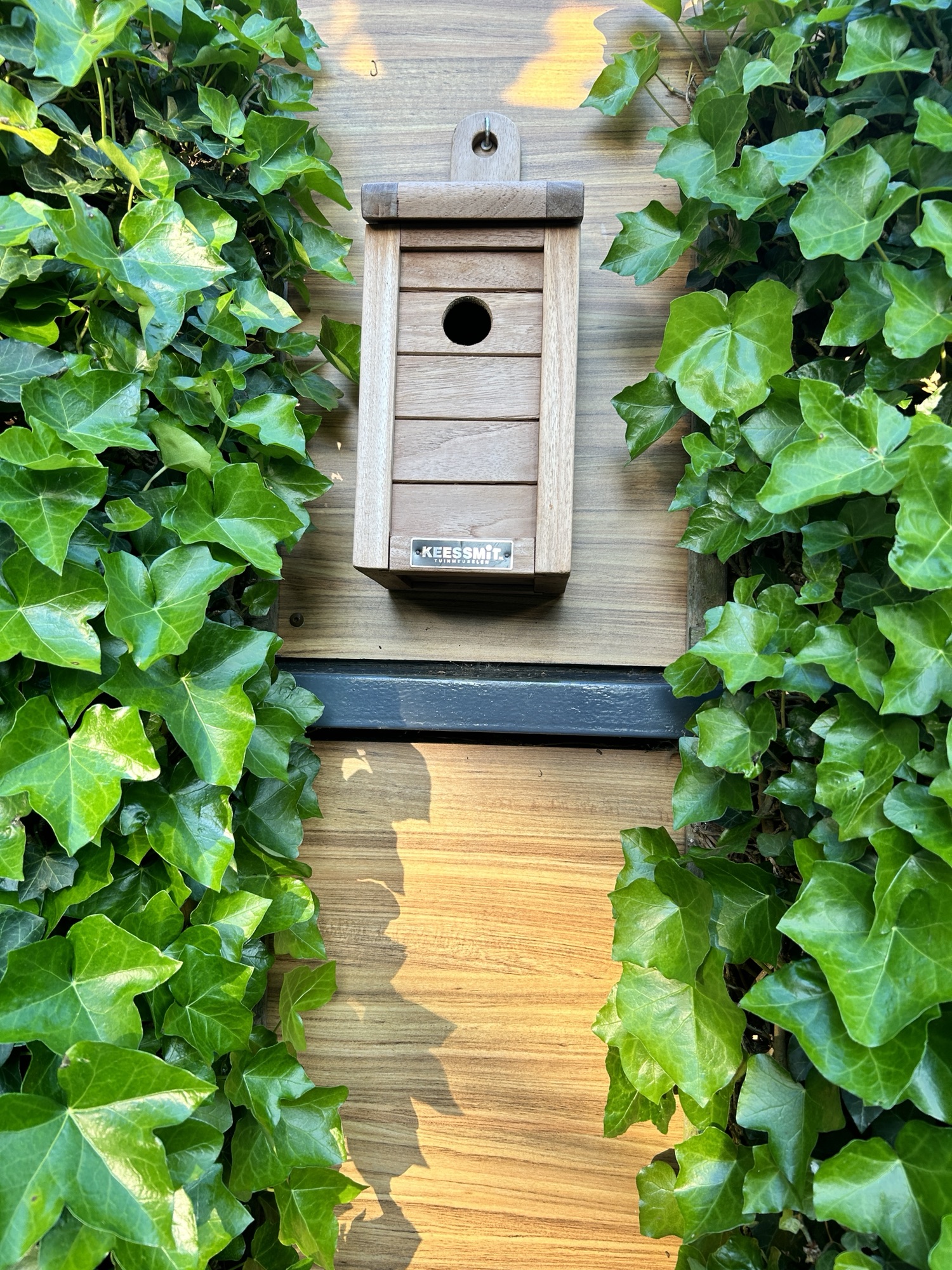 Vogelhuisje: Bij de aanschaf van onze tuinset vorig jaar kregen wij een mooi hardhouten vogelhuisje kado. Dat belandde in de schuur. Onlangs maar eens opgehangen in onze tuin. Beetje laat in het seizoen eigenlijk, maar je weet natuurlijk nooit. Tot onze verrassing werd het huisje deze week gekeurd door twee koolmezen. Helaas vonden zij het ingangsgat toch wat krap. Het bleken twee doe-het-zelvers, want met hun snavel probeerden zij het gat groter te maken. Het leken wel spechten, zo hard tikten zij tegen het hout. Helaas bleven hun pogingen zonder succes, dus vlogen zij weg. Zo jammer. Hoewel het gaatje precies de maat had voor koolmezen, toch maar een paar millimeter vergroot. Te groot is ook niet goed, omdat met name eksters dan hun kop naar binnen kunnen steken om de eieren leeg te lepelen. Inmiddels zijn er een paar nieuwe woningzoekers komen keuren, maar van het betrekken van de nieuwe woonstek is het nog niet gekomen. We blijven hopen.