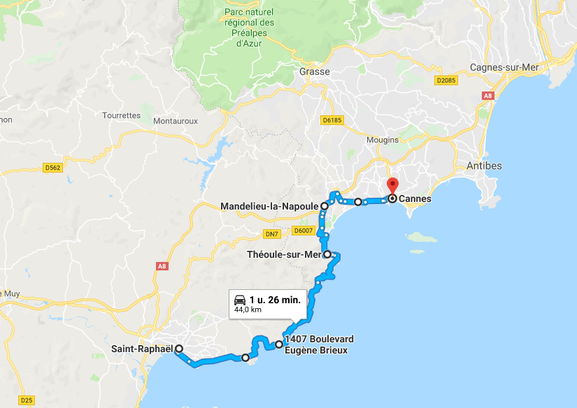 Cornische D’Or: Eén van de mooiste routes langs de Zuidkust is La Corniche D’Or, of wel La Corniche d’Estérel. Deze loopt vanuit Cannes via Mandelieu-la Napoule, Théoule-Sur-Mer en Dramont naar Saint Raphaël. Een 40 km lange route langs de Middellandse Zee kust en het roodbruine Estérel-gebergte.