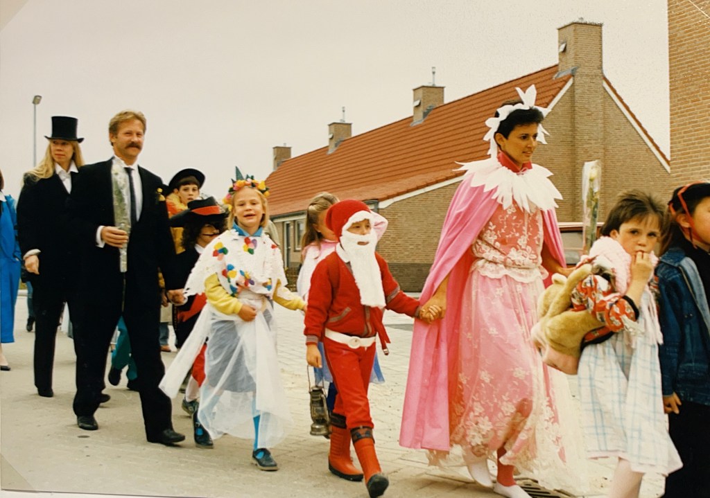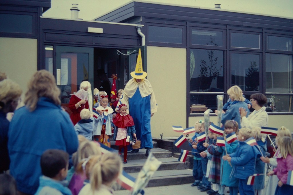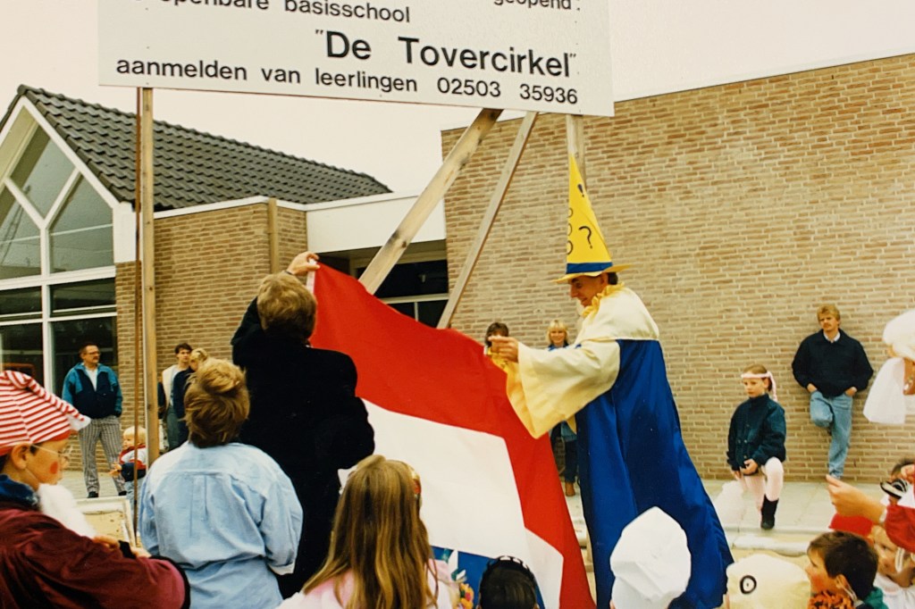 Tovercirkel: Ik werkte van 1974 tot 1987 als leerkracht bovenbouw op drie scholen. De eerste drie jaar in Zwanenburg op de Prins Bernhardschool, daarna tot 1985 in Hoofddorp op de Windwijzer en aansluitend in dezelfde plaats nog tot 1987 op De Bosrank. Op alle drie de scholen vervulde ik ook de rol van plaatsvervangend hoofd en later adjunct-directeur. Ik vroeg nooit om die rol, maar werd er iedere keer voor gevraagd. Waarschijnlijk omdat ik altijd wel betrokken was en wilde zijn bij organisatie en ontwikkeling binnen het team. Maar wat je ook bijdraagt, het straalt uiteindelijk af op de directeur. Dus wilde ik in die rol een eigen school leiden. Ik solliciteerde een aantal keer, maar eindigde telkens als tweede. Frustrerend, omdat de functie iedere keer om voor mij onbelangrijke redenen naar de ander ging. De eerste keer in Genemuiden, vond de inspecteur in de sollicitatiecommissie mijn handschrift niet methodisch genoeg. (een sollicitatiebrief schreef je toen nog met vulpen). In Reusel werd ik te jong bevonden. In Den Ilp zag men mij meer als leider van een grote school. In Almere had men liever iemand uit de eigen omgeving. Net toen ik het op wilde geven, werd ik door mijn eigen bestuur benaderd om mee te solliciteren voor die baan op een nieuw te bouwen school in Hoofddorp. Ook hier kwam het dus weer vanzelf op mijn pad. Ik doorliep de procedure vrij gemakkelijk en de rest is geschiedenis. Het was echt leuk om vanaf de eerste bouwtekening mee te mogen denken met de architecten. Het wordt dan toch een beetje jouw gebouw. De naam kwam ook uit mijn koker. Dat werd Tovercirkel, omdat ik het onderwijs aan kinderen toch wel enige magie vond hebben. Na een jaar bouwen en drie maanden noodgebouw startten wij in 1987 dan echt op de nieuwe locatie. In een lang lint wandelden wij, verkleed als sprookjesfiguren, van nood-locatie naar nieuwbouw. Een mijlpaal in mijn werkzame leven en dat van Joyce. Wij zouden er 16 jaar doorbrengen. Achteraf gezien was het misschien wel mijn mooiste tijd en had ik er nooit weg moeten gaan. Vooral omdat ik het gebouw niet hoefde te delen met andere scholen, zoals later in Nieuw Vennep wel het geval was. Daardoor was er ook minder concurrentie en meer rust. De Tovercirkel bestaat inmiddels 37 jaar en directeur nummer vijf (na mij), treedt binnenkort aan. Het is een duiventil geworden waar niemand het kennelijk langer dan vijf jaar volhoudt. Hierbij wat plaatjes uit die tijd. En ook hier droeg ik, net als later op mijn volgende nieuwe school Merlijn, al een tovenaarsmantel. Joyce herken je als toverfee.