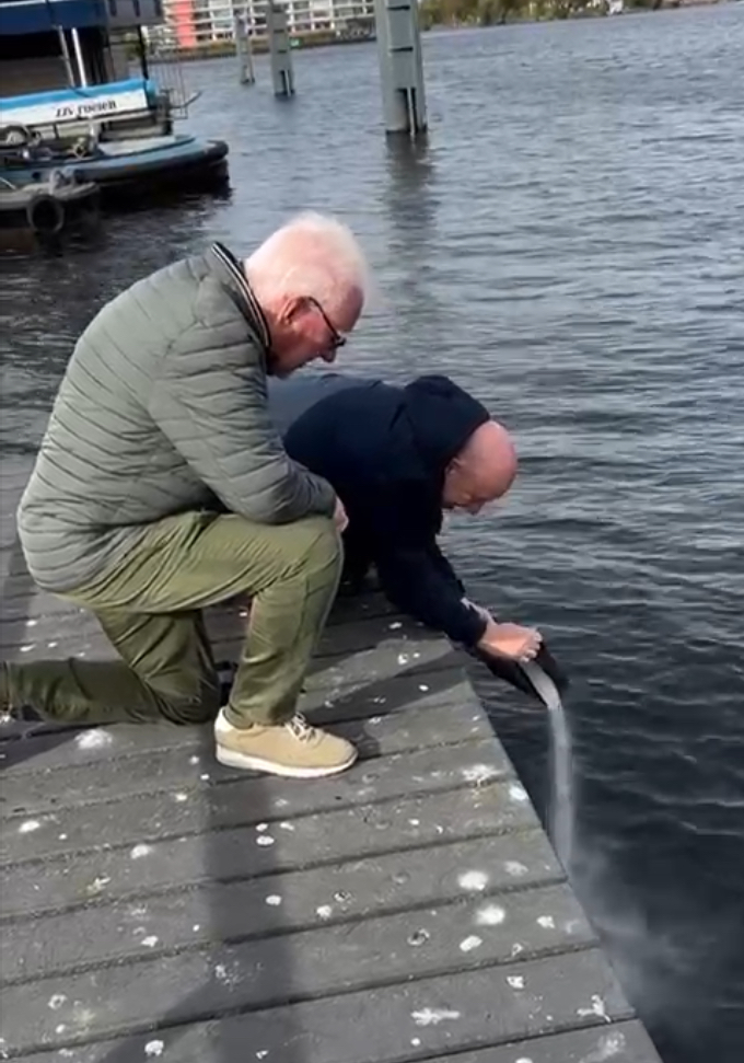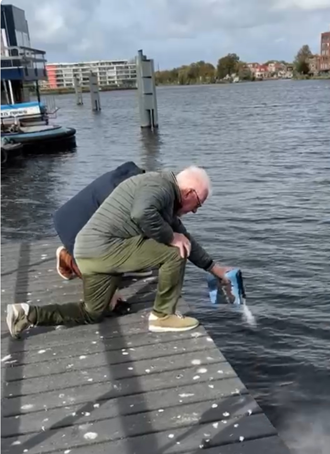 Goed, weer terug naar de as. Afgelopen zomer heb ik mijn geboorteplaats Zaandam weer eens per fiets doorkruist op zoek naar alle plekjes uit mijn jeugd. Verder heb ik de Zaan ter hoogte van het Vissershop aan beide zijden afgespeurd naar een geschikte plek voor het verstrooien van de as. Zoiets is natuurlijk niet helemaal of eigenlijk helemaal niet legaal, maar het gebeurt erg vaak tegenwoordig. Je wilt dan toch een beetje uit het zicht van bewoners en voorbijgangers blijven. Je wilt ook niet dat de as meteen tegen de oevers komt te liggen. Een bootje zou dus uitkomst bieden. Maar waar vind je dat zo snel? Ik zag een kleine sloep liggen pal naast de plek waar mijn vader als kind gewoond had. Dus besloot ik de eigenaar aan te spreken en mijn bijzondere verzoek aan hem te doen. Tot mijn verrassing kende de oude man mijn vader nog uit zijn jeugd. Hij was te porren voor het idee zijn boot beschikbaar te stellen om de as midden op de Zaan te verstrooien. Wij spraken een datum af. Pal voor deze datum overleed echter de schoonvader van mijn broer, wat uitstel betekende. Toen ik de botenman belde voor een nieuwe afspraak werd de man boos op mij. Hij had zich enorm verheugd (?) op het verstrooien en ik verstoorde zijn pretje. Tja, onze lieve heer heeft soms rare kostgangers. Gelukkig heb ik altijd een plan B. Ik had tijdens mijn verkenningstocht een paar alternatieven in kaart gebracht, waaronder een aanlegsteiger die een flink stuk uit de oever lag. Precies tegenover het Vissershop. Daar gaven wij mijn vader ‘zijn vrijheid’ terug. Gelukkig stond de wind de goede kant op. Na afloop hebben wij in het centrum van Zaandam zijn leven gevierd met een hapje en een drankje. Vergeef ons de blije gezichten bij deze ‘soort van plechtige’ activiteit.