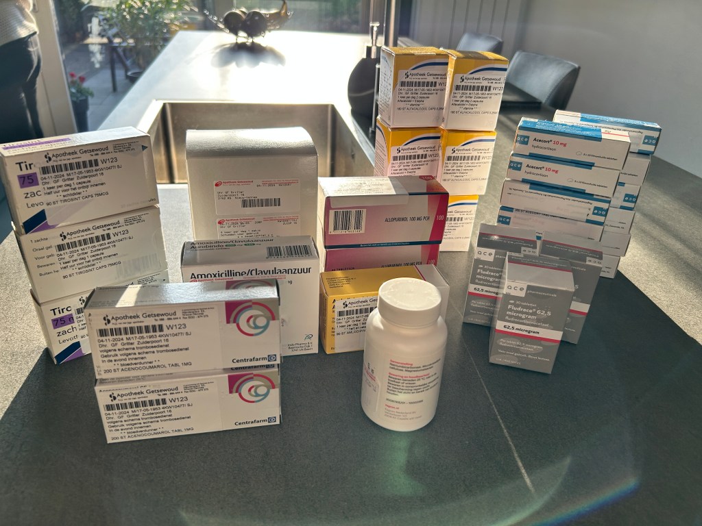 Pillen: Ik slik nogal wat pillen. Het begon 25 jaar geleden met eentje, maar naarmate sommige organen minder goed functioneren, dan wel verwijderd zijn, groeit het aantal stug door. Vroeger verbaasde ik mij erover hoeveel pillen mijn moeder slikte, maar inmiddels voel ik mij haar gelijke. Qua pillen dan. Er gaan de hele dag de nodige wekkers om mij eraan te herinneren dat het weer pillentijd is. Deze week maar weer een goed gevulde zak opgehaald bij mijn apotheek. Het zijn er lachwekkend veel en dan is dit nog niet eens alles. Ik kan voorlopig weer een paar maanden vooruit.