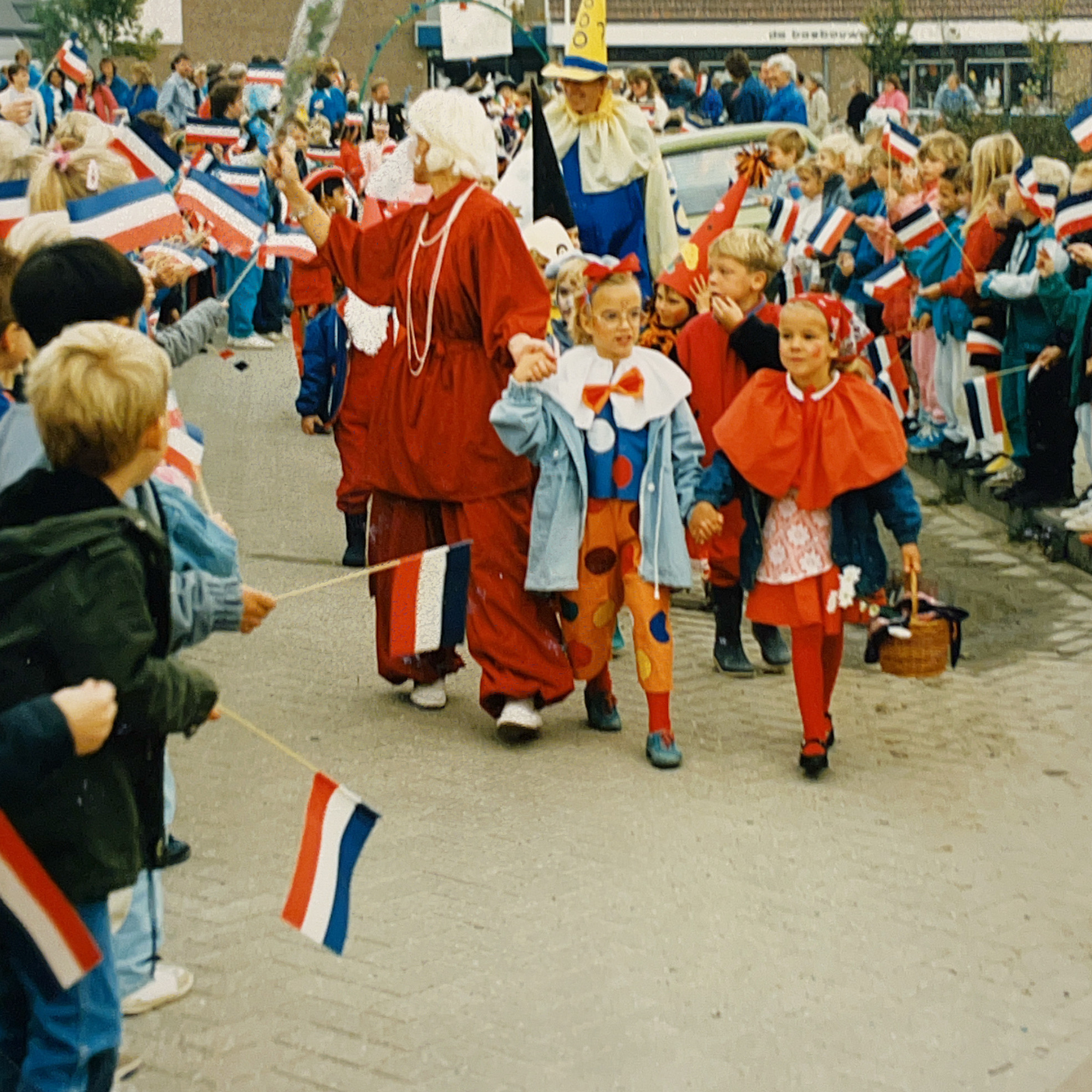 Tovercirkel: Ik werkte van 1974 tot 1987 als leerkracht bovenbouw op drie scholen. De eerste drie jaar in Zwanenburg op de Prins Bernhardschool, daarna tot 1985 in Hoofddorp op de Windwijzer en aansluitend in dezelfde plaats nog tot 1987 op De Bosrank. Op alle drie de scholen vervulde ik ook de rol van plaatsvervangend hoofd en later adjunct-directeur. Ik vroeg nooit om die rol, maar werd er iedere keer voor gevraagd. Waarschijnlijk omdat ik altijd wel betrokken was en wilde zijn bij organisatie en ontwikkeling binnen het team. Maar wat je ook bijdraagt, het straalt uiteindelijk af op de directeur. Dus wilde ik in die rol een eigen school leiden. Ik solliciteerde een aantal keer, maar eindigde telkens als tweede. Frustrerend, omdat de functie iedere keer om voor mij onbelangrijke redenen naar de ander ging. De eerste keer in Genemuiden, vond de inspecteur in de sollicitatiecommissie mijn handschrift niet methodisch genoeg. (een sollicitatiebrief schreef je toen nog met vulpen). In Reusel werd ik te jong bevonden. In Den Ilp zag men mij meer als leider van een grote school. In Almere had men liever iemand uit de eigen omgeving. Net toen ik het op wilde geven, werd ik door mijn eigen bestuur benaderd om mee te solliciteren voor die baan op een nieuw te bouwen school in Hoofddorp. Ook hier kwam het dus weer vanzelf op mijn pad. Ik doorliep de procedure vrij gemakkelijk en de rest is geschiedenis. Het was echt leuk om vanaf de eerste bouwtekening mee te mogen denken met de architecten. Het wordt dan toch een beetje jouw gebouw. De naam kwam ook uit mijn koker. Dat werd Tovercirkel, omdat ik het onderwijs aan kinderen toch wel enige magie vond hebben. Na een jaar bouwen en drie maanden noodgebouw startten wij in 1987 dan echt op de nieuwe locatie. In een lang lint wandelden wij, verkleed als sprookjesfiguren, van nood-locatie naar nieuwbouw. Een mijlpaal in mijn werkzame leven en dat van Joyce. Wij zouden er 16 jaar doorbrengen. Achteraf gezien was het misschien wel mijn mooiste tijd en had ik er nooit weg moeten gaan. Vooral omdat ik het gebouw niet hoefde te delen met andere scholen, zoals later in Nieuw Vennep wel het geval was. Daardoor was er ook minder concurrentie en meer rust. De Tovercirkel bestaat inmiddels 37 jaar en directeur nummer vijf (na mij), treedt binnenkort aan. Het is een duiventil geworden waar niemand het kennelijk langer dan vijf jaar volhoudt. Hierbij wat plaatjes uit die tijd. En ook hier droeg ik, net als later op mijn volgende nieuwe school Merlijn, al een tovenaarsmantel. Joyce herken je als toverfee.