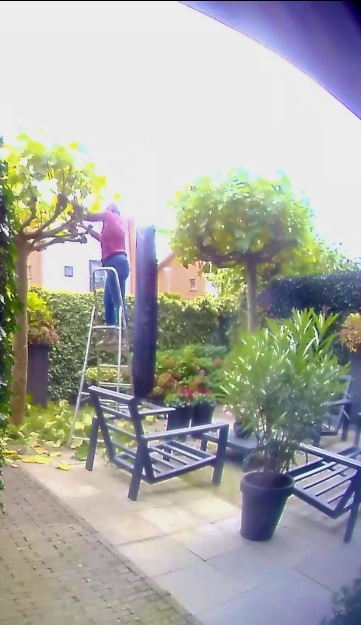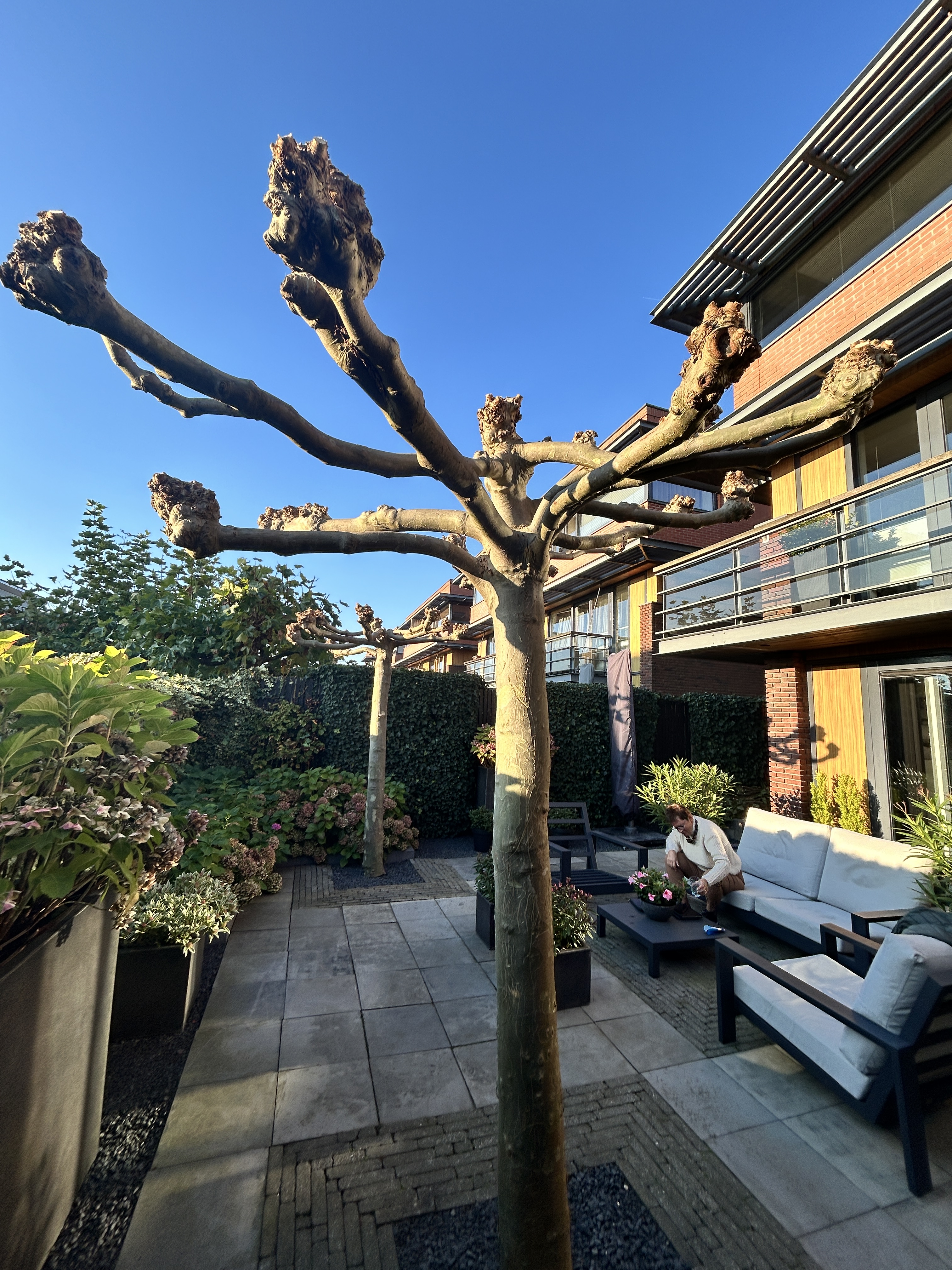 De bomen zijn weer geknot: Was het vorige maand nog nodig onze dak-platanen te toppen, nu moesten ze geknot worden. Op advies van een tuinman doen wij dat altijd net voor de bladval. Het voorkomt dat de tuin wordt bedolven met bladeren. Al 20 jaar klim ik er voor op mijn laddertje, maar deze 21e keer nam Joyce de snoeischaar over. Niet alleen omdat ze mij wilde ontlasten, maar ook omdat ze het als een leuke taak zag, die ze ook wilde leren. En zo raak ik weer een taak en wat eigenwaarde kwijt (snif), maar wel lief van mijn stoere tuinvrouw.