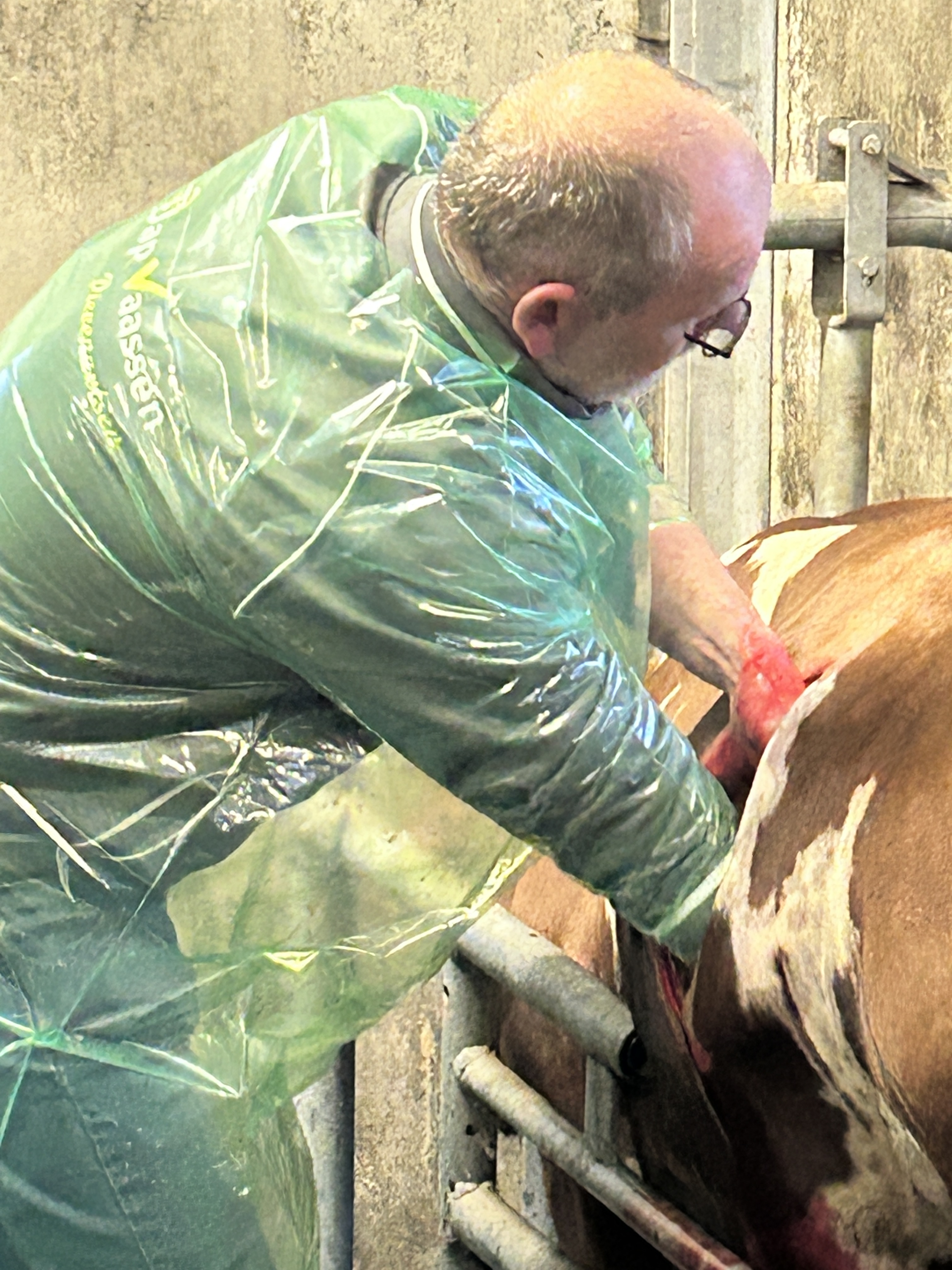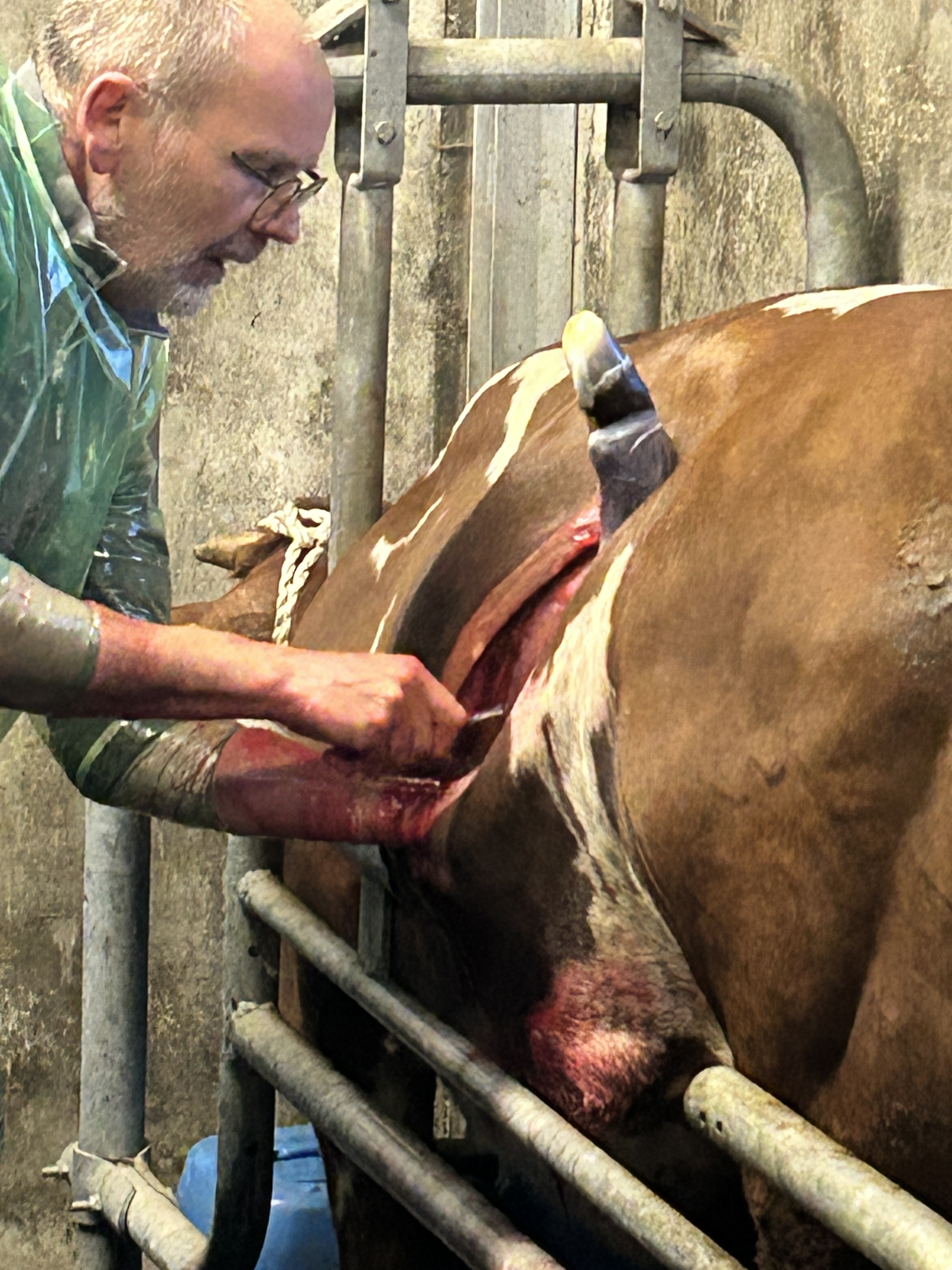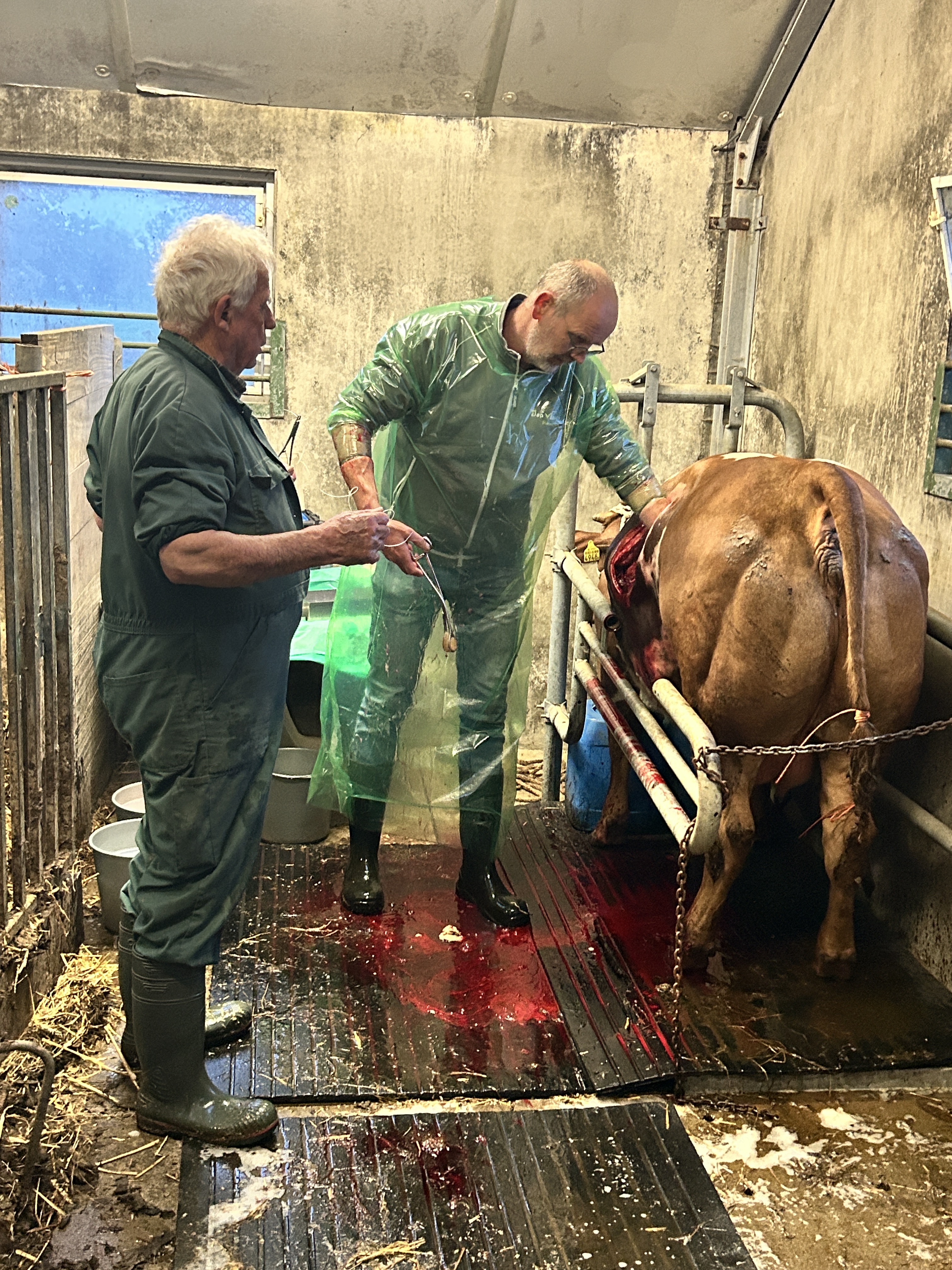 Keizersnee: de eerste avond van ons verblijf viel precies samen met een bevalling op de boerderij. Henk heeft zo’n 35 dikbil-koeien en een paar daarvan bleken op dat moment hoogzwanger. Eentje stond op het punt van bevallen. Dikbil vee bevalt bijna nooit op de natuurlijke manier. Door hun dikke billen is er te weinig ruimte voor de geboorte van een kalf. De dierenarts biedt dan hulp middels een keizersnee. De betreffende dierenarts bleek een vrolijke man die mij stap voor stap uitlegde wat hij deed. Eerst scheren, daarna een hele fles verdoving inspuiten en dan snijden door de huid, spierlaag en vliezen. De snee wordt precies achter de maag gemaakt, zodat de pens als een soort buffer het inwendige van de koe op zijn plaats houdt. En dan is het gewoon de armen in de koe steken en aan de poten van het kalf trekken. Binnen een paar minuten ligt het kalf op de grond en wordt de opening gehecht. Het is een prachtige ervaring geweest. Hieronder wat plaatjes en een filmpje van de geboorte..