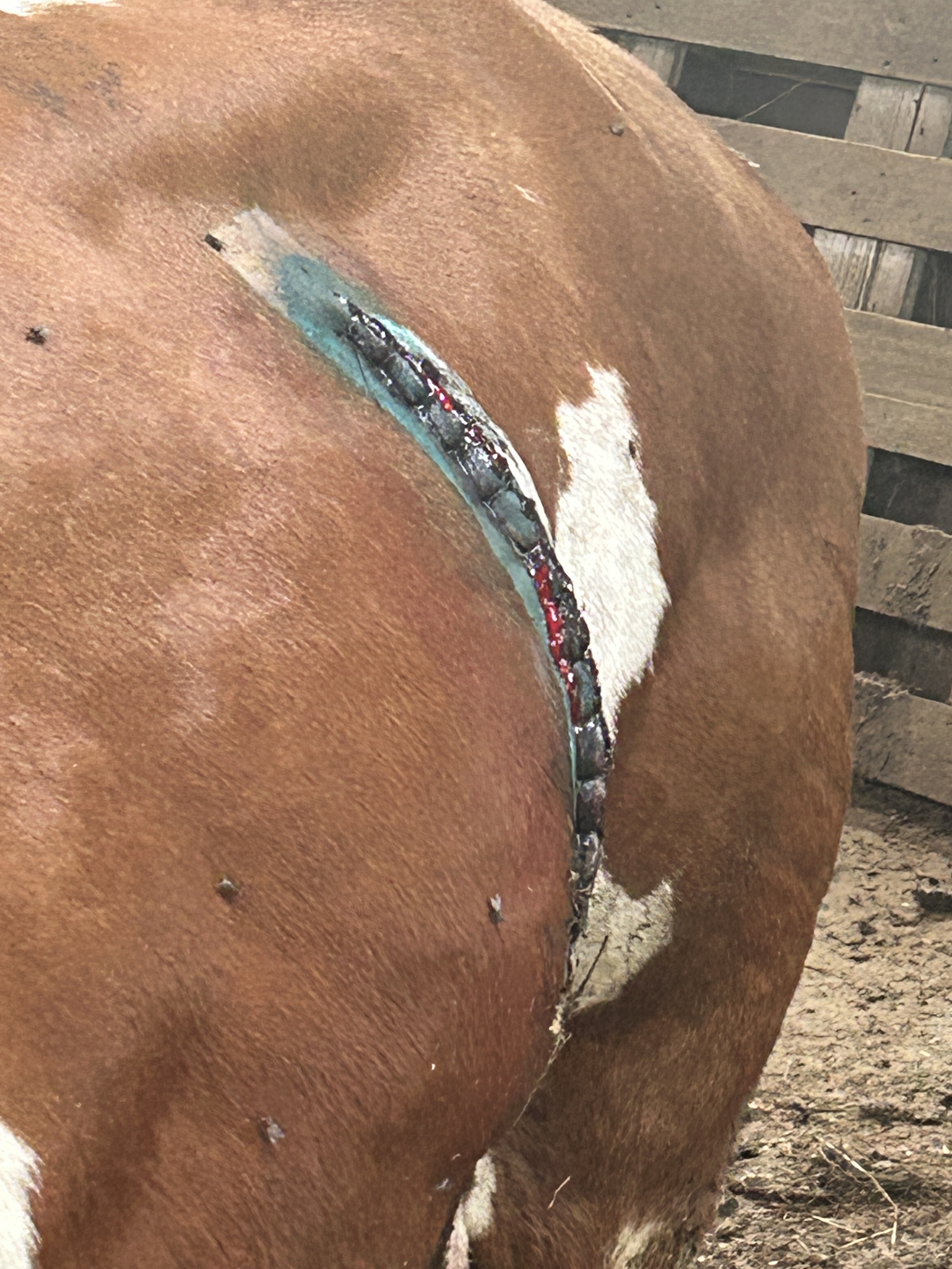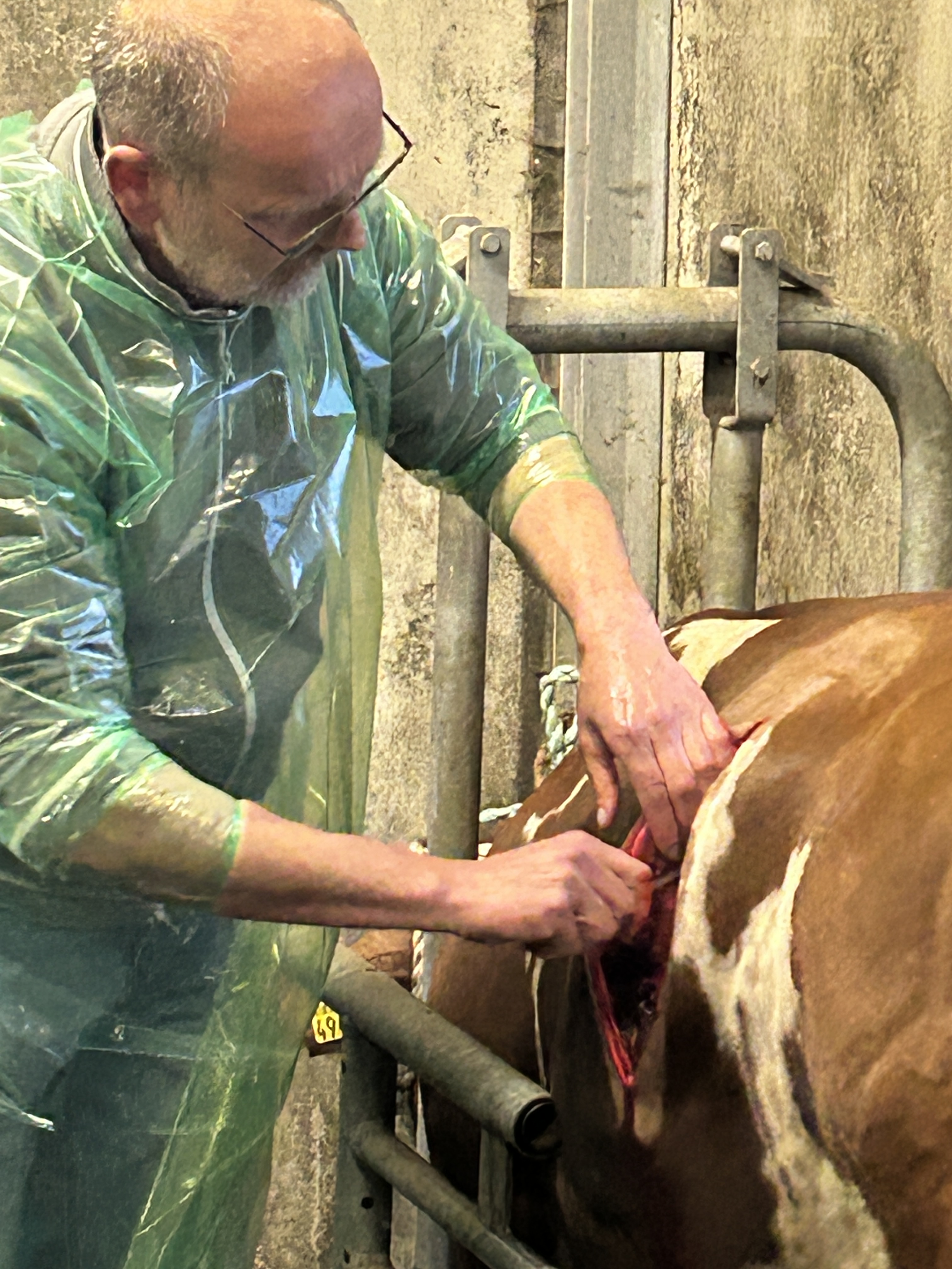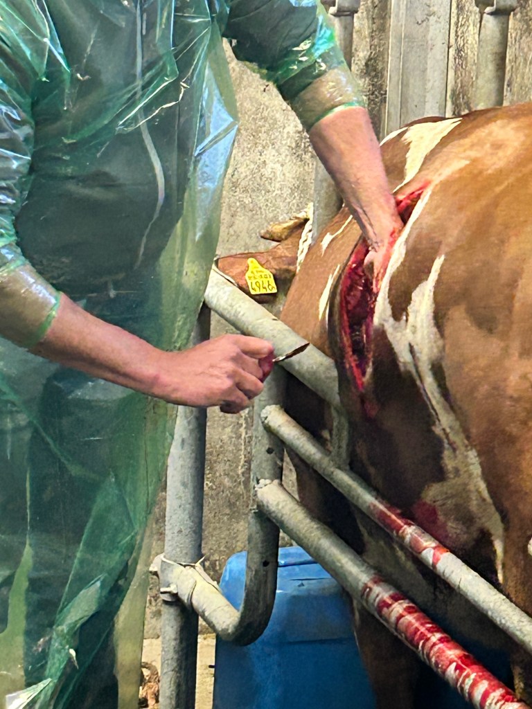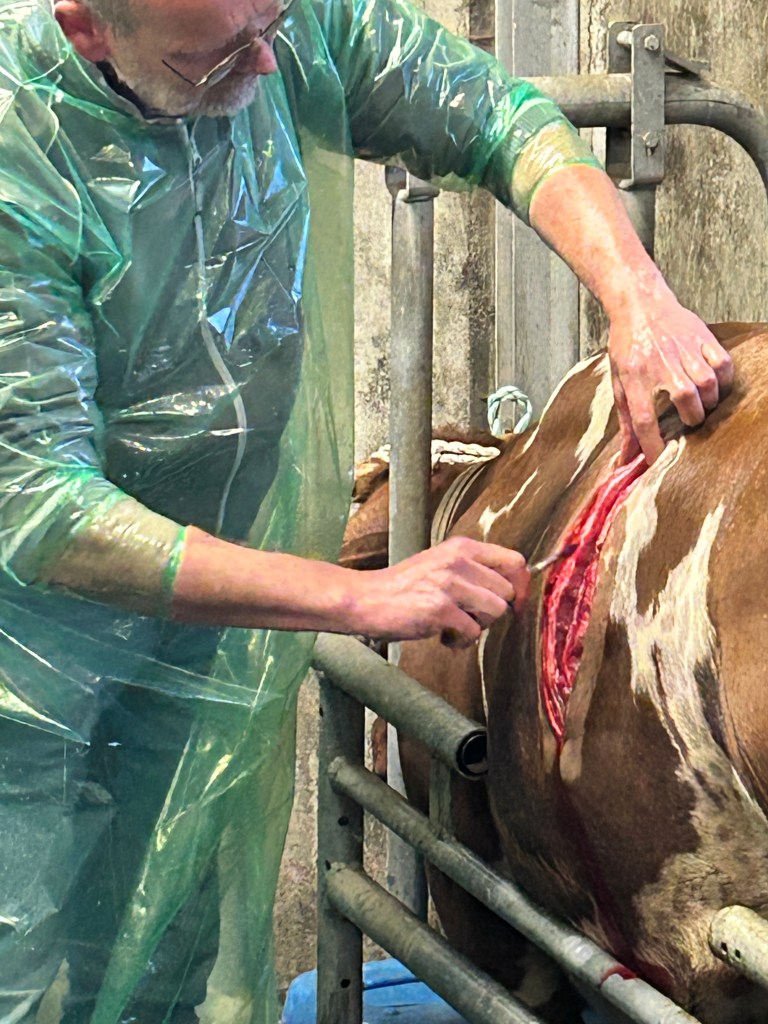 Keizersnee: de eerste avond van ons verblijf viel precies samen met een bevalling op de boerderij. Henk heeft zo’n 35 dikbil-koeien en een paar daarvan bleken op dat moment hoogzwanger. Eentje stond op het punt van bevallen. Dikbil vee bevalt bijna nooit op de natuurlijke manier. Door hun dikke billen is er te weinig ruimte voor de geboorte van een kalf. De dierenarts biedt dan hulp middels een keizersnee. De betreffende dierenarts bleek een vrolijke man die mij stap voor stap uitlegde wat hij deed. Eerst scheren, daarna een hele fles verdoving inspuiten en dan snijden door de huid, spierlaag en vliezen. De snee wordt precies achter de maag gemaakt, zodat de pens als een soort buffer het inwendige van de koe op zijn plaats houdt. En dan is het gewoon de armen in de koe steken en aan de poten van het kalf trekken. Binnen een paar minuten ligt het kalf op de grond en wordt de opening gehecht. Het is een prachtige ervaring geweest. Hieronder wat plaatjes en een filmpje van de geboorte..